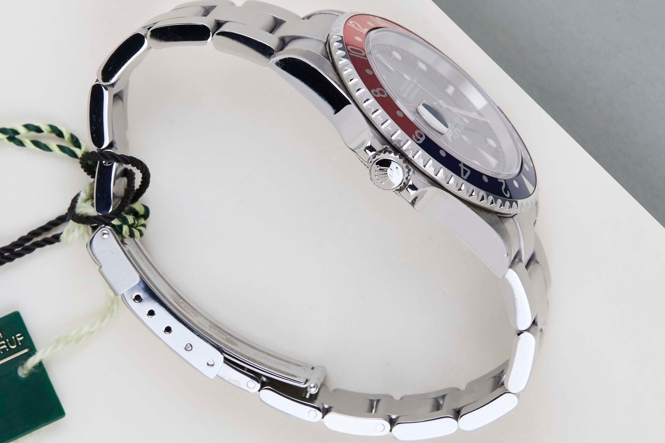 Diese Rolex GMT-Master II ist in neuwertigem Zustand und wird mit den originalen Rolex Garantiedokumenten und der Box geliefert. Darüber hinaus wurde die Uhr von unserem Uhrmacher gewartet und kommt daher mit einem Jahr Steiner Garantie.