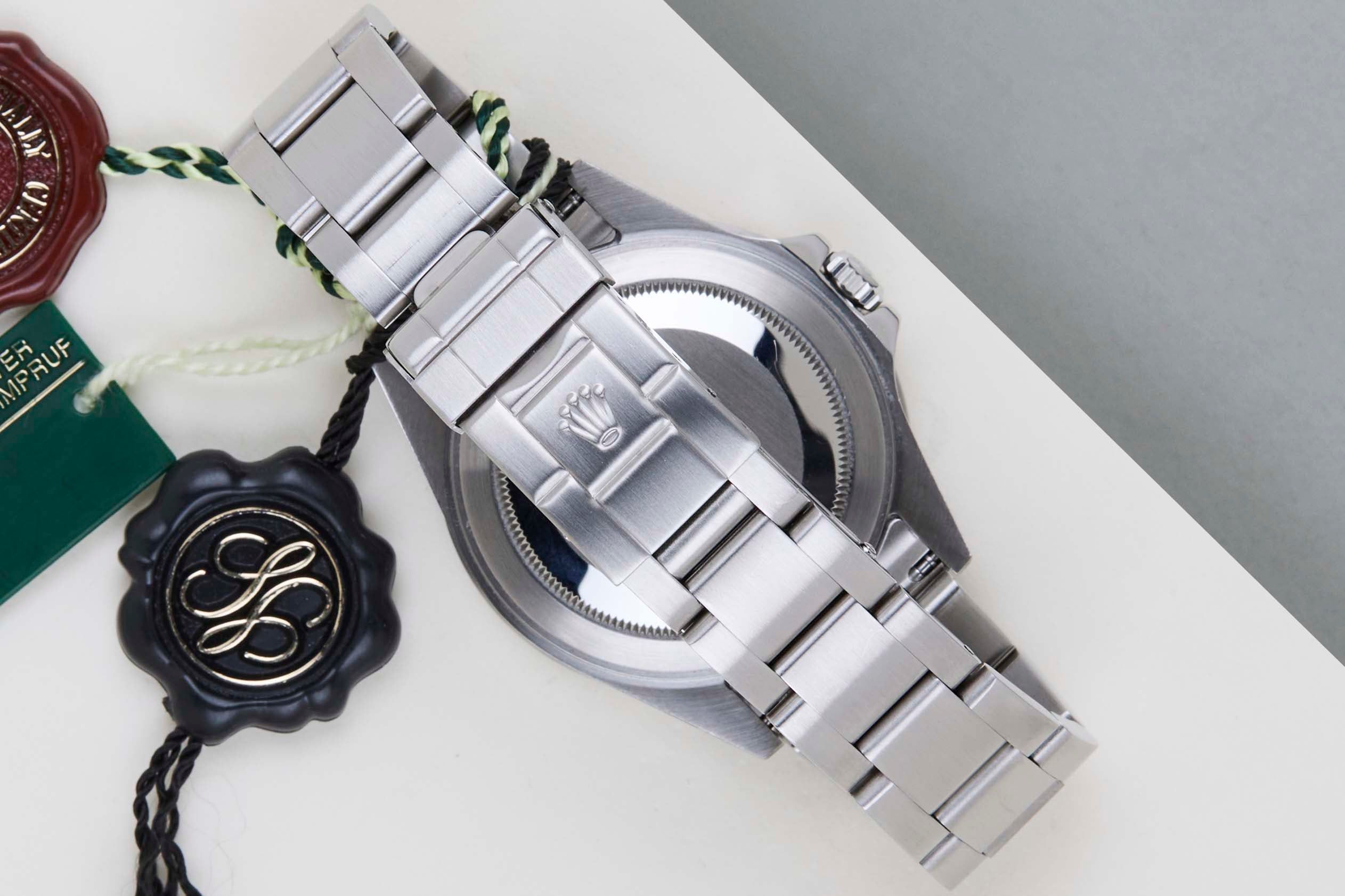 Diese spezielle Rolex GMT-Master II ist bereits mit der Laserkrone auf dem Saphirglas ausgestattet. Die Krone ist eine winzige, lasergravierte Krone, die leicht oberhalb der 6-Uhr-Markierung zu finden ist.