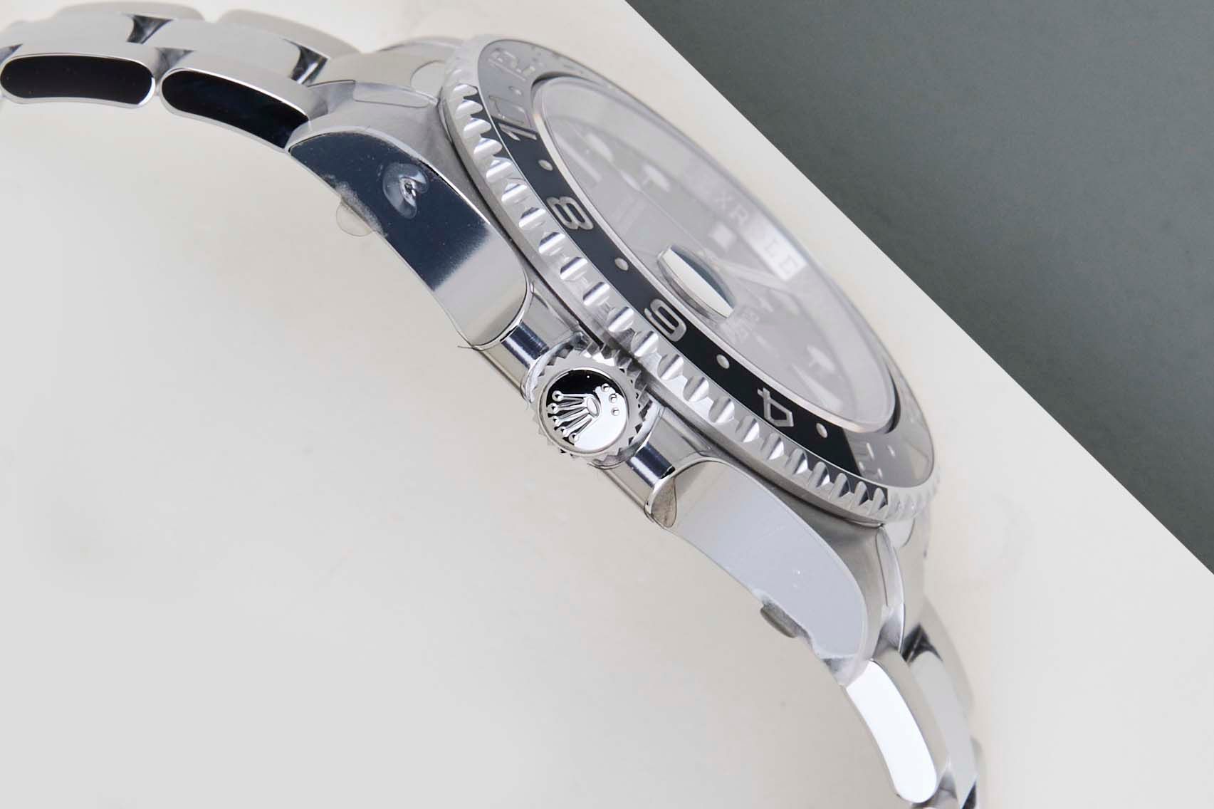 Dieser GMT-Master besteht aus Edelstahl und ist mit einem Oyster-Armband ausgestattet, das mit dem Easylink-System versehen ist. Diese Erweiterung ermöglicht es dem Träger, das Armband um 5 Millimeter zu verlängern oder zu verkürzen, was den Tragekomfort und die Benutzerfreundlichkeit der Uhr verbessert.