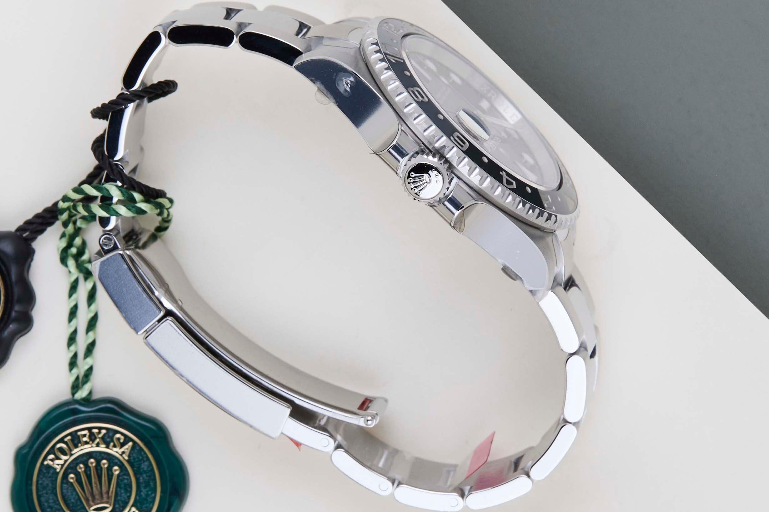 Diese GMT ist mit einer schwarzen und grauen Lünette ausgestattet, die von der Referenz 126710GRNR, Lunette Gris Noir, abgeleitet werden kann.