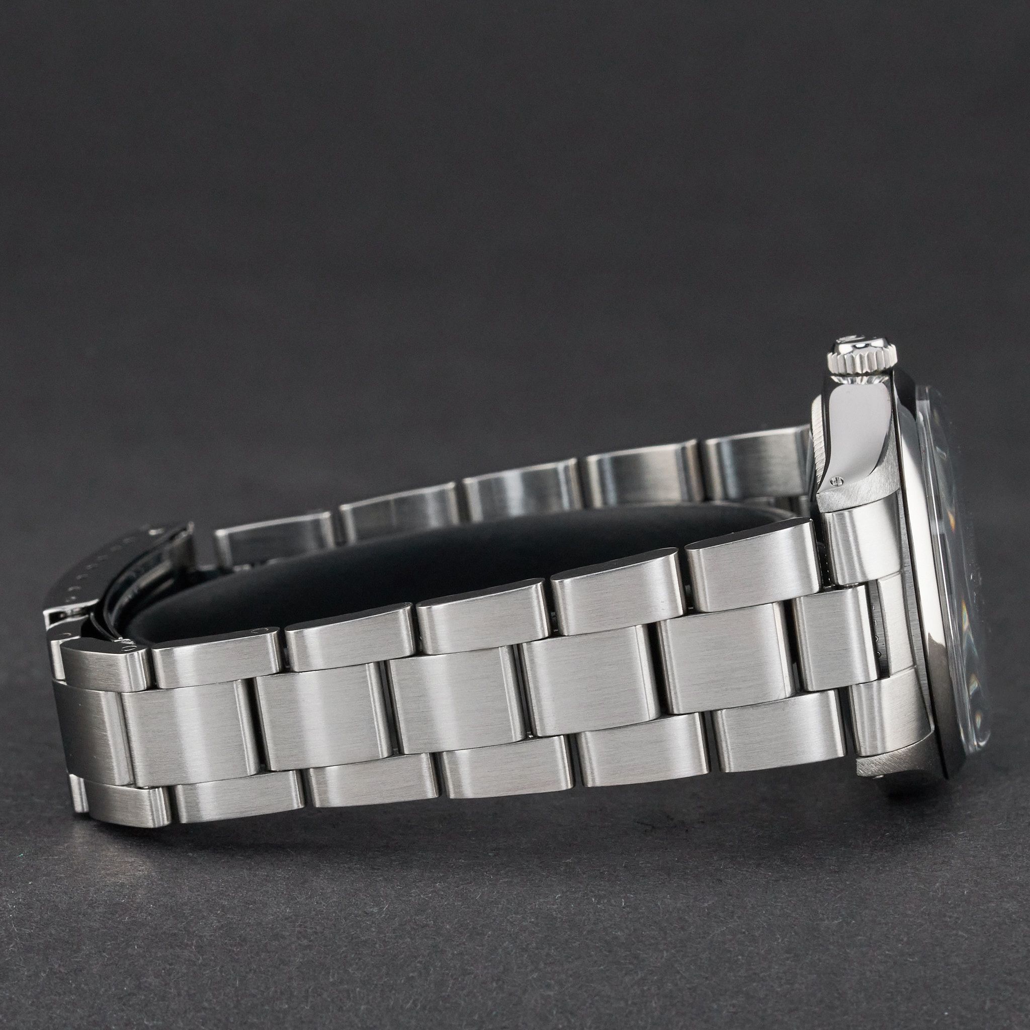 - Leichte Gebrauchsspuren wie feine Kratzer oder kleine Oberflächenkratzer. Gehäuse, Lünette und Armband behalten ihre scharfen Kanten und die ursprüngliche Form. Kann professionell poliert worden sein, ohne die originalen Konturen zu verändern. Mechanisch voll funktionsfähig.