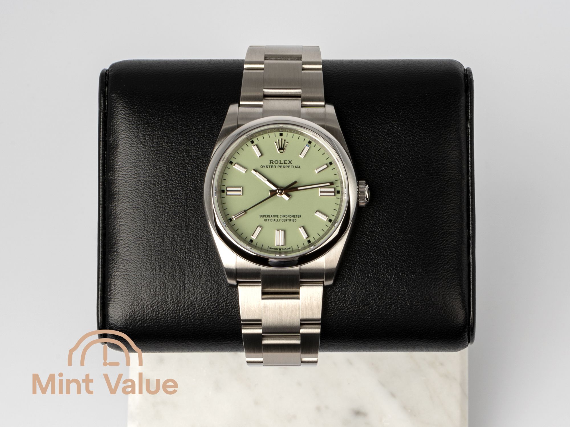 Als Teil der Oyster Perpetual Reihe eingeführt, wurde das Zifferblatt „Pistazie“ schnell zu einer der bekanntesten und begehrtesten Farbvarianten.
