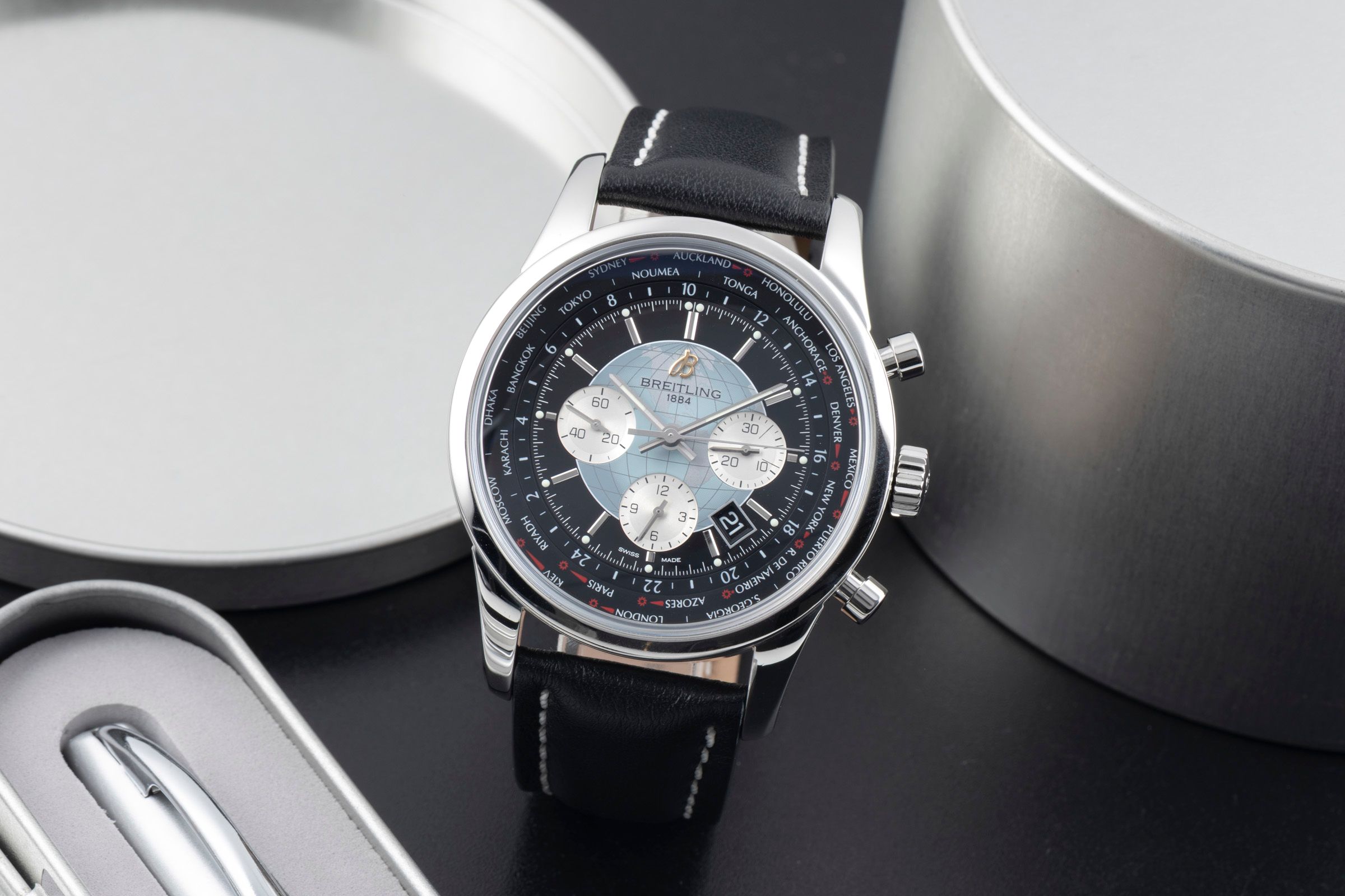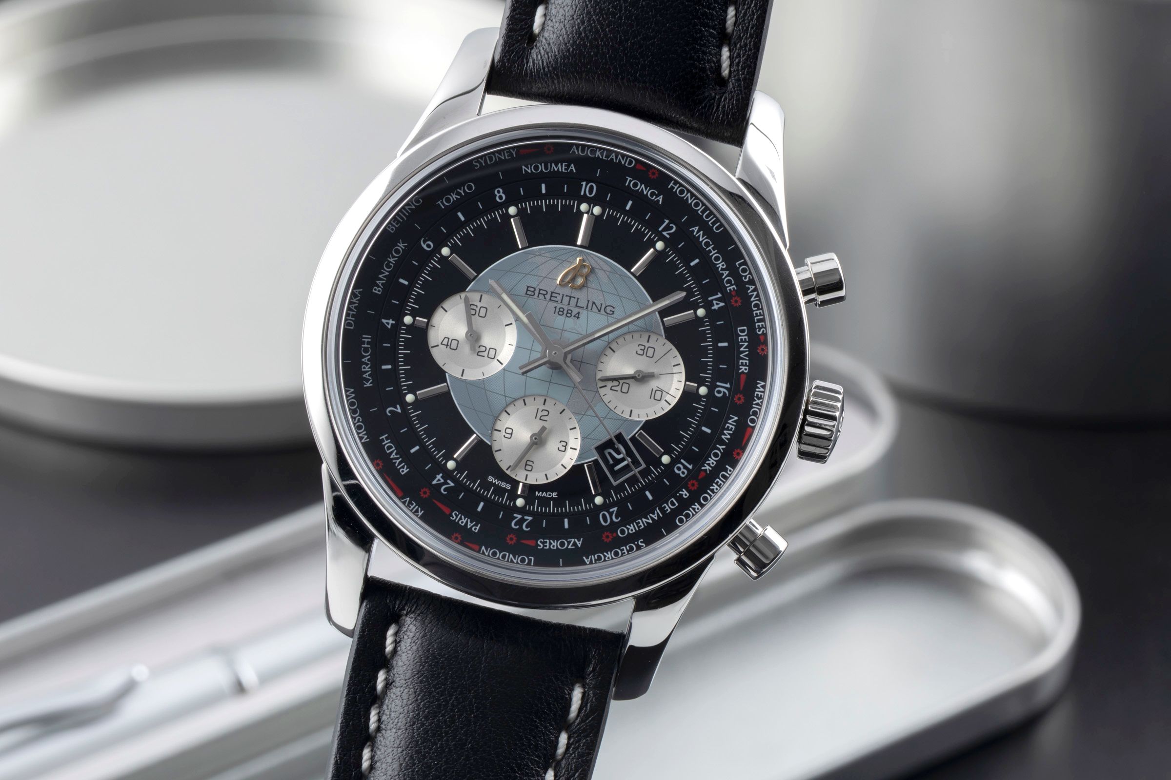 Functions: 24-hour display, Chronograph, Date, World time