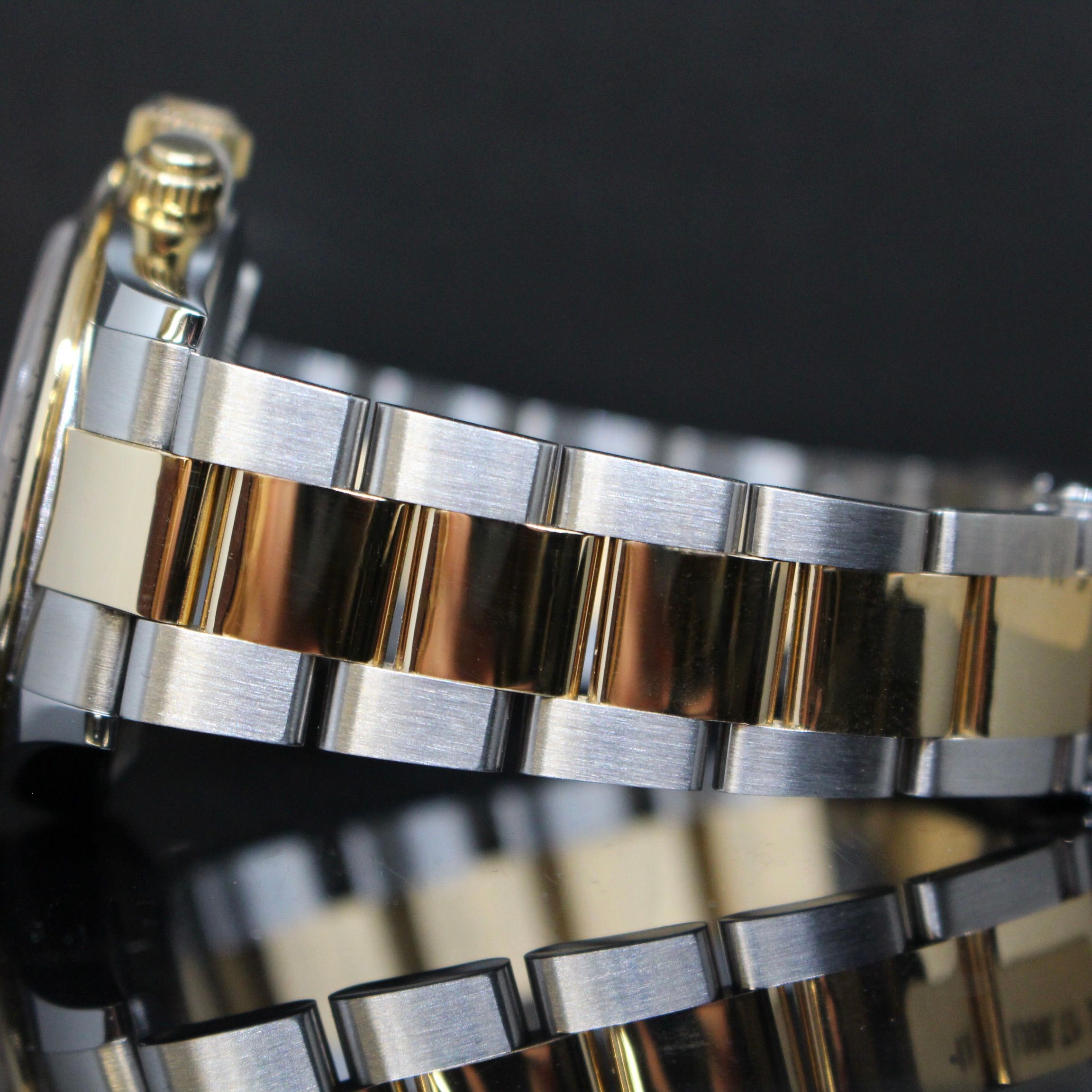 - Sichtbare Gebrauchsspuren wie Kratzer, kleine Dellen oder leichtes Spiel im Armband. Kann professionell poliert worden sein. Mechanisch voll funktionsfähig.