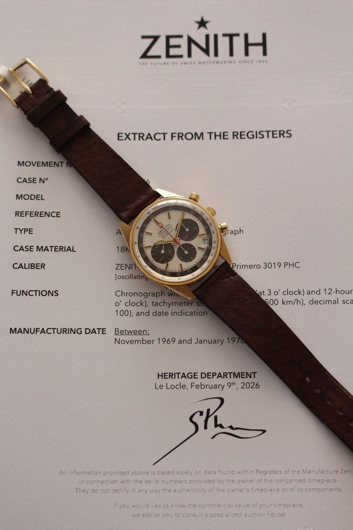 Zenith El Primero Ref. G381, Yellow Gold 18kt, Extract from the Registers, Excellent Condition, Tropical Dial