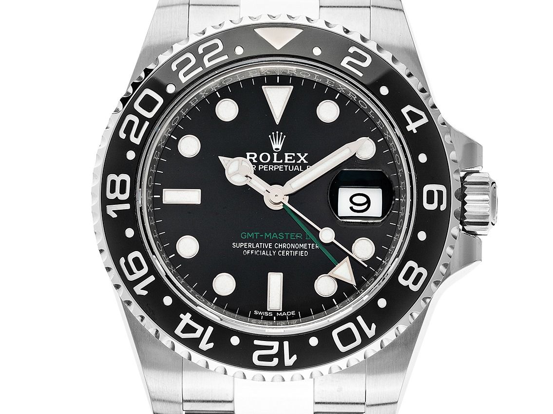 Gehäuse aus poliertem und satiniertem Edelstahl, Gehäusedurchmesser ohne Krone 40mm, Gehäusehöhe 12,0mm. Lünette aus Edelstahl mit geriffeltem Rand und schwarzem Keramikeinsatz, graviert mit 24-Stunden-Skala, beidseitig drehbar. Armband Oyster aus poliertem und satiniertem Edelstahl, Rolex Sicherheitsfaltschließe aus Edelstahl mit Hersteller-Logo. Zifferblatt schwarz mit aufgesetzten Indexen und Punkten aus Weißgold sowie Zeigern aus Weißgold. Uhrwerk Automatik, Chronometer mit Zertifikat, Rolex Manufakturkaliber 3186 mit 31 Edelsteinen. Anzeige von Stunde, Minute und Sekunde über zentrale Zeiger mit Sekundenstopp zur sekundengenauen Einstellung der Uhrzeit, Datumsanzeige mit Schnellverstellung unter Glaslupe bei 3 Uhr, zweite Zeitzone (GMT) ablesbar über Lünette, einstellbar über den grünen Zeiger aus der Mitte. Saphirglas kratzfest. Verschraubte Krone mit Flankenschutz und Hersteller-Logo. Boden aus Edelstahl verschraubt. Gewicht der Uhr inklusive Armband 152g, Länge des Armbandes inklusive Gehäuse 185mm. Referenznummer: 116710LN, Gehäusenummer: M628XXX, Baujahr 2007, ID: P2799204000326HW-14900, Artikelnummer: 10000085388. Mit Gangkontrolle und kompletter äußerlicher Aufarbeitung von April 2026. Original Rolex Box mit Umkarton und Garantiepapieren von Mai 2010, LC 160 / UK sowie Beschreibung, Ledermäppchen und Watchregister-Auszug von März 2026, The Watch Register Zertifikat / ohne Eintrag (Internationale Datenbank für verlorene oder gestohlene Uhren), Full Set. Kapitalanlage mit Wertsteigerungspotential. Sehr guter Zustand. Lieferzeit sofort.