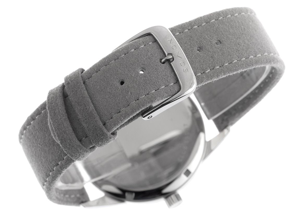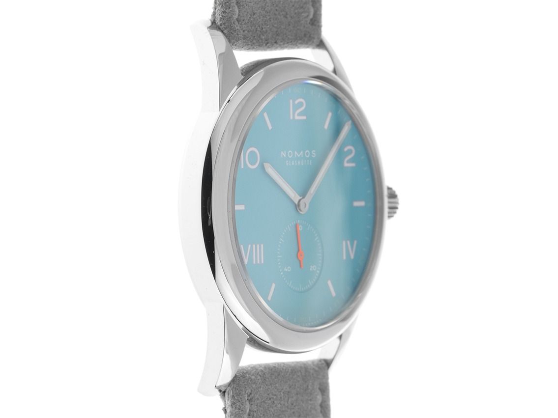 Gehäuse aus poliertem Edelstahl, zweiteilig, Gehäusedurchmesser ohne Krone 38,5 mm, Gehäusehöhe 8,5 mm. Lünette aus glattem und poliertem Edelstahl. Armband aus veganem Velours in samtgrau mit Ziernaht, Anstoßbreite 20 mm, Stiftschließe aus Edelstahl mit Hersteller-Logo. Zifferblatt in türkis mit arabischen und römischen Leuchtziffern sowie Leuchtindizes und Leuchtzeigern. Uhrwerk Handaufzug, Nomos Manufakturkaliber Alpha mit 17 Edelsteinen, Gangreserve ca. 43 Stunden. Anzeige von Stunde und Minute über Zeiger aus der Mitte, kleine Sekunde mit Sekundenstopp zur sekundengenauen Einstellung der Uhrzeit bei 6 Uhr. Saphirglas, kratzfest, gewölbt und doppelseitig entspiegelt. Krone mit Hersteller-Logo. Boden aus Edelstahl, verschraubt und graviert. Gewicht der Uhr inklusive Armband 58 g. Wasserdicht bis 10 ATM. Referenznummer: 724, ID: ST116020420426H-1560, Artikelnummer: 10000085399. Original Nomos Box und Garantie Papiere von März 2026, Full Set. Neu. Lieferzeit sofort.