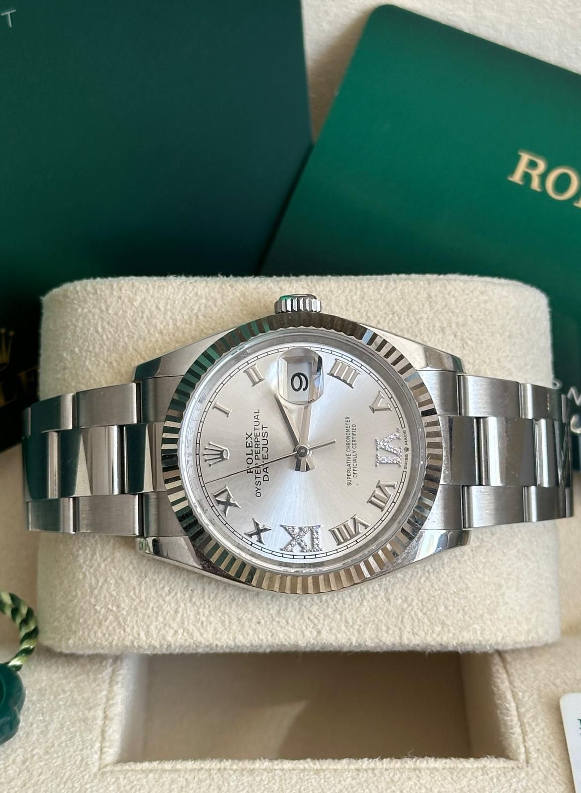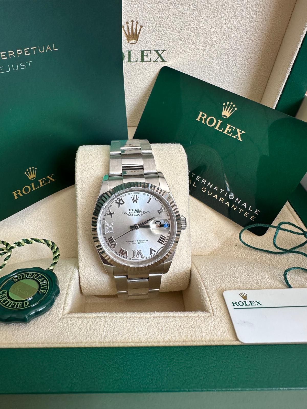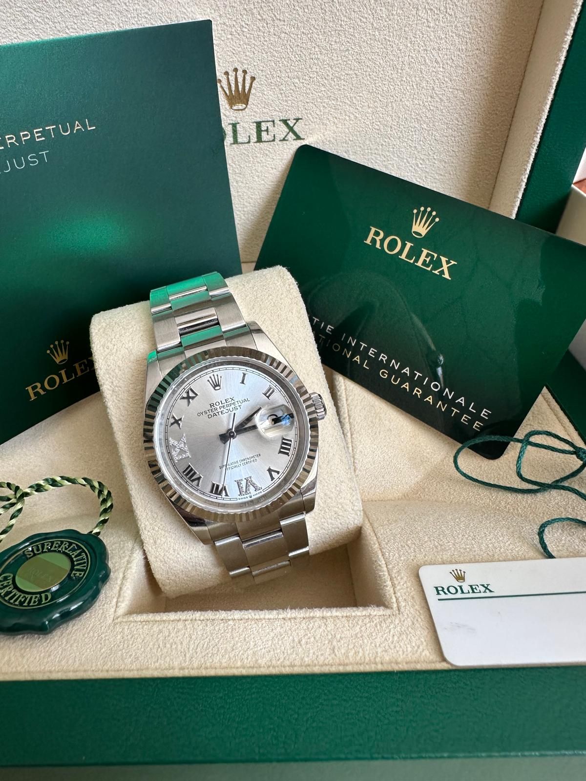 A fantastic opportunity to acquire a Rolex Datejust 36 with silver Roman diamond dial in outstanding condition—one of the most elegant and timeless models within the Rolex lineup.