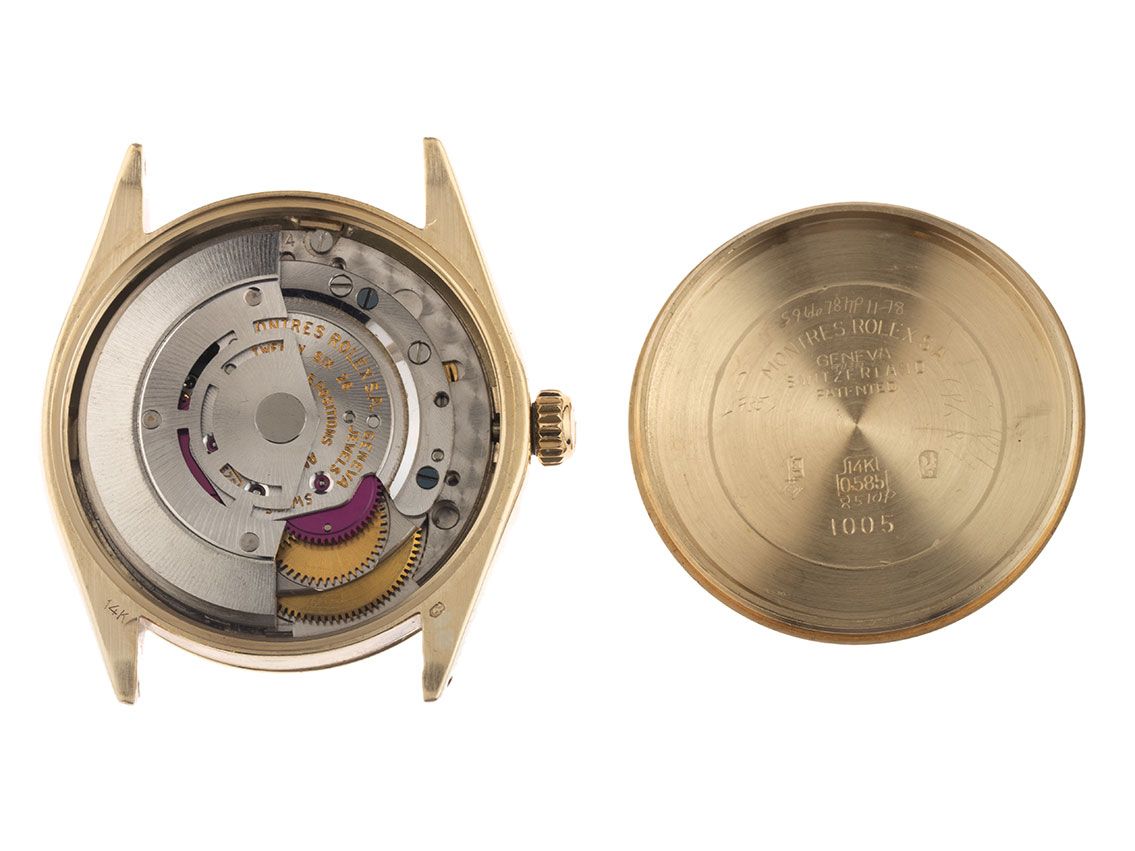 Gehäuse 14kt Gelbgold poliert und satiniert, Gehäusedurchmesser ohne Krone 34mm, Gehäusehöhe 10,2mm. Lünette 14kt Gelbgold glatt und poliert. Armband original Rolex Krokoleder schwarz mit Ziernaht, Anstoßbreite 19mm, Rolex Stiftschließe Gelbgold vergoldet. Zifferblatt silber goldfadet, patiniert, mit aufgesetzten gelbgoldenen Indexen und gelbgoldenen Zeigern. Uhrwerk Automatik, Chronometer, Rolex Manufakturkaliber 1570 mit 26 Edelsteinen. Anzeige von Stunde, Minute und Sekunde über Zeiger aus der Mitte. Plexiglas. Krone verschraubbar mit Hersteller-Logo. Boden 14kt Gelbgold verschraubt. Gewicht der Uhr inklusive Armband 49g. Referenznummer: 1005, Baujahr 1968, ID: P248783000226H-7800, Artikelnummer: 10000084738. Mit Gangkontrolle und kompletter äußerlicher Aufarbeitung von Februar 2026. Original Rolex Box und Ledermäppchen, Übersetzungsheft, Rolex Chronometer-Siegel, Tag und Watchregister Auszug von Februar 2026, The Watch Register Zertifikat / ohne Eintrag (Internationale Datenbank für verlorene oder gestohlene Uhren). Superschnäppchen, Kapitalanlage mit Wertsteigerungspotential. extrem seltenes Sammlerstück. Sehr guter Zustand. Lieferzeit sofort.