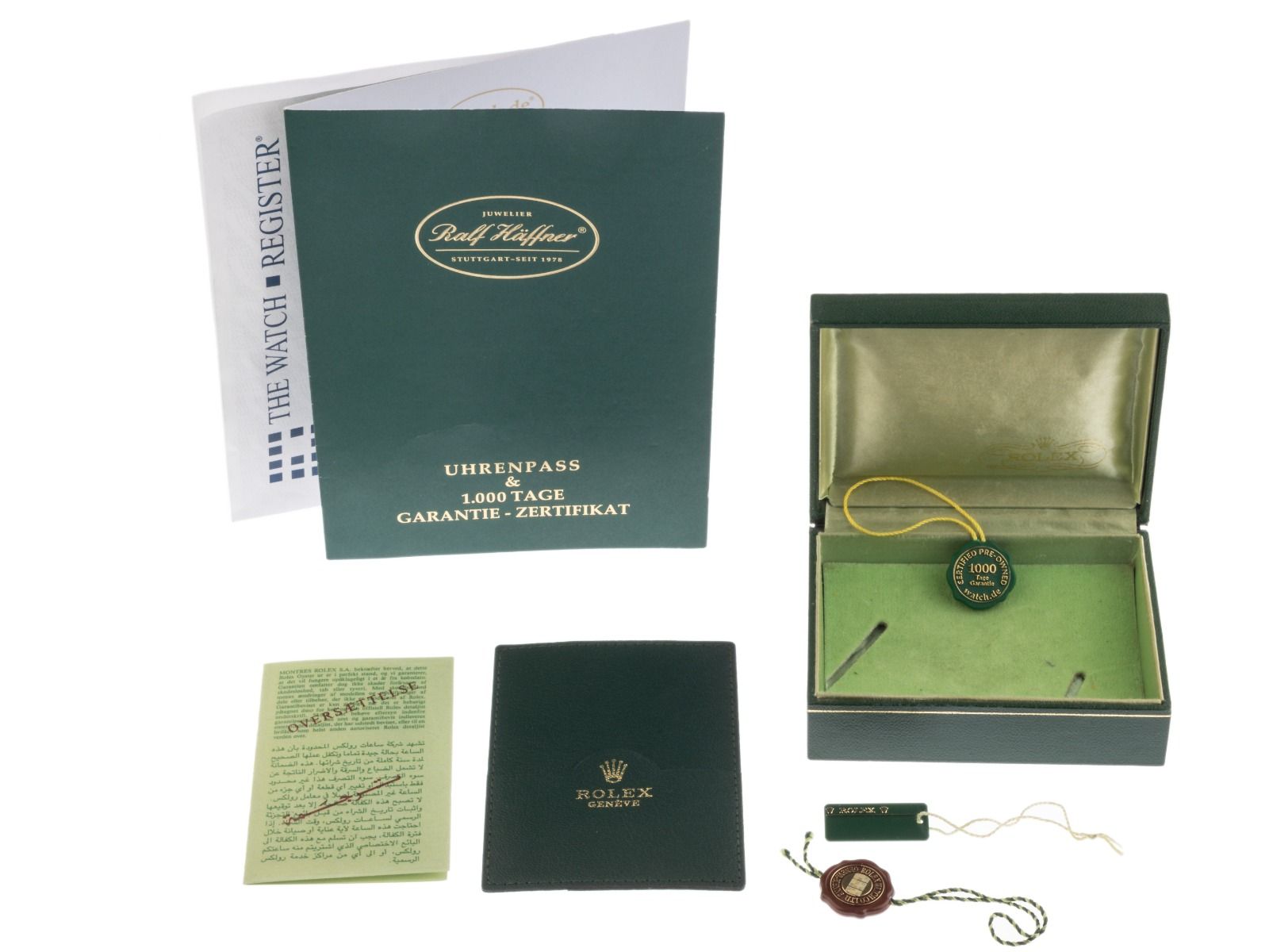 Inklusive certified pre owned Zertifikat / Uhrenpass mit einem Farbbild, der genauen Beschreibung sowie dem Wiederbeschaffungswert der Uhr über 7800,-€ und 1000 Tage Garantie ab Kaufdatum.