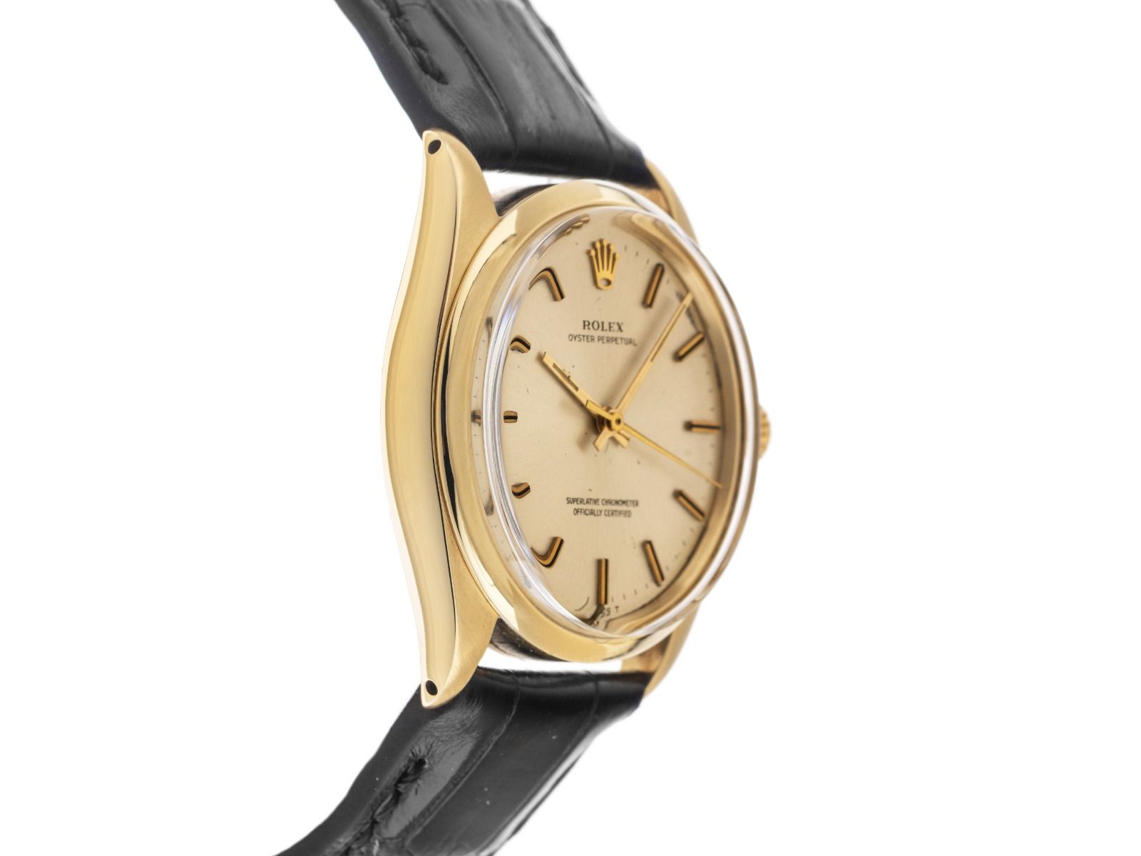 Rolex Oyster Perpetual 14kt Gelbgold Automatik Armband KrokolederGehäuse 14kt Gelbgold poliert und satiniert, Gehäusedurchmesser ohne Krone 34mm, Gehäusehöhe 10,2mm. Lünette 14kt Gelbgold glatt und poliert. Armband original Rolex Krokoleder schwarz mit Ziernaht, Anstoßbreite 19mm, Rolex Stiftschließe Gelbgold vergoldet. Zifferblatt silver goldfadet, pateniert, mit aufgesetzten gelbgoldenen Indexen und gelbgoldenen Zeigern. Uhrwerk Automatik, Chronometer, Rolex Manufakturkaliber 1570 mit 26 Edelsteinen. Anzeige von Stunde, Minute und Sekunde über Zeiger aus der Mitte. Plexiglas. Krone verschraubbar mit Hersteller-Logo. Boden 14kt Gelbgold verschraubt. Gewicht der Uhr inklusive Armband 49g. Referenznummer: 1005, Baujahr 1968, ID: P248783000226H-7800, Artikelnummer: 10000084738. Mit Gangkontrolle und kompletter äußerlicher Aufarbeitung von Februar 2026. Original Rolex Box und Ledermäppchen, Übersetzungsheft, Rolex Chronmeter- Siegel, Tag und Watchregister Auszug von Februar 2026, The Watch Register Zertifikat / ohne Eintrag (Internationale Datenbank für verlorene oder gestohlene Uhren). Superschnäppchen, Kapitalanlage mit Wertsteigerungspotential. extrem seltenes Sammlerstück. Sehr guter Zustand. Lieferzeit sofort.