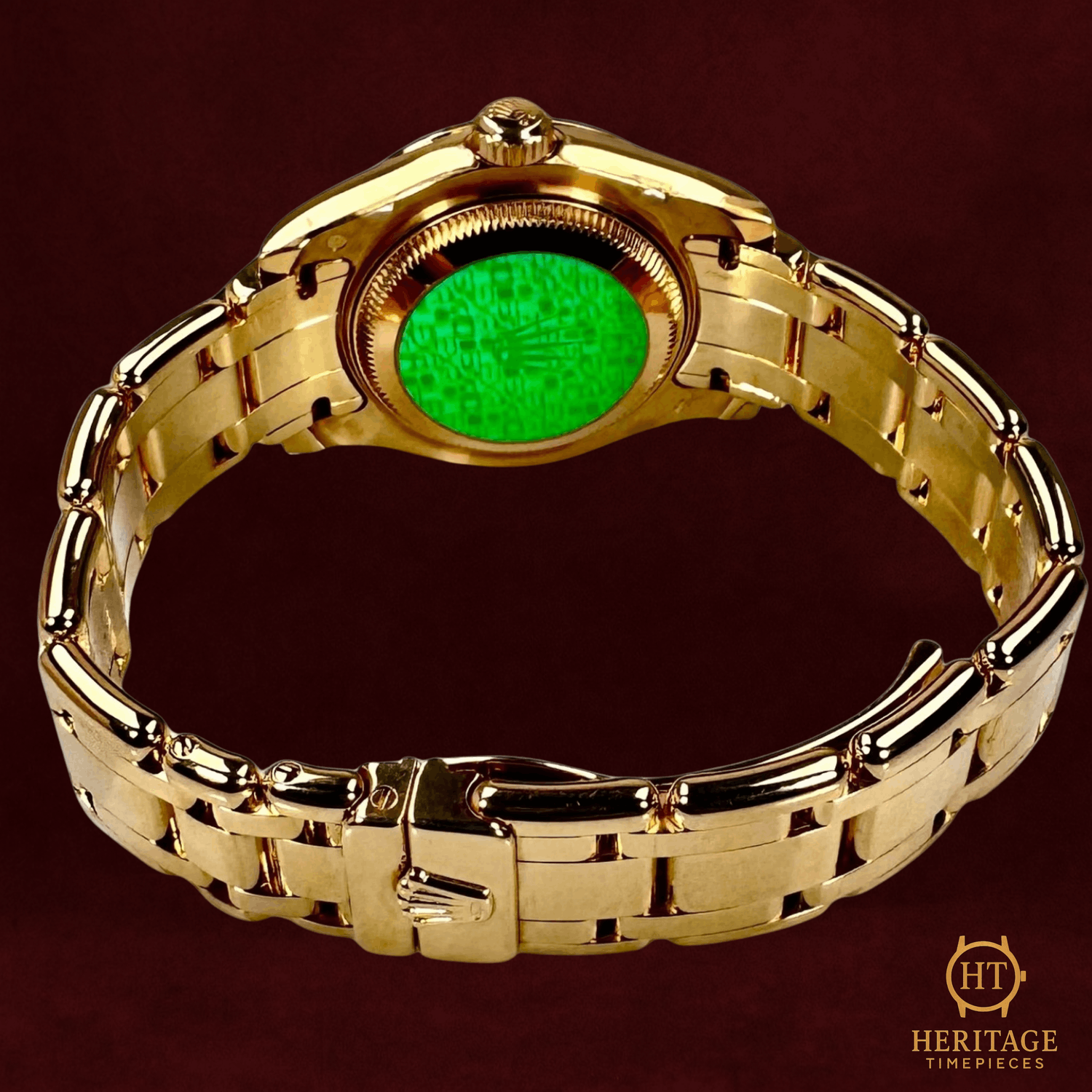 Heritage Narrative The Rolex Pearlmaster represents the pinnacle of elegance within the Datejust collection — a masterwork of jewelry craftsmanship and horological precision. Introduced in 1992, it quickly became Rolex’s most luxurious interpretation of the Datejust, distinguished by its sculpted precious-metal case, rounded link bracelet, and exclusive use of diamonds and gemstones set in-house by Rolex’s master gemologists. This 2006 reference 80298 is a stunning example of the Pearlmaster’s artistry, crafted entirely from 18k yellow gold and preserved in unworn condition, still retaining its original protective stickers. The white mother-of-pearl dial with factory-set diamond hour markers radiates timeless femininity, while the diamond-set bezel and factory diamond Pearlmaster bracelet elevate it to the level of wearable haute joaillerie. Inside beats the Calibre 2235, Rolex’s chronometer-certified self-winding movement known for reliability and precision. Offered as a full set — including box, certificate, booklets, and tag — this piece stands as both a jewelry masterpiece and a rare collector’s Rolex in truly pristine form. Technical Specifications Reference:80298 Year:2006 (K-serial) Movement:Rolex Calibre 2235, automatic, chronometer-certified, quickset date, ~48 h power reserve Case:29 mm 18k yellow gold Oyster case with original factory stickers intact, screw-down Twinlock crown Bezel:Factory-set diamond bezel in 18k yellow gold Crystal:Sapphire, scratch-resistant, Cyclops lens over date Dial / Hands:Factory white mother-of-pearl dial with diamond hour markers, gold hands, date at 3 o’clock Bracelet / Clasp:18k yellow gold Pearlmaster bracelet (6½ in length) with factory-set diamonds and concealed Crownclasp Water resistance:100 m / 330 ft (factory rating) Condition & Inclusions Overall grade:Unworn — original stickers intact, no signs of handling or wear Service status:Factory condition; untouched movement and finish Set:Full set — Rolex presentation box, certificate, booklets, and tag Shipping & Logistics Stored off-site and shipped fully insured within 1–3 business daysWorldwide shipping available; buyer responsible for any import duties or taxes Shipping & Returns Complimentary insured worldwide shipping and a 14-day return window (watch must be returned in the same condition supplied). Every timepiece is authenticated, time-graphed, and prepared for secure transit.