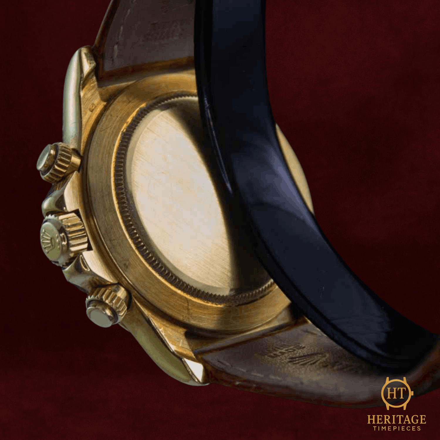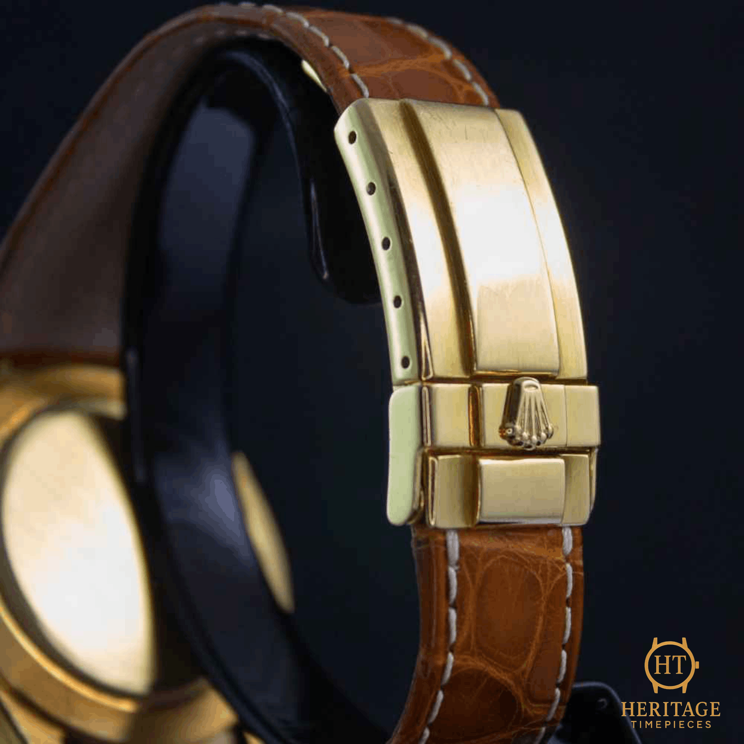 Die Rolex Daytona Referenz 16518 repräsentiert das goldene Zeitalter der Zenith-betriebenen Daytona-Ära – ein kurzes, aber historisch bedeutendes Kapitel zwischen den handaufgezogenen Vintage-Modellen und den vollständig in-house Chronographen von Rolex. Produziert in den 1990er Jahren, beherbergt dieses Modell das legendäre Kaliber 4030, das auf Zeniths El Primero Uhrwerk basiert, aber von Rolex umfangreich modifiziert wurde, um die Genauigkeit und Zuverlässigkeit zu verbessern. Vollständig aus 18k Gelbgold gefertigt, strahlt dieses Beispiel aus dem Jahr 1995 sowohl Sportlichkeit als auch Raffinesse aus und verfügt über ein 40 mm Oyster-Gehäuse, eine weiße Zifferblatt mit kontrastierenden Hilfszifferblättern und ein braunes Lederarmband, das mit einer goldenen Faltschließe gesichert ist. Das zurückhaltende Design und die handgefertigten Details heben die Übergangscharakteristik der Referenz hervor – eine perfekte Synthese aus klassischen Daytona-Proportionen und moderner Rolex-Präzision. Sammler schätzen die 16518 für ihre markante mechanische Abstammung und ihr zeitloses Design – ein Markenzeichen der Rolex-Handwerkskunst auf dem Höhepunkt des Luxus der 1990er Jahre.