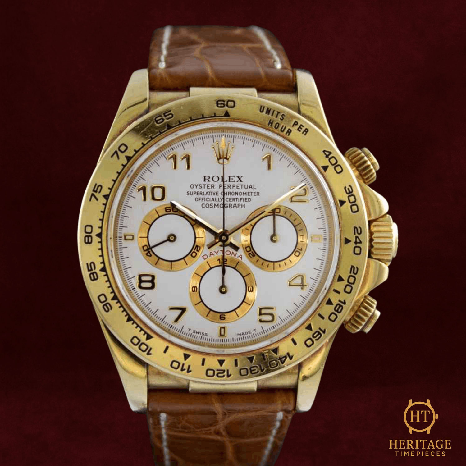 Heritage Narrative The Rolex Daytona reference 16518 represents the golden age of the Zenith-powered Daytona era — a short-lived but historically significant chapter between the manual-wind vintage models and Rolex’s fully in-house chronographs. Produced throughout the 1990s, this model houses the legendary Calibre 4030, based on Zenith’s El Primero movement but extensively modified by Rolex for enhanced accuracy and reliability. Crafted entirely in 18k yellow gold, this 1995 example exudes both sportiness and refinement, featuring a 40 mm Oyster case, a white dial with contrasting subdials, and a brown leather strap secured by a gold deployant clasp. The piece’s restrained design and hand-finished details highlight the transitional nature of the reference — a perfect synthesis of classic Daytona proportions and modern Rolex precision. Collectors prize the 16518 for its distinctive mechanical pedigree and timeless design — a hallmark of Rolex’s craftsmanship at the height of 1990s luxury. Technical Specifications Reference:16518 Year:1995 Movement:Rolex Calibre 4030 (Zenith El Primero base), automatic, chronograph with small seconds, 30-minute and 12-hour counters, ~54-hour power reserve Case:40 mm 18k yellow gold Oyster case with screw-down crown and pushers Bezel:Fixed 18k yellow gold tachymeter bezel, engraved scale Crystal:Sapphire crystal, scratch-resistant Dial / Hands:White dial with contrasting gold subdials and applied hour markers, luminous accents Bracelet / Clasp:Brown leather strap with 18k yellow gold folding clasp Water resistance:30 m / 3 ATM (factory rating) Condition & Inclusions Overall grade:Pre-owned — excellent condition with minimal signs of wear Service status:Movement tested and performing within Rolex chronometer standards Set:Watch only — no box or papers Shipping & Logistics Stored off-site and shipped fully insured within 1–3 business days. Worldwide shipping available; buyer responsible for any import duties or taxes. Shipping & Returns Complimentary insured worldwide shipping and a 14-day return window (watch must be returned in the same condition supplied). Each watch is authenticated, regulated, and professionally detailed prior to dispatch. All shipments include secure packaging, tracking, and full insurance coverage.