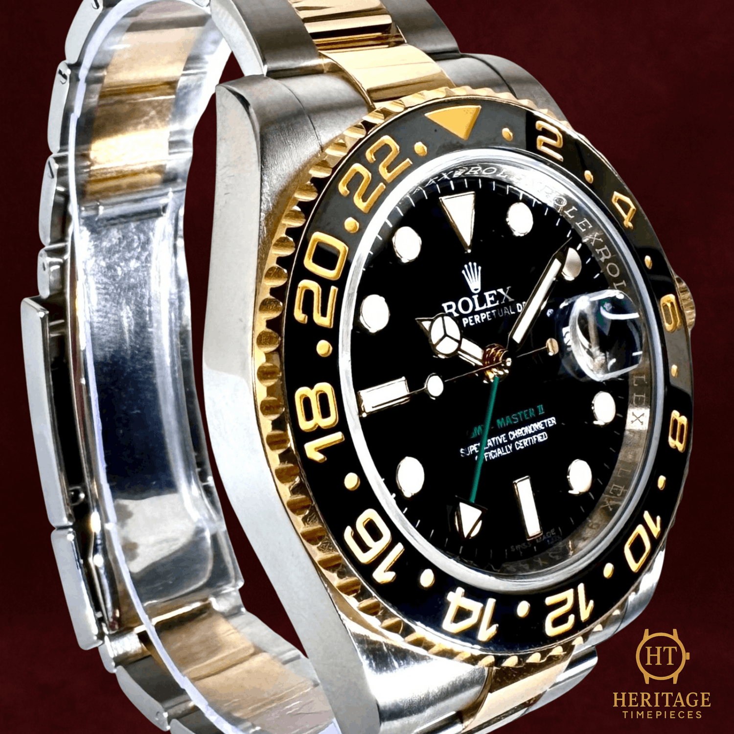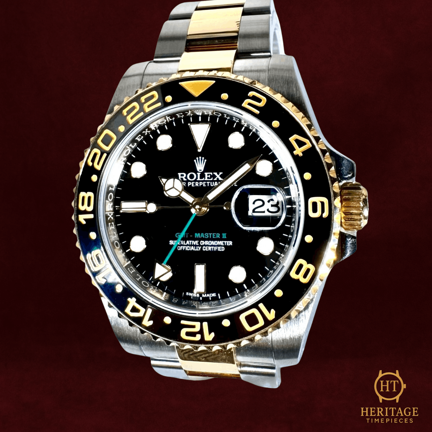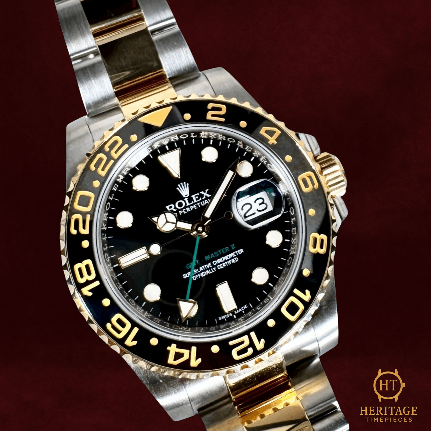 Heritage Narrative The Rolex GMT-Master II is one of the most recognizable and functional travel watches ever produced, originally developed for professional pilots and frequent travelers. Reference 116713 represents the modern two-tone execution of this iconic model, combining Rolex’s professional GMT functionality with the warmth and presence of 18kt yellow gold. This example features a 40 mm stainless steel case paired with an 18kt yellow gold bidirectional rotating bezel fitted with a black ceramic Cerachrom insert and gold-filled 24-hour numerals. The black dial with luminous hour markers set in gold provides excellent contrast and legibility, while maintaining the unmistakable GMT-Master aesthetic. Powered by a Rolex self-winding Perpetual mechanical movement with GMT functionality, the watch allows tracking of up to three time zones via the 24-hour hand and rotating bezel. The independently adjustable hour hand and quickset date make it especially practical for frequent travel. Finished on a two-tone Oyster bracelet, the watch offers a secure, comfortable fit and a distinctly modern Rolex sports presence. Presented in mint condition and offered as a complete set, this GMT-Master II 116713 is an excellent example of a contemporary Rolex travel watch that balances technical capability with refined design. Technical Specifications Brand:Rolex Model:GMT-Master II Reference:116713 Serial Number:932XXXXX Year:2017 Movement:Rolex self-winding Perpetual mechanical movement24-hour GMT hand Complications / Functions:Quickset dateGMT function with independent hour adjustmentTracking of up to three time zones Case:40 mm stainless steel case Bezel:Bidirectional rotatable 18kt yellow gold bezelBlack ceramic Cerachrom insert with gold-filled 24-hour scale Crystal:Scratch-resistant sapphire crystal Dial / Hands:Black dialLuminous hour markers and hands set in gold Bracelet:18kt yellow gold & stainless steel Oyster braceletApprox. 8 in (adjustable) Water Resistance:100 m / 330 ft (factory specification) Condition & Inclusions Overall Condition:Mint condition Service Status:Movement tested and functioning correctly Set:Complete set including: Box, Certificate / warranty card, Booklets, Tag Shipping & Logistics The watch is stored securely and shipped fully insured within 1–3 business days. Worldwide shipping is available. Any applicable import duties or taxes are the responsibility of the buyer. Shipping & Returns Complimentary insured worldwide shipping and a 14-day return window. Each timepiece is authenticated, time-tested, and professionally prepared prior to dispatch. Secure packaging, tracking, and full insurance are included with every shipment.