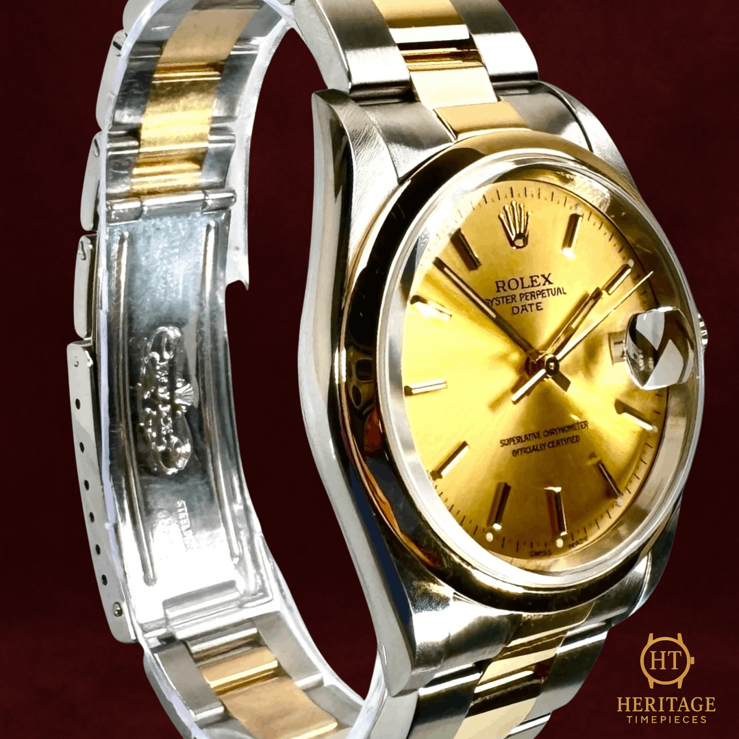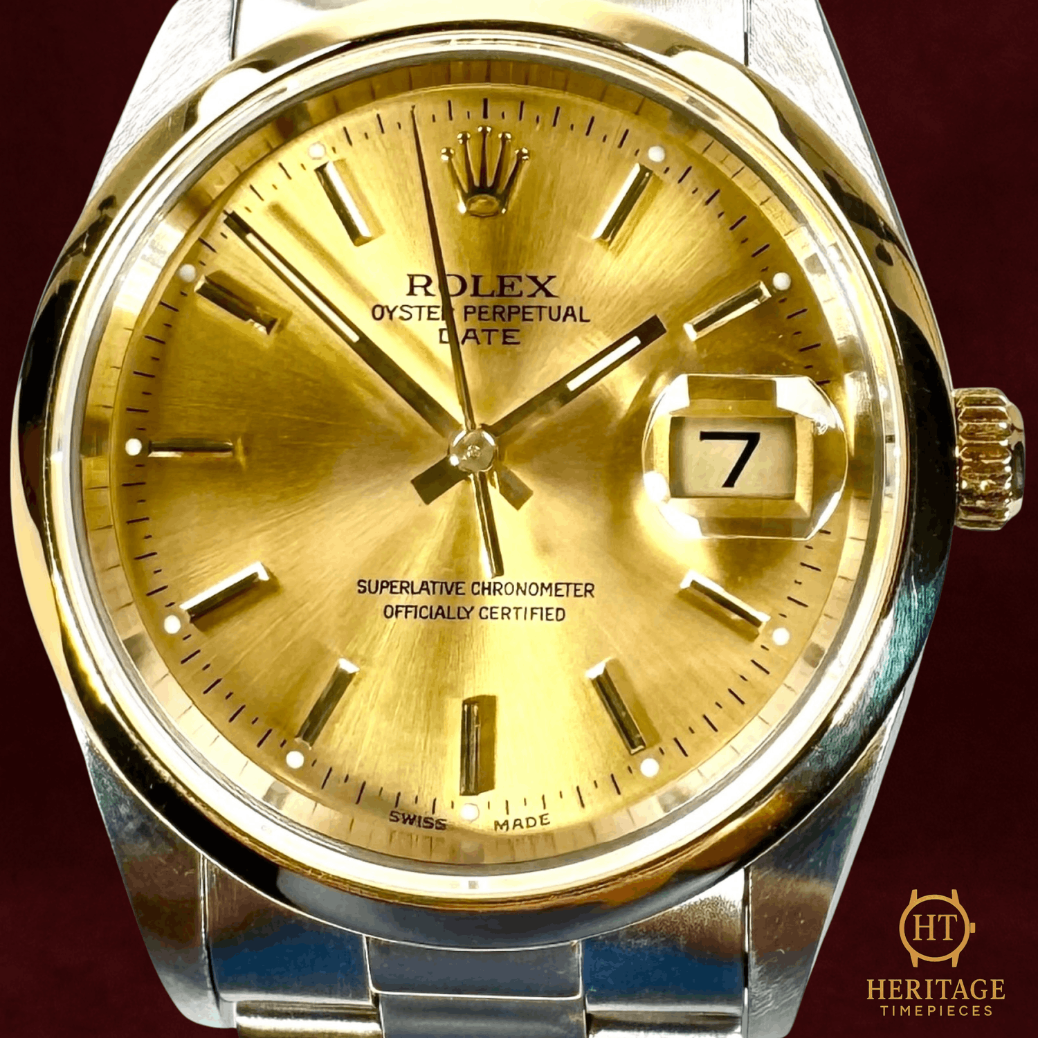 Heritage Narrative The Rolex Date reference 15203 represents a classic mid-size Rolex configuration, combining understated proportions with the practicality of a date complication. With its 34 mm Oyster case and traditional two-tone construction, the 15203 offers a versatile alternative to larger Datejust models while retaining the robust, everyday-wear identity associated with Rolex’s Oyster line. This example is presented in mint condition and features a champagne dial with applied gold index hour markers. The warm dial tone pairs naturally with the 18kt yellow gold bezel and center links, creating a cohesive and timeless aesthetic that remains distinctly Rolex without being overly formal. The watch is powered by a Rolex self-winding Perpetual mechanical movement with date functionality, designed for reliable daily performance and ease of use. The 34 mm stainless steel Oyster case provides strong durability in a compact profile, while the smooth 18kt yellow gold bezel adds a clean, understated frame around the dial. The stainless steel and 18kt yellow gold Oyster bracelet completes the traditional two-tone Rolex profile, offering comfort, strength, and a balanced wrist presence. With its classic proportions and practical design, the Rolex Date 15203 is an excellent choice for collectors and daily wearers seeking a refined, mid-size Rolex with timeless appeal. Presented with box and booklets, this Rolex Date 15203 offers a clean and highly wearable two-tone configuration in excellent condition. Technical Specifications Brand:Rolex Model:Date 34 Reference:15203 Serial Number:T86XXXX Year:1996 (approx., based on serial) Movement:Rolex self-winding Perpetual mechanical movement Complications:Time, date Case:34 mm stainless steel Oyster case Bezel:Smooth 18kt yellow gold bezel Crystal:Scratch-resistant sapphire crystal Dial / Hands:Champagne dialApplied gold index hour markersGold hands Bracelet:Stainless steel & 18kt yellow gold Oyster braceletApprox. 7 1/2 in (adjustable) Water Resistance:100 m / 330 ft (factory specification) Condition & Inclusions Overall Condition:Pre-owned — mint condition Service Status:Movement tested and functioning correctly Set:Includes box and booklets Shipping & Logistics The watch is stored securely and shipped fully insured within 1–3 business days. Worldwide shipping is available. Any applicable import duties or taxes are the responsibility of the buyer. Shipping & Returns Complimentary insured worldwide shipping and a 14-day return window. Each timepiece is authenticated, time-tested, and professionally prepared prior to dispatch. Secure packaging, tracking, and full insurance are included with every shipment.