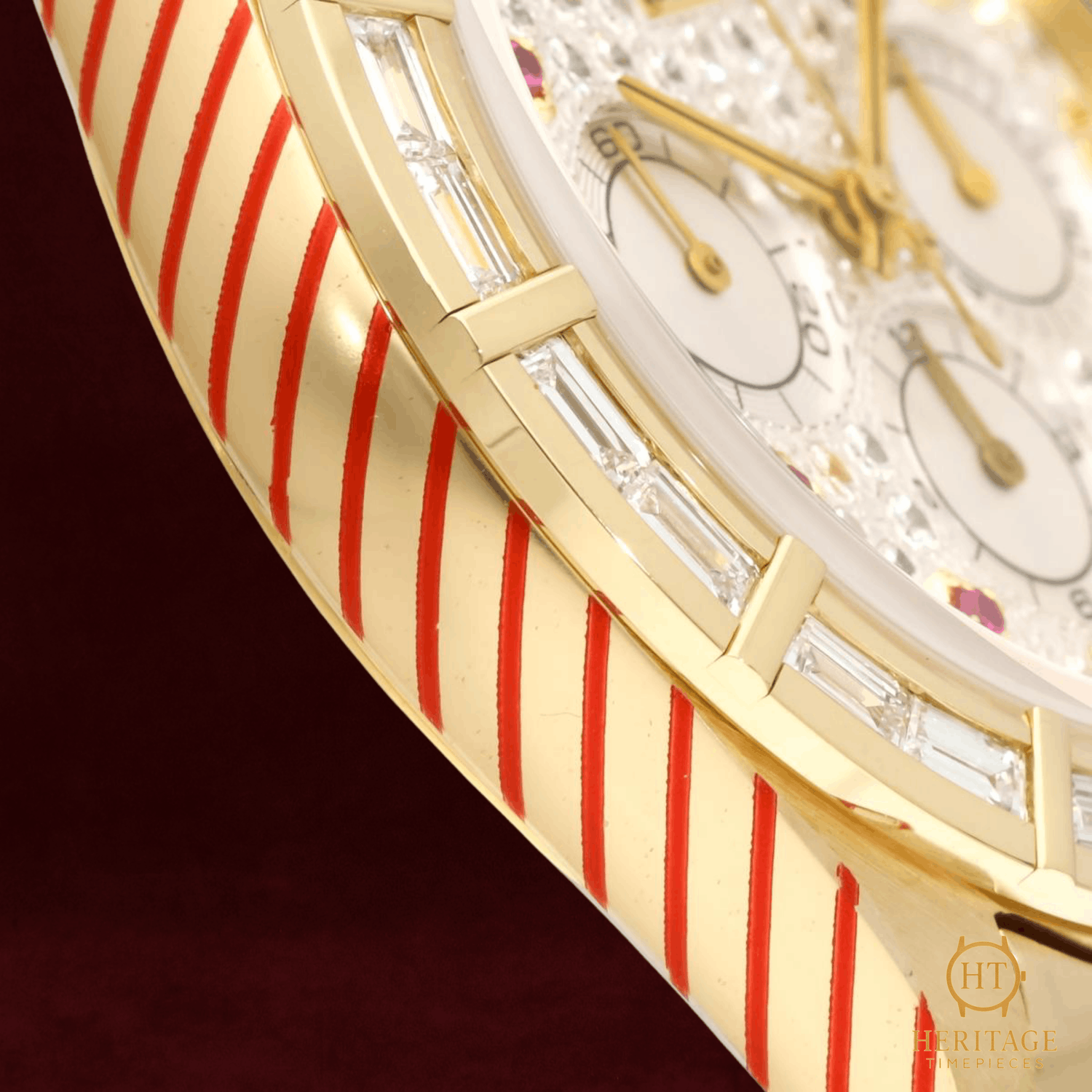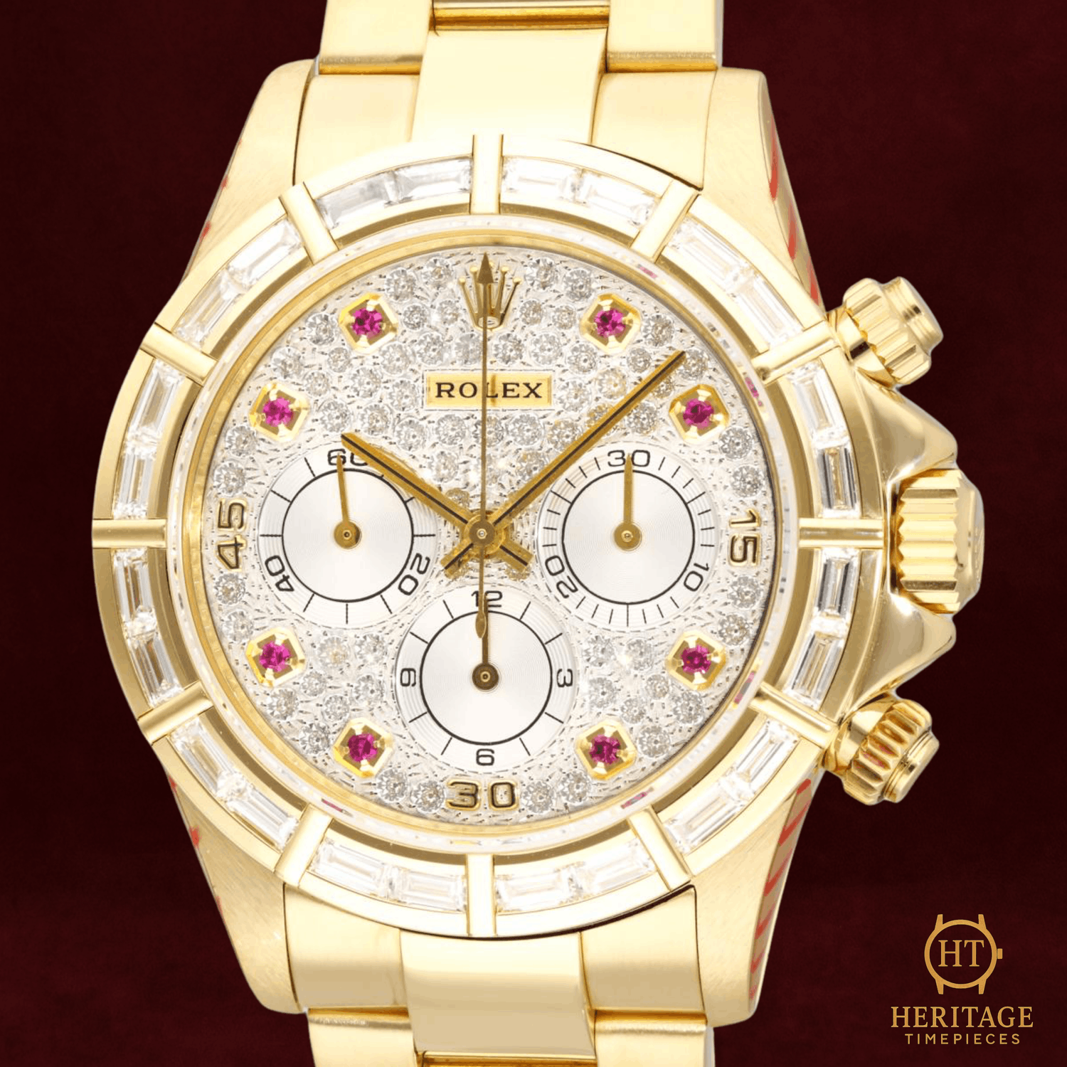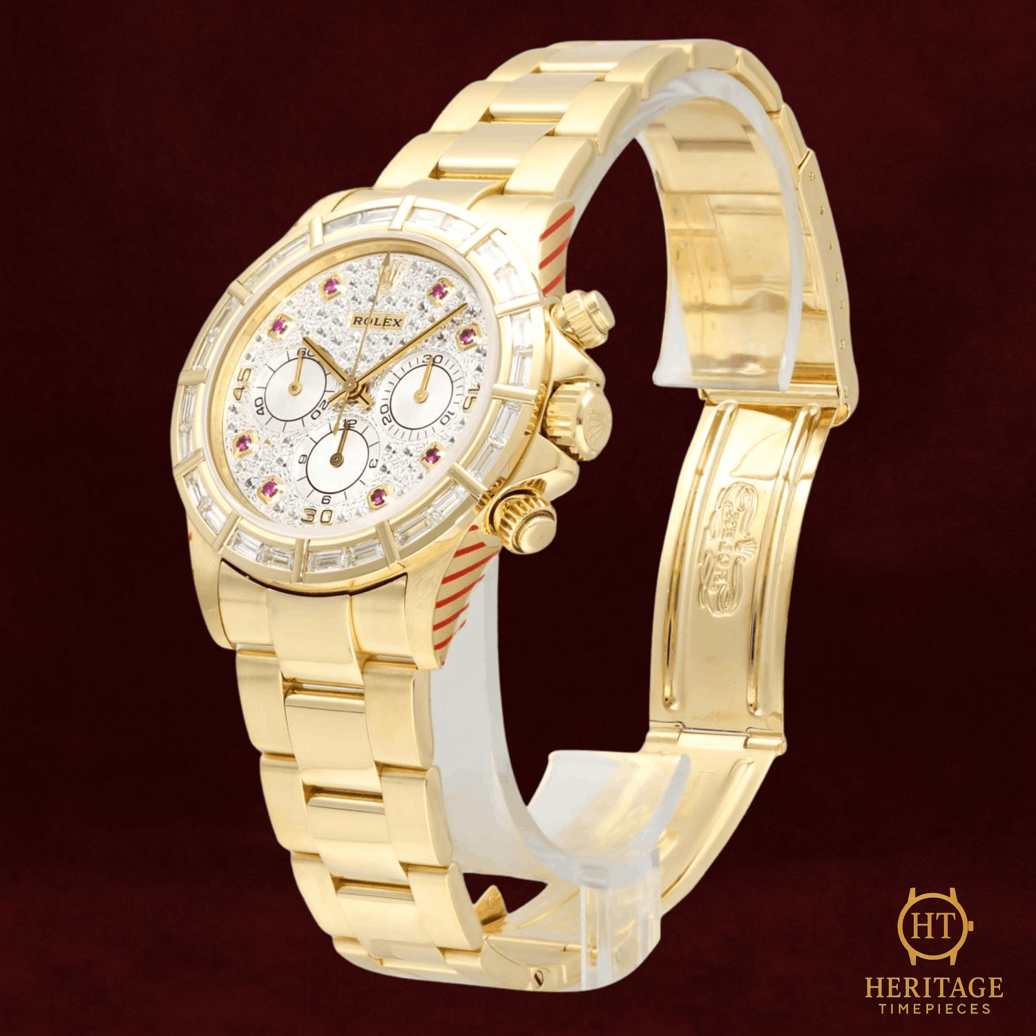 Heritage Narrative The Rolex Cosmograph Daytona reference 16568BR represents an extraordinary intersection of high watchmaking and haute joaillerie. Crafted in 18k yellow gold and powered by the celebrated Zenith-based automatic chronograph movement, this reference belongs to the revered generation of Daytona models produced during the 1990s. What distinguishes this example is its exceptional gem-setting: a pavé diamond dial framed by a factory-set baguette diamond bezel, complemented by ruby hour markers that introduce a subtle yet striking contrast. The result is a Daytona that balances technical pedigree with remarkable decorative artistry — a rare and unmistakably luxurious interpretation of Rolex’s most iconic chronograph. Technical Specifications Reference:16568BR Year:1995 Movement:Rolex automatic chronograph movement based on Zenith El Primero Case:40 mm case in 18k yellow gold Bezel:Factory-set baguette diamond bezel in 18k yellow gold Crystal:Scratch-resistant sapphire crystal Dial / Hands:Pavé diamond dial with ruby hour markers and chronograph sub-dials Bracelet / Clasp:18k yellow gold bracelet with folding deployant clasp Water resistance:100 m (manufacturer specification) Condition & Inclusions Overall grade:Pre-owned Service status:Movement tested and functioning correctly Set:Watch only Shipping & Logistics Stored off-site and shipped fully insured within 1–3 business days.Worldwide shipping available; buyer responsible for any import duties or taxes. Shipping & Returns Complimentary insured worldwide shipping and a 14-day return window (watch must be returned in the same condition supplied). Each timepiece is authenticated, time-tested, and professionally prepared prior to dispatch. All shipments include secure packaging, tracking, and full insurance coverage.