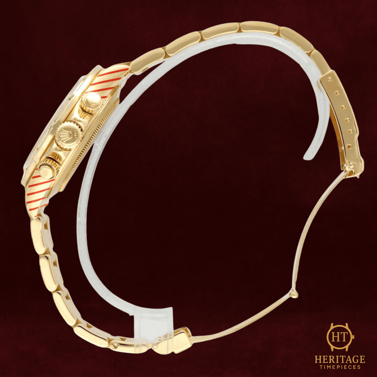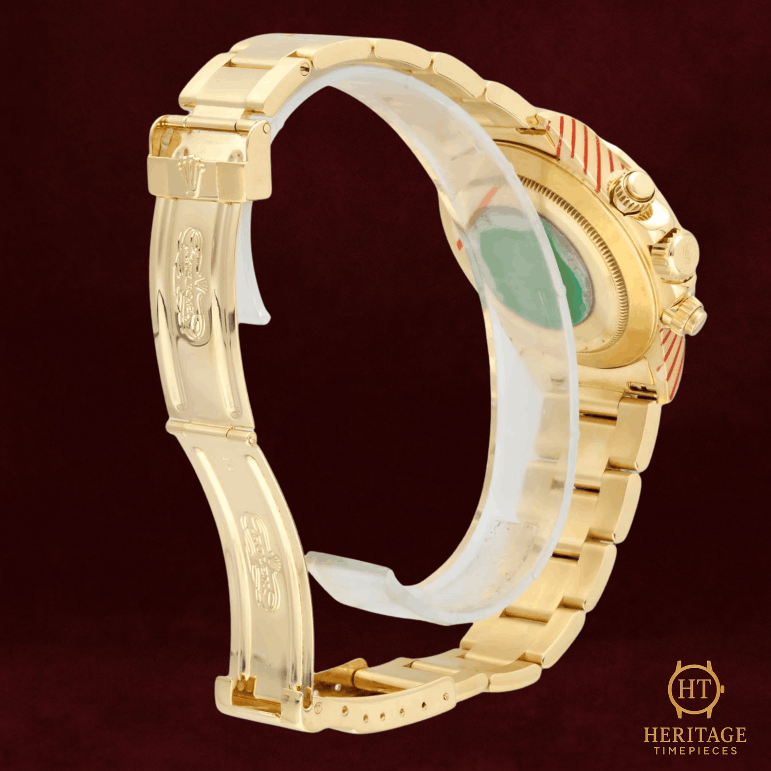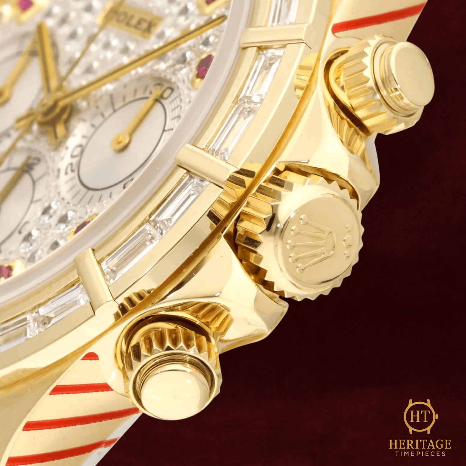 Heritage Narrative The Rolex Cosmograph Daytona reference 16568BR represents an extraordinary intersection of high watchmaking and haute joaillerie. Crafted in 18k yellow gold and powered by the celebrated Zenith-based automatic chronograph movement, this reference belongs to the revered generation of Daytona models produced during the 1990s. What distinguishes this example is its exceptional gem-setting: a pavé diamond dial framed by a factory-set baguette diamond bezel, complemented by ruby hour markers that introduce a subtle yet striking contrast. The result is a Daytona that balances technical pedigree with remarkable decorative artistry — a rare and unmistakably luxurious interpretation of Rolex’s most iconic chronograph. Technical Specifications Reference:16568BR Year:1995 Movement:Rolex automatic chronograph movement based on Zenith El Primero Case:40 mm case in 18k yellow gold Bezel:Factory-set baguette diamond bezel in 18k yellow gold Crystal:Scratch-resistant sapphire crystal Dial / Hands:Pavé diamond dial with ruby hour markers and chronograph sub-dials Bracelet / Clasp:18k yellow gold bracelet with folding deployant clasp Water resistance:100 m (manufacturer specification) Condition & Inclusions Overall grade:Pre-owned Service status:Movement tested and functioning correctly Set:Watch only Shipping & Logistics Stored off-site and shipped fully insured within 1–3 business days.Worldwide shipping available; buyer responsible for any import duties or taxes. Shipping & Returns Complimentary insured worldwide shipping and a 14-day return window (watch must be returned in the same condition supplied). Each timepiece is authenticated, time-tested, and professionally prepared prior to dispatch. All shipments include secure packaging, tracking, and full insurance coverage.