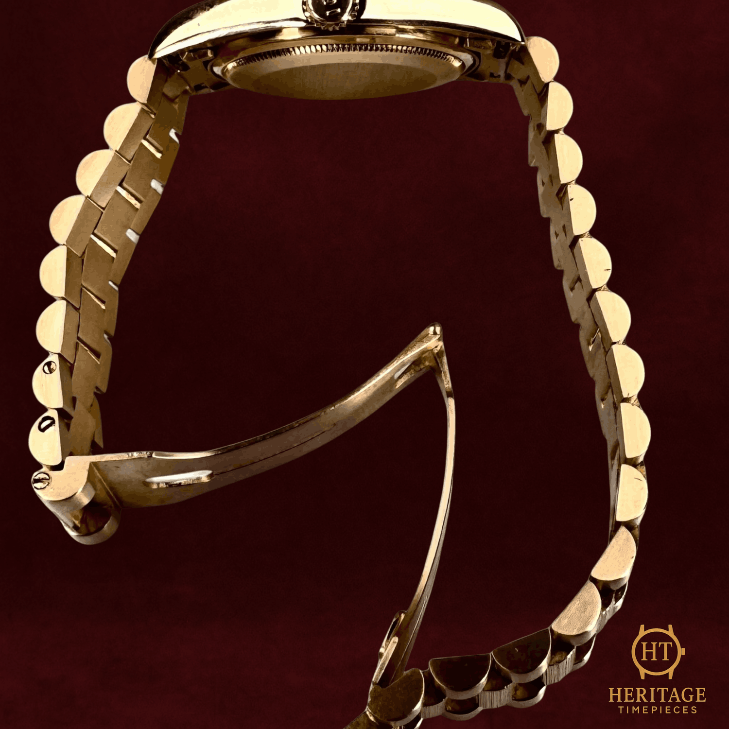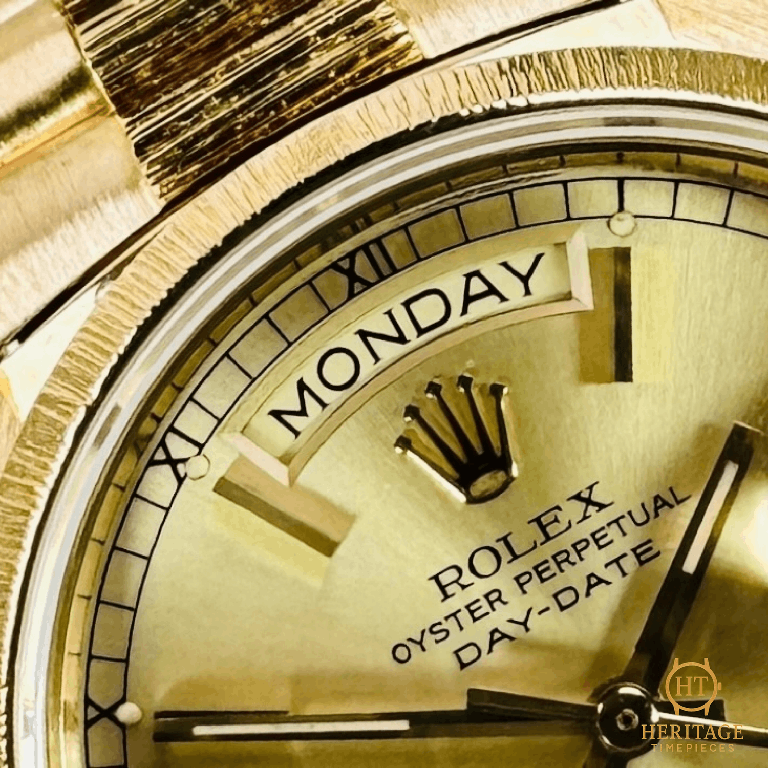 Heritage Narrative Introduced in 1956, the Rolex Day-Date was the first wristwatch to display both the day of the week spelled out in full and the date, instantly changing at midnight. Reserved exclusively for precious metals, the Day-Date quickly became a symbol of achievement and authority, earning its legendary nickname: “The President.” The reference 18078 represents one of the most distinctive executions within the Day-Date lineage. Produced during the late 1970s and 1980s, it features Rolex’s iconic Bark finish, applied by hand to both the bezel and the center links of the President bracelet. This textured finish, inspired by the natural surface of tree bark, adds depth and character while remaining unmistakably Rolex. This example is crafted entirely in solid 18k yellow gold and fitted with an original champagne dial, preserving the classic Day-Date aesthetic. The 36 mm Oyster case houses Rolex’s automatic movement with quickset date functionality, protected by a sapphire crystal. Elegant yet unconventional, the Bark-finish Day-Date stands apart as a bold expression of vintage Rolex design. Technical Specifications Reference:18078 Movement:Rolex automatic self-winding movement, chronometer-certified, day and quickset date functions Case:36 mm solid 18k yellow gold Oyster case, screw-down crown Bezel:18k yellow gold Bark-finish bezel Crystal:Scratch-resistant sapphire crystal Dial / Hands:Original champagne dial with gold hour markers and matching gold hands Bracelet / Clasp:18k yellow gold President bracelet with Bark-finish center links and concealed Crown clasp Water resistance:100 m / 330 ft (factory rating) Condition & Inclusions Overall grade:Pre-owned — excellent condition Service status:Movement tested and performing within Rolex specifications Set:Original Rolex box and booklets included Shipping & Logistics Stored off-site and shipped fully insured within 1–3 business days.Worldwide shipping available; buyer responsible for any import duties or taxes. Shipping & Returns Complimentary insured worldwide shipping and a 14-day return window (watch must be returned in the same condition supplied). Each timepiece is authenticated, inspected, and professionally prepared prior to dispatch. All shipments include secure packaging, tracking, and full insurance coverage.