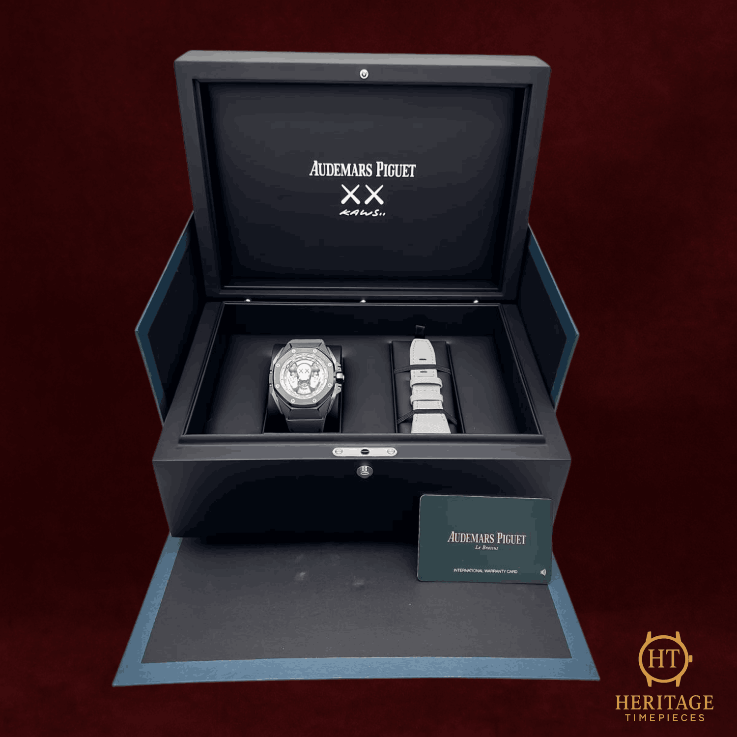 Heritage Narrative The Audemars Piguet Royal Oak Concept Tourbillon “KAWS” is a highly exclusive limited-edition timepiece created in collaboration with contemporary artist KAWS. This model represents the intersection of avant-garde watchmaking and modern art, pushing the Royal Oak Concept line to its most expressive form. Housed in a 43 mm titanium case, the watch showcases an openworked architecture that places the tourbillon at the center of attention. The monochromatic grey palette, combined with sculptural elements inspired by KAWS’ visual language, gives the timepiece a bold yet restrained presence. The absence of traditional numerals reinforces its conceptual nature, allowing the movement and artistic details to take precedence. Powered by a hand-wound mechanical movement, the watch features a visible tourbillon, skeletonized construction, and a power reserve indicator, all visible through the sapphire crystal and transparent caseback. Despite its conceptual design, the watch maintains a robust 100-meter water resistance, underscoring Audemars Piguet’s commitment to technical performance alongside artistic experimentation. Offered new and unworn as a full set, this Royal Oak Concept Tourbillon stands as a collector-grade piece, produced in strictly limited numbers and representing one of the most daring collaborations in modern haute horlogerie. Technical Specifications Brand:Audemars Piguet Model:Royal Oak Concept Limited Edition Tourbillon “KAWS” Reference:26656TI.GG.D019VE.01 Movement:Manual-winding mechanical movement Functions:TourbillonPower reserve indicator Case:43 mm titanium case Bezel:Titanium Dial:Grey openworked dialNo numeralsSkeletonized construction Crystal:Sapphire crystalSapphire caseback Bracelet / Strap:Grey calfskin leather strap Clasp:Titanium folding clasp Water Resistance:100 m Condition & Inclusions Overall Condition:New Set:Full set — includes box and papers Warranty:Manufacturer warranty included Shipping & Logistics The watch is stored securely and shipped fully insured within 1–3 business days. Worldwide shipping is available. Any applicable import duties or taxes are the responsibility of the buyer. Shipping & Returns Complimentary insured worldwide shipping and a 14-day return window. Each timepiece is authenticated, time-tested, and professionally prepared prior to dispatch. Secure packaging, tracking, and full insurance are included with every shipment.