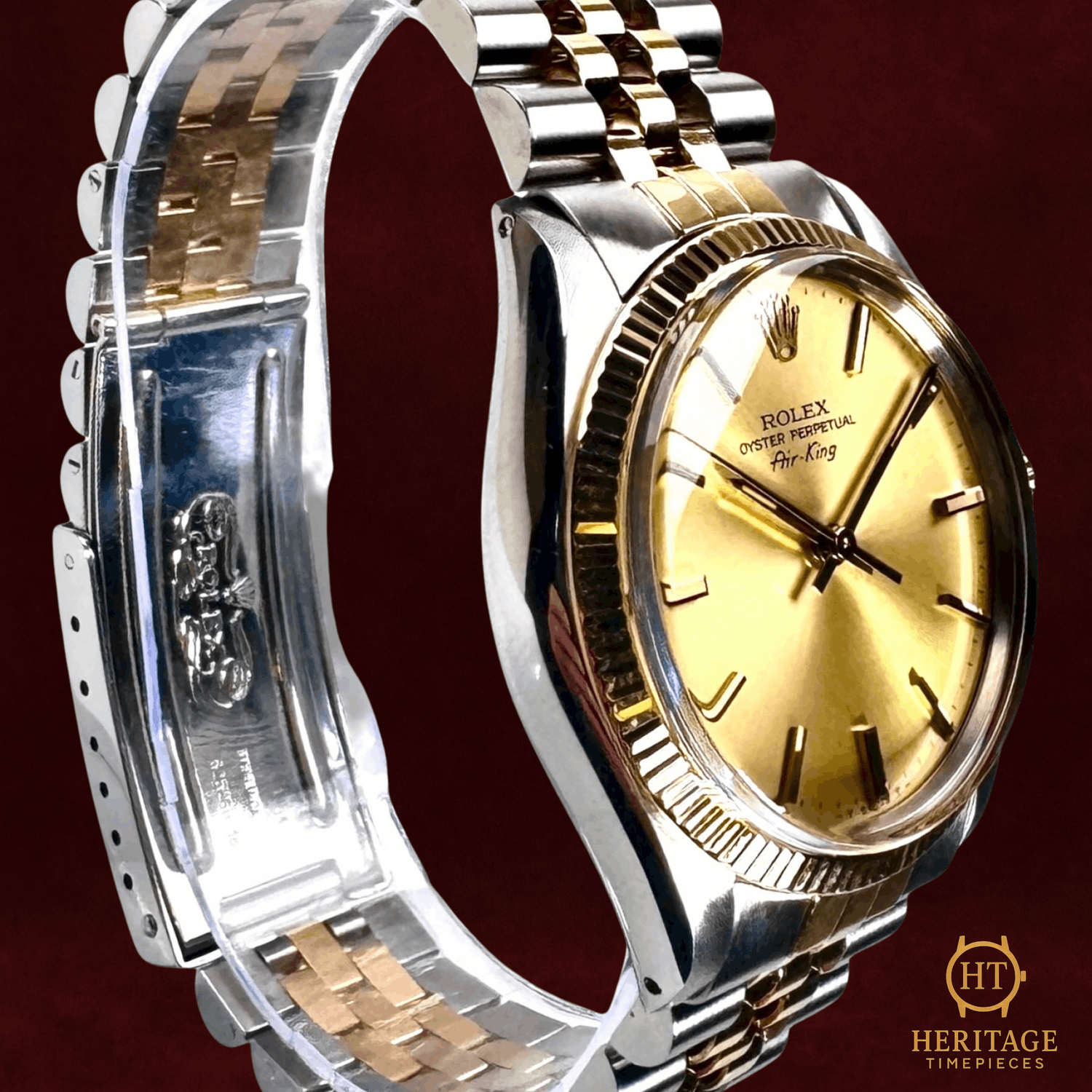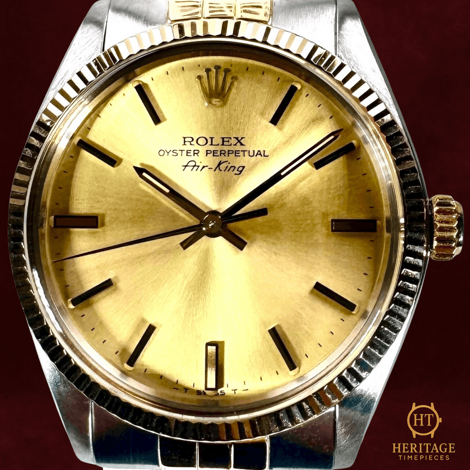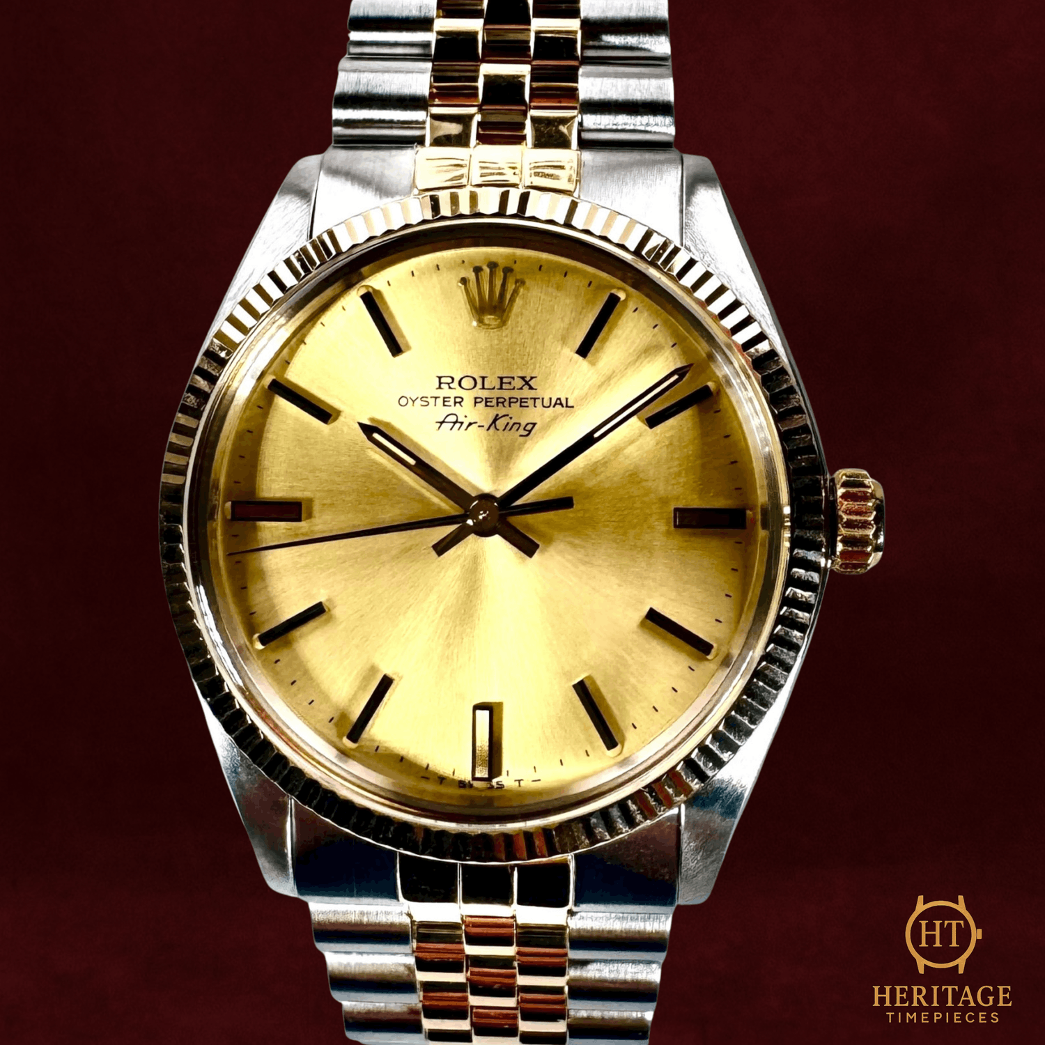 Heritage Narrative The Rolex Air-King is one of the brand’s most enduring classic lines, appreciated for its clean proportions, understated elegance, and everyday wearability. Reference 5501 offers a distinctive twist on that simplicity, pairing the traditional 34 mm Air-King profile with two-tone construction and a fluted gold bezel, giving the watch a more dress-oriented and vintage-correct character. This example features a champagne dial with gold index hour markers, a timeless combination that suits the warm tones of the 18kt yellow gold fluted bezel. The acrylic crystal reinforces its vintage identity, adding the softer profile and period feel collectors value. The result is a balanced and refined watch that wears comfortably and discreetly while still offering unmistakable Rolex presence. Powered by an automatic movement and fitted to a two-tone Jubilee bracelet, the watch maintains the classic Rolex formula: reliable, elegant, and designed to be worn. Presented in mint condition and accompanied by a complete set, this is an appealing example for collectors seeking a vintage Rolex with traditional proportions and strong presentation. Technical Specifications Brand:Rolex Model:Air-King Reference:5501 Serial Number:810XXXX Movement:Rolex automatic movement Case:34 mm stainless steel case Bezel:Fluted 18kt yellow gold bezel Crystal:Acrylic crystal Dial / Hands:Champagne dial with gold index hour markersGold hands Bracelet:18kt yellow gold & stainless steel Jubilee braceletApprox. 7 1/2 in (adjustable) Condition & Inclusions Overall Condition:Pre-owned — mint condition Service Status:Movement tested and functioning correctly Set:Complete set including: Box, Certificate, Booklets Shipping & Logistics The watch is stored securely and shipped fully insured within 1–3 business days. Worldwide shipping is available. Any applicable import duties or taxes are the responsibility of the buyer. Shipping & Returns Complimentary insured worldwide shipping and a 14-day return window. Each timepiece is authenticated, time-tested, and professionally prepared prior to dispatch. Secure packaging, tracking, and full insurance are included with every shipment.