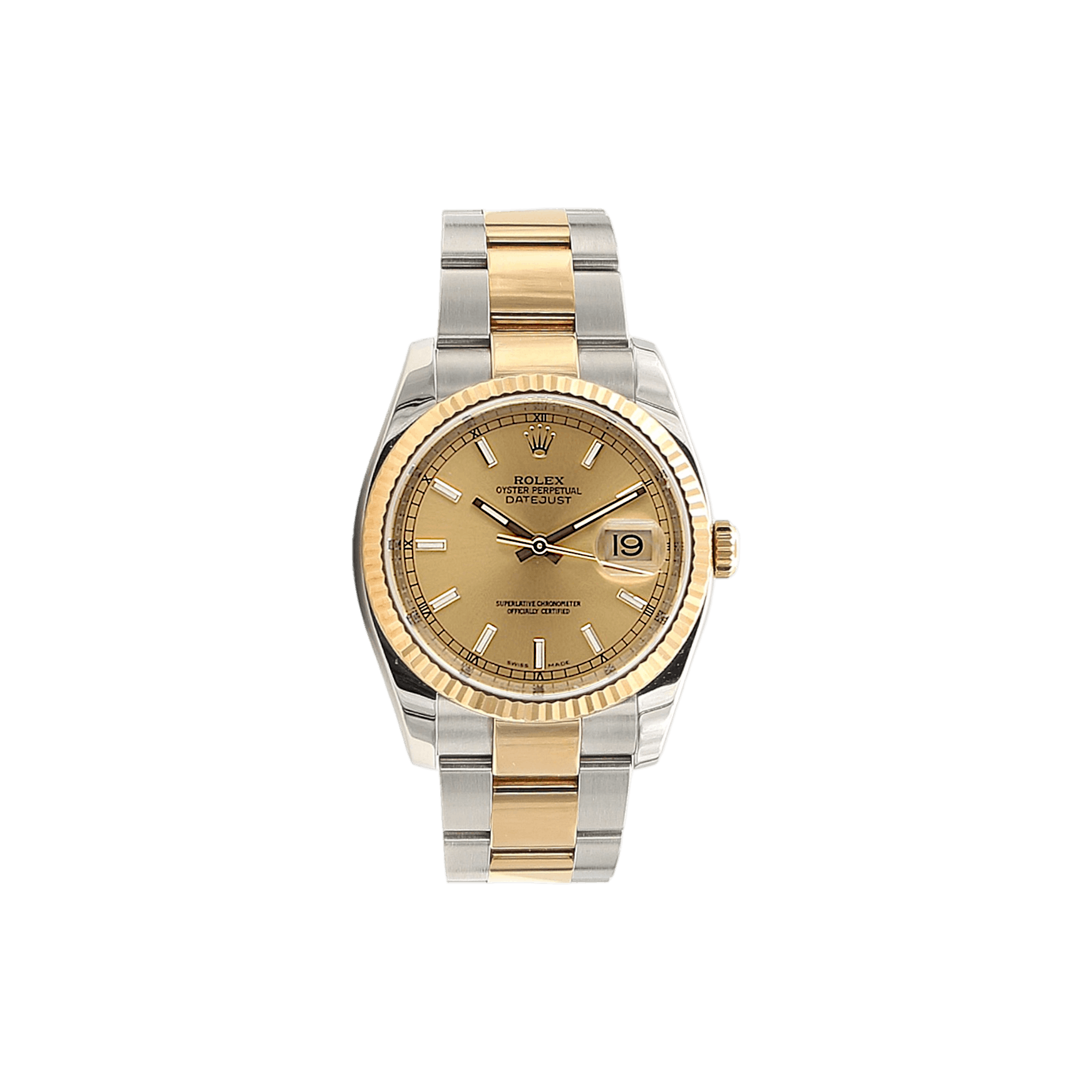 Zu verkaufen bei Debonar Watches: gebrauchte Rolex Datejust 116233, in ausgezeichnetem Zustand, mit einer eleganten champagnerfarbenen Zifferblatt, im vollständigen Set, an einem Oyster-Armband. Die zweifarbige Konstruktion der 36mm Referenz 116233, gekrönt von einer Lünette, die einen Hauch von Extravaganz zeigt, ist wirklich die perfekte Analogie zum Uhrmacher selbst. Die Stärke des Stahls und der Prunk des Goldes sagen alles über eine Luxusuhr aus, die für den täglichen Gebrauch gedacht ist, abgerundet mit einem Rand, der das Auge anzieht, ohne zu überladen. Es gibt wirklich nichts, was so klar „Rolex“ sagt. Ein bisschen von ihrer Geschichte: Die Rolex Datejust (inspiriert von der Rolex Bubbleback) wurde 1945 eingeführt, um das 40-jährige Jubiläum von Rolex zu feiern. Die Datejust ist eines der frühesten Rolex-Modelle, das bis heute überlebt hat. Seit ihrer Premiere im Jahr 1945, einem revolutionären Launch, der die Marke fest auf die Landkarte setzte, ist sie seit drei Vierteln eines Jahrhunderts an der Spitze der Bestsellerliste des Unternehmens geblieben. Die Referenz 162XX-Serie der Datejust-Uhren von Rolex tauchte erstmals 1988 auf, als Ersatz für die relativ kurzlebige Referenz 160XX-Reihe.