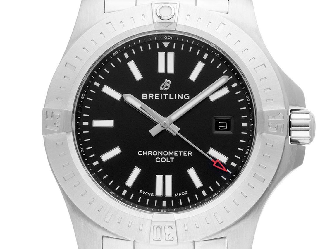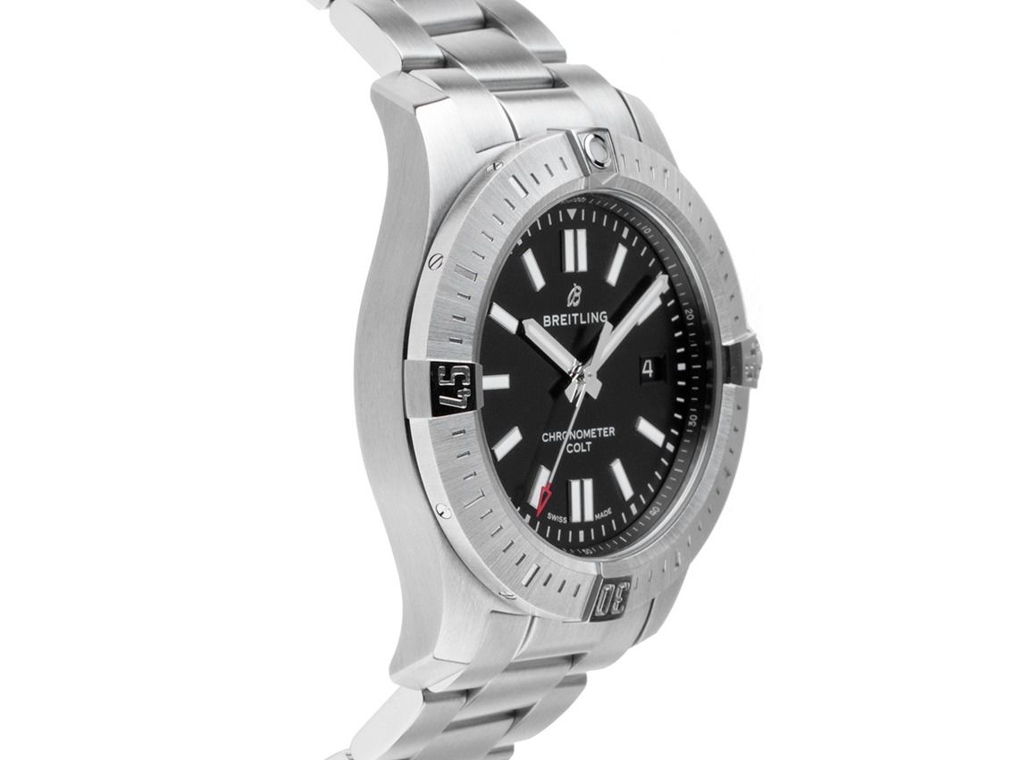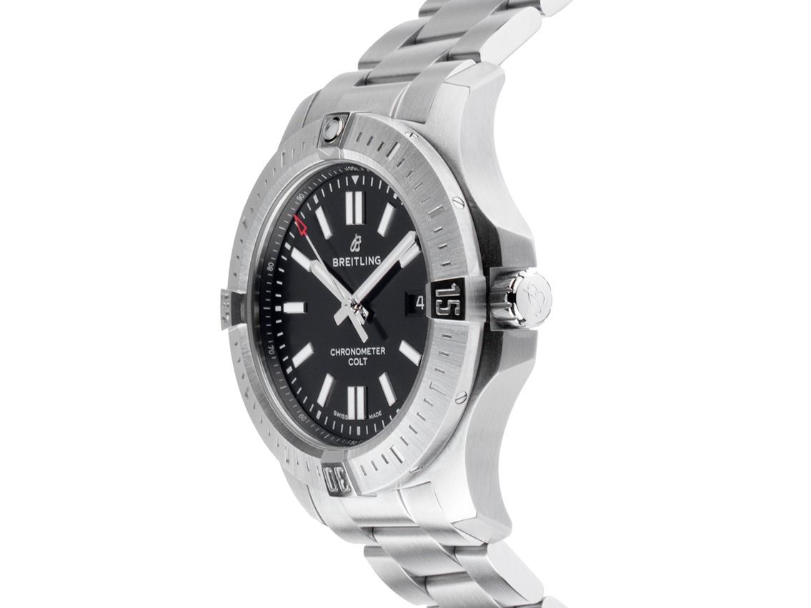 Breitling Colt Stahl Automatik Armband StahlGehäuse Edelstahl satiniert, Gehäusedurchmesser ohne Krone 44mm, Gehäusehöhe 11,5mm. Lünette Edelstahl satiniert mit 60-Minuten Skala und Leuchtpunkt, einseitig drehbar. Armband Edelstahl satiniert, Sicherheitsfaltschließe Edelstahl mit Hersteller-Logo. Zifferblatt schwarz mit aufgesetzten Edelstahl Indexen und Edelstahl Zeigern. Uhrwerk Automatik, Chronometer mit Zeugnis, Manufakturkaliber Breitling 17 mit 26 Edelsteinen. Anzeige von Stunde, Minute und Sekunde über Zeiger aus der Mitte mit Sekundenstopp zur sekundengenauen Einstellung der Uhrzeit, Datumsanzeige mit Schnellverstellung bei 3 Uhr. Saphirglas kratzfest. Krone verschraubbar mit Flankenschutz und Hersteller-Logo. Boden Edelstahl verschraubt und graviert. Gewicht der Uhr inklusive Armband 176g, Länge des Armbandes inklusive Gehäuse 170mm. Referenznummer: A17388101B1A1, Gehäusenummer: 7016XXX, ID: P284532000426HW-4700, Artikelnummer: 10000085519. Mit Gangkontrolle und kompletter äußerlicher Aufarbeitung von April 2026. Original Breitling Box mit Umkarton und Garantie Papiere von Dezember 2018 sowie Beschreibung und Watchregister Auszug von April 2026, The Watch Register Zertifikat / ohne Eintrag (Internationale Datenbank für verlorene oder gestohlene Uhren), Full Set. Fast nicht getragen. Wie Neu. Lieferzeit sofort.