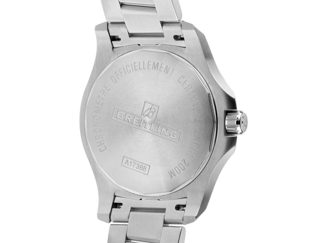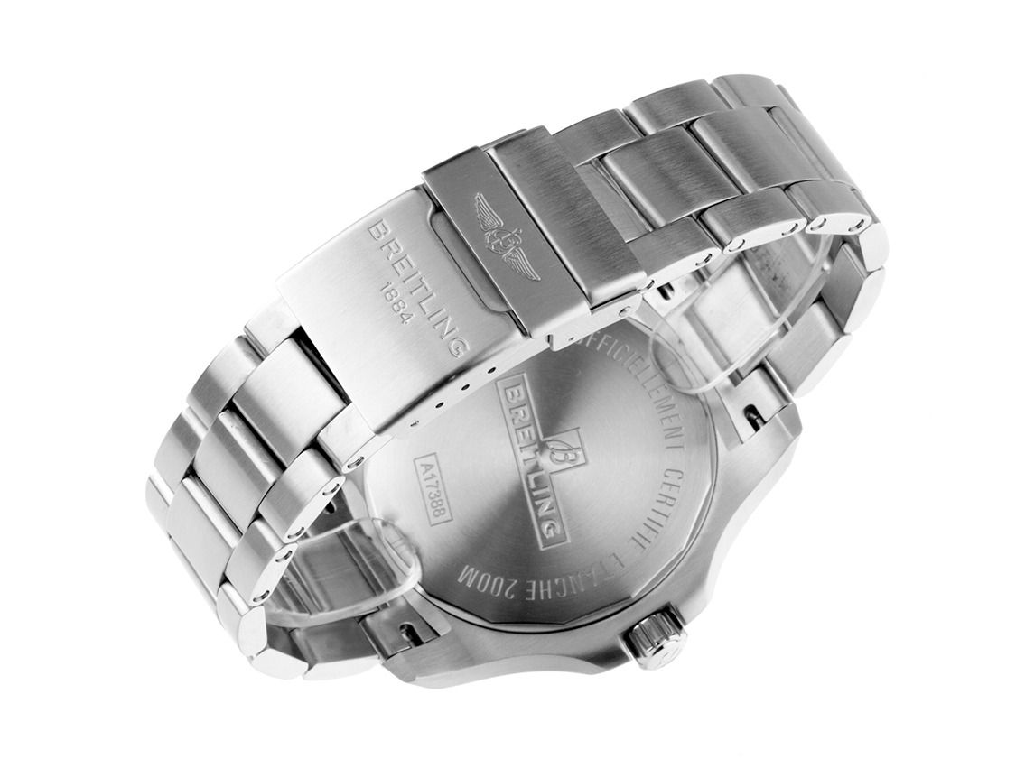 Gehäuse aus satiniertem Edelstahl, Gehäusedurchmesser ohne Krone 44mm, Gehäusehöhe 11,5mm. Lünette aus satiniertem Edelstahl mit 60-Minuten-Skala und Leuchtpunkt, einseitig drehbar. Armband aus satiniertem Edelstahl, Sicherheitsfaltschließe aus Edelstahl mit Hersteller-Logo. Zifferblatt schwarz mit aufgesetzten Edelstahl-Indizes und Edelstahlzeigern. Uhrwerk Automatik, Chronometer mit Zeugnis, Manufakturkaliber Breitling 17 mit 26 Edelsteinen. Anzeige von Stunde, Minute und Sekunde über Zeiger aus der Mitte mit Sekundenstopp zur sekundengenauen Einstellung der Uhrzeit, Datumsanzeige mit Schnellverstellung bei 3 Uhr. Saphirglas kratzfest. Krone verschraubbar mit Flankenschutz und Hersteller-Logo. Boden aus Edelstahl, verschraubt und graviert. Gewicht der Uhr inklusive Armband 176g, Länge des Armbandes inklusive Gehäuse 170mm. Referenznummer: A17388101B1A1, Gehäusenummer: 7016XXX, ID: P284532000426HW-4700, Artikelnummer: 10000085519. Mit Gangkontrolle und kompletter äußerlicher Aufarbeitung von April 2026. Original Breitling Box mit Umkarton und Garantieunterlagen von Dezember 2018 sowie Beschreibung und Watchregister-Auszug von April 2026, The Watch Register Zertifikat / ohne Eintrag (Internationale Datenbank für verlorene oder gestohlene Uhren), Full Set. Fast nicht getragen. Wie neu. Lieferzeit sofort.