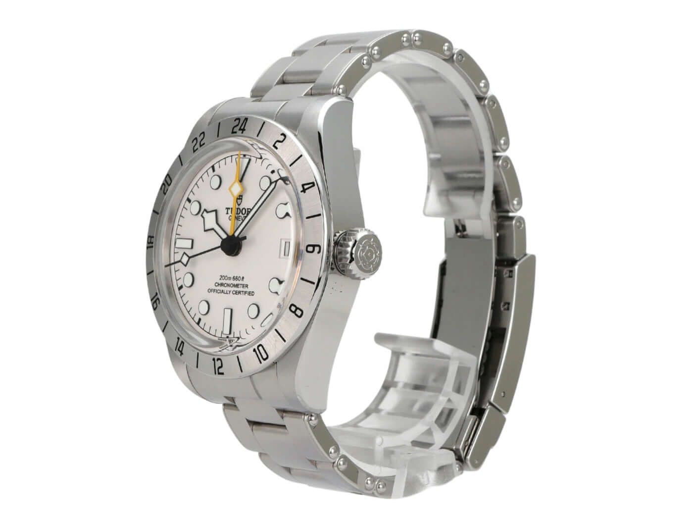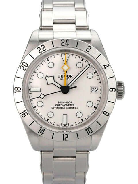 Tudor Black Bay Pro M79470-0004Case made of polished and satin-finished stainless steel, case diameter 39 mm, fixed stainless steel bezel with 24-hour scale, stainless steel bracelet with folding clasp, white (opal-colored) dial with applied luminous indices, luminous hands, automatic, Tudor manufacture caliber MT5652, date, GMT, 70-hour power reserve, chronometer, sapphire crystal, screw-down crown, screwed and engraved stainless steel case back, water-resistant up to 20 bar.
