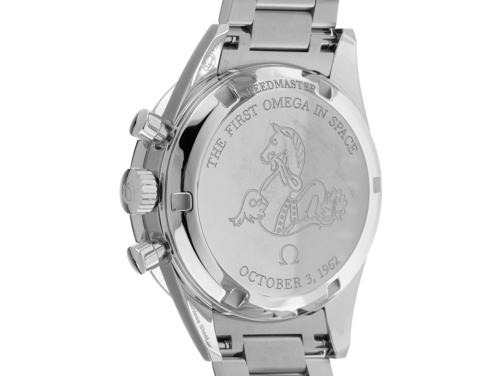 Gehäuse Edelstahl poliert und satiniert, Gehäusedurchmesser ohne Krone 39,7mm, Gehäusehöhe 13,3mm. Lünette Edelstahl mit schwarzem Inlay und Tachymeterskala. Armband Edelstahl poliert und satiniert, Sicherheitsfaltschließe Edelstahl mit Hersteller-Logo. Zifferblatt grau-blau mit Leuchtindexen und Edelstahl Leuchtzeigern. Uhrwerk Handaufzug, Chronograph, Chronometer mit Zeugnis, Omega Manufakturkaliber 3861, Gangreserve ca. 50 Stunden. Anzeige von Stunde und Minute über Zeiger aus der Mitte, kleine Sekunde mit Sekundenstopp zur sekundengenauen Einstellung der Uhrzeit bei 9 Uhr. Saphirglas kratzfest und gewölbt. Krone mit Hersteller-Logo. Boden Edelstahl verschraubt und graviert mit dem berühmten Seepferdchen-Medaillon und den Gravuren „THE FIRST OMEGA IN SPACE“ und „OCTOBER 3, 1962“. Gewicht der Uhr inklusive Armband 132g, Länge des Armbandes inklusive Gehäuse 195mm. Wasserdicht bis 5 ATM. Referenznummer: 310.30.40.50.06.001, ID: ST1160121480426H-8600, Artikelnummer: 10000085563. Original Omega Box mit Umkarton und Garantie Papiere von April 2026 sowie Beschreibung, Full Set. Ungetragen. Lieferzeit sofort.