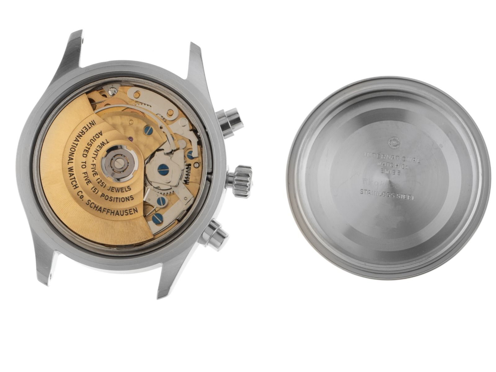 Gehäuse Edelstahl satiniert, Gehäusedurchmesser ohne Krone 39mm, Gehäusehöhe 14,7mm. Lünette Edelstahl glatt und satiniert. Armband Krokoleder schwarz mit Ziernaht, Anstoßbreite 20mm, Stiftschließe Edelstahl mit Hersteller-Logo. Zifferblatt schwarz mit weißen arabischen Ziffern und Edelstahlzeigern. Uhrwerk Automatik, Chronograph, IWC Kaliber 7922 mit 25 Edelsteinen. Anzeige von Stunde und Minute über Zeiger aus der Mitte, kleine Sekunde mit Sekundenstopp zur sekundengenauen Einstellung der Uhrzeit bei 9 Uhr, Wochentagsanzeige in Deutsch und Datumsanzeige mit Schnellverstellung bei 3 Uhr. Saphirglas kratzfest und gewölbt. Krone verschraubbar mit Hersteller-Logo. Boden Edelstahl verschraubt und graviert. Gewicht der Uhr inklusive Armband 90g. Referenznummer: IW3706, Baujahr: 1994, Gehäusenummer: 2667XXX, ID: P203842001225H-5900, Artikelnummer: 10000083600. Mit Gangkontrolle und kompletter äußerlicher Aufarbeitung von Dezember 2025. Original IWC Box mit Umkarton und Watchregister Auszug von Dezember 2025, The Watch Register Zertifikat / ohne Eintrag (Internationale Datenbank für verlorene oder gestohlene Uhren).