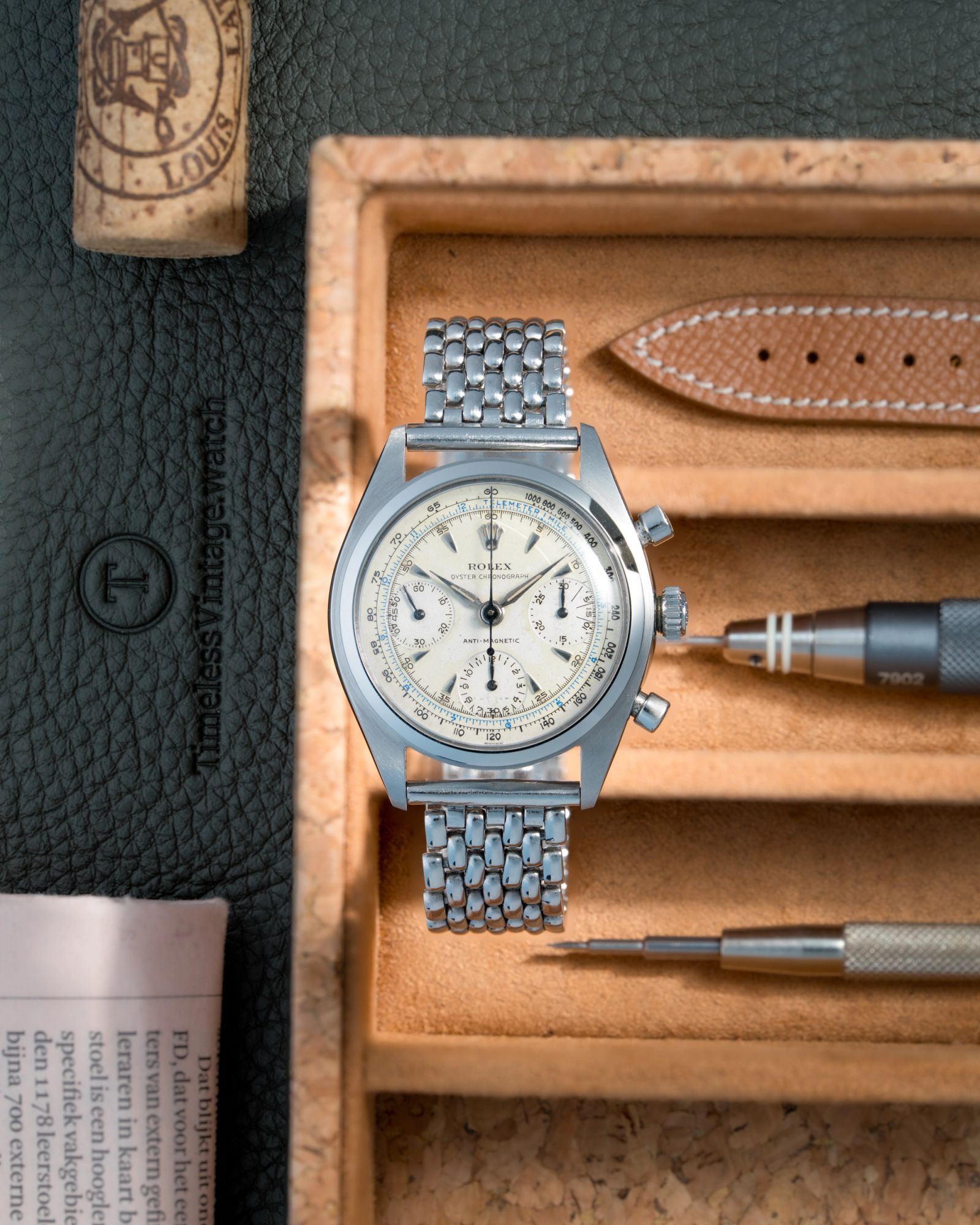 The watch comes with a Timeless Vintage Watches leather calf strap, as well as a steel Rolex bracelet. The bracelet is secondary to the watch itself, yet still worth mentioning due to its rarity. It is a rare “Beads of Rice” bracelet from the early 1950s, made for Rolex. It features straight end links and offers excellent comfort on the wrist and looks outstanding.