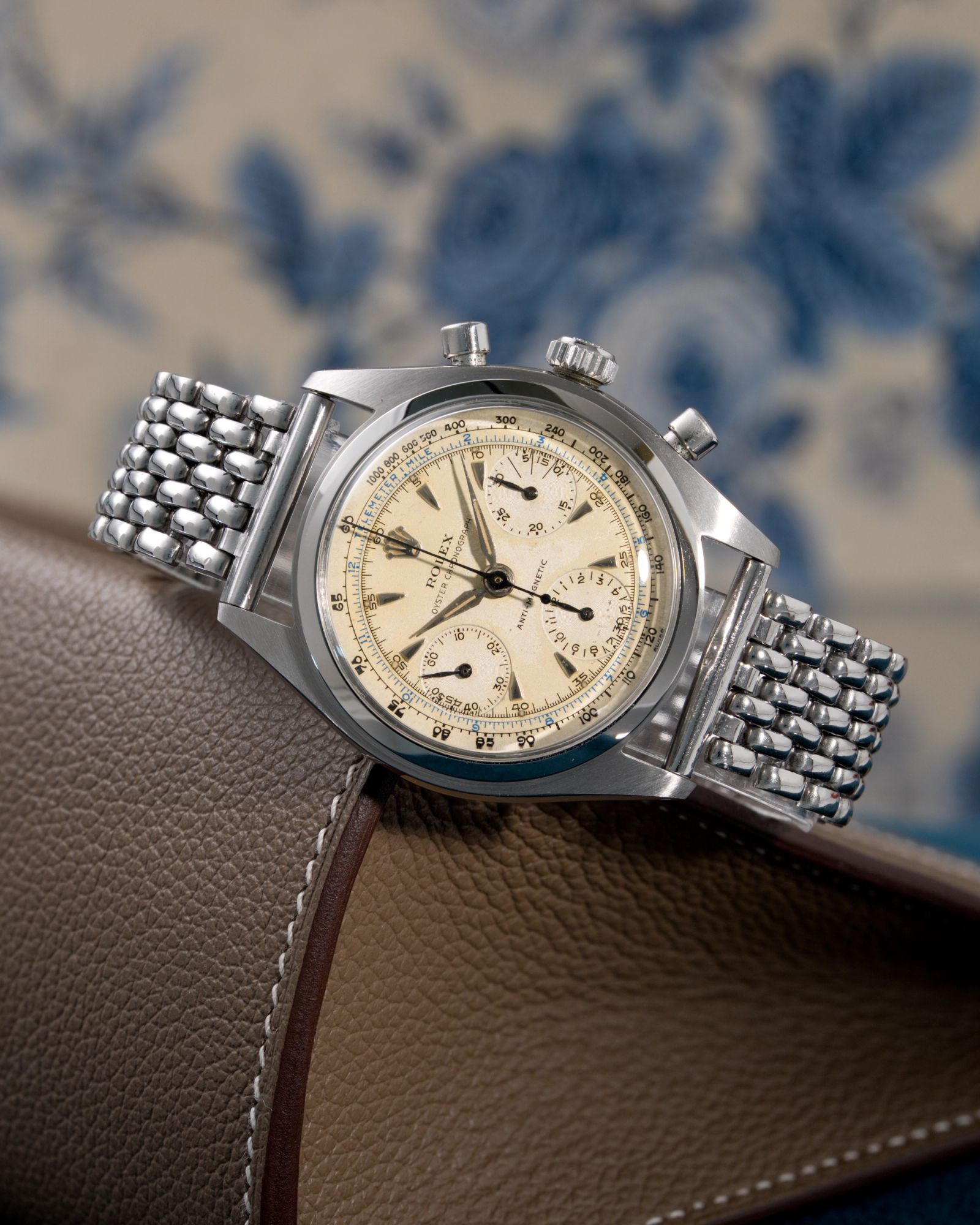 The cream-coloured dial has developed a beautiful patina over time. It features a blue telemeter scale and a tachymeter, a combination once used by racing drivers to measure both distance and speed.