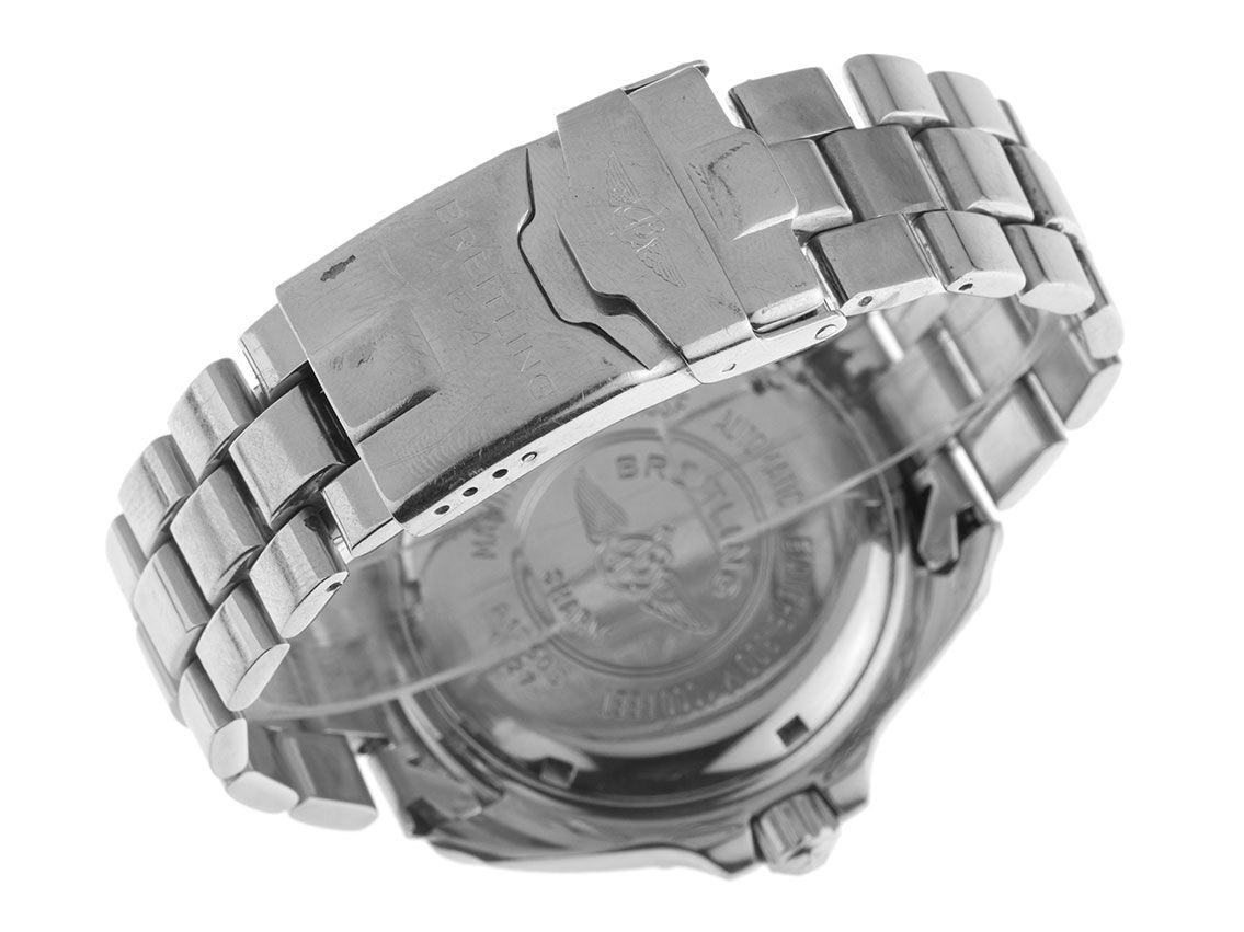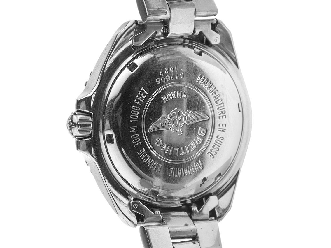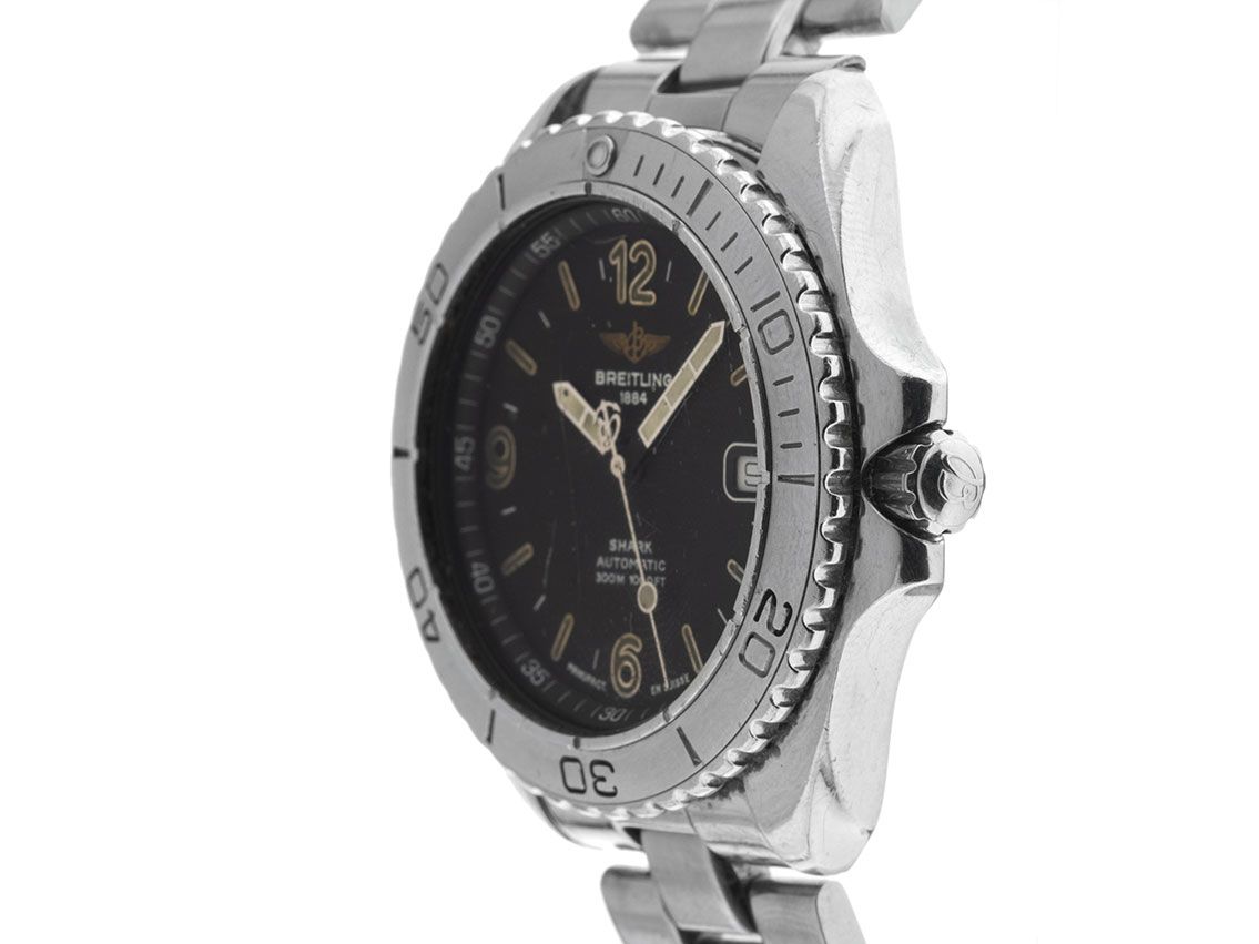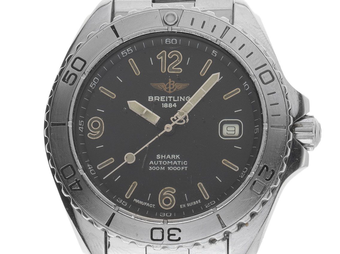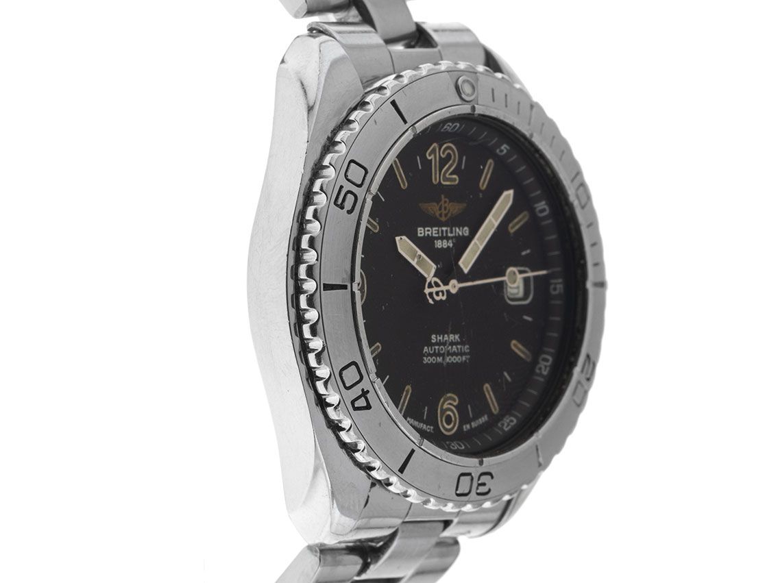 Breitling Shark Stahl Quarz Armband Stahl Gehäuse Edelstahl poliert, Gehäusedurchmesser ohne Krone 42mm, Gehäusehöhe 12,1mm. Lünette Edelstahl satiniert mit 60-Minuten Skala, einseitig drehbar. Armband Edelstahl poliert, Sicherheitsfaltschließe Edelstahl mit Hersteller-Logo. Zifferblatt schwarz mit Indexen und arabischen Ziffern sowie Edelstahl Zeigern. Uhrwerk Quarz, Kaliber Breitling. Anzeige von Stunde, Minute und Sekunde über Zeiger aus der Mitte mit Sekundenstopp zur sekundengenauen Einstellung der Uhrzeit, Datumsanzeige mit Schnellverstellung bei 3 Uhr. Saphirglas kratzfest. Krone verschraubbar mit Flankenschutz und Hersteller-Logo. Boden Edelstahl verschraubt und graviert. Gewicht der Uhr inklusive Armband 140g, Länge des Armbandes inklusive Gehäuse 195mm. Referenznummer: A17605-108, Gehäusenummer: 1XXX, Baujahr: 1993, ID: P28298000426HW-3600, Artikelnummer: 10000085459. Original Breitling Box mit Umkarton und Garantie Papiere von Oktober 1993 sowie Beschreibung und Watchregister Auszug von April 2026, The Watch Register Zertifikat / ohne Eintrag (Internationale Datenbank für verlorene oder gestohlene Uhren). Original unpoliert, kann auf Wunsch kostenlos aufgearbeitet werden. Lieferzeit sofort. Inklusive certified pre owned Siegel / Uhrenpass mit einem Farbbild, der genauen Beschreibung sowie dem Wiederbeschaffungswert der Uhr über 3600,-€ und 1000 Tage Garantie ab Kaufdatum.