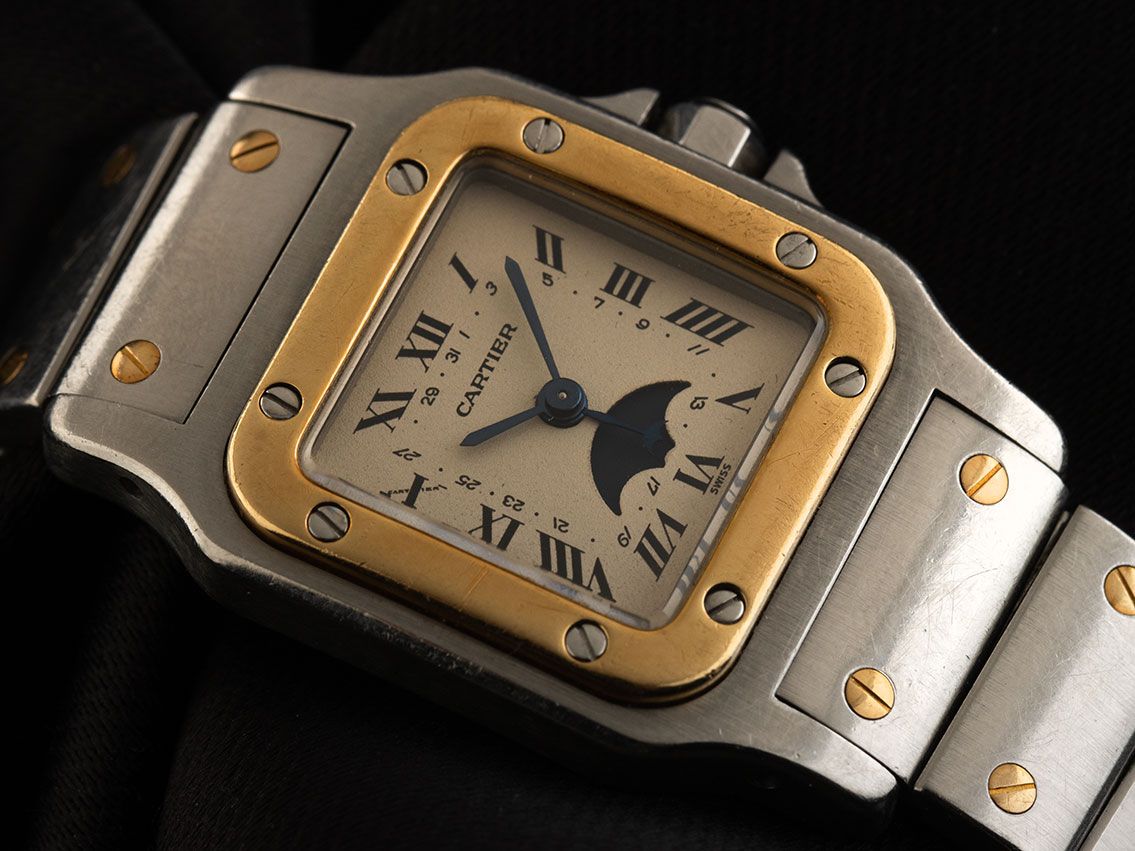 Cartier Santos PM kleines Modell Mondphase Stahl 18kt Gelbgold Quarz Armband Stahl 18kt GelbgoldGehäuse Edelstahl poliert und satiniert, rechteckig, Gehäusemaße ohne Krone (L x B x H) 35,5 x 23,6 x 6,1mm. Lünette 18kt Gelbgold 8-fach verschraubt und poliert. Armband Edelstahl satiniert mit 18kt Gelbgold Schrauben dekoriert, Faltschließe Edelstahl mit Hersteller-Logo. Zifferblatt cremeweiß mit schwarzen römischen Ziffern und gebläuten Zeigern. Uhrwerk quarzgesteuert, Cartier Manufakturkaliber 019 mit 7 Edelsteinen. Anzeige von Stunde und Minute über Zeiger aus der Mitte, Datumsanzeige über Zeiger mit Halbmond aus der Mitte, einstellbar über Drücker bei 4 Uhr, Mondphasenanzeige bei 6 Uhr. Saphirglas kratzfest. Krone mit blauem Spinell und Flankenschutz. Boden Edelstahl 8-fach verschraubt und graviert. Gewicht der Uhr inklusive Armband 56g, Länge des Armbandes inklusive Gehäuse 170mm. Referenznummer: 119902, Gehäusenummer: 02XXX, ID: P289070000426HW-7200, Artikelnummer: 10000085617. Original Cartier Box mit Garantie Papiere von April 1993 sowie Beschreibung und Watchregister Auszug von April 2026, The Watch Register Zertifikat / ohne Eintrag (Internationale Datenbank für verlorene oder gestohlene Uhren), inkl. Service Vita, Full Set. Original unpoliert, kann auf Wunsch kostenlos aufgearbeitet werden. Lieferzeit sofort.