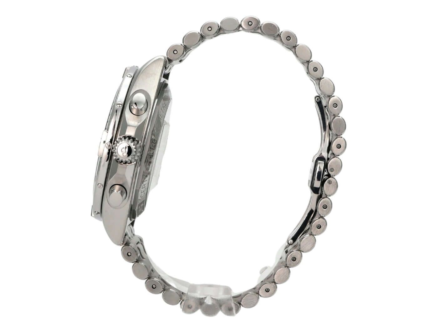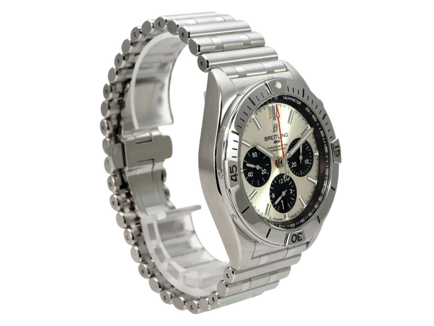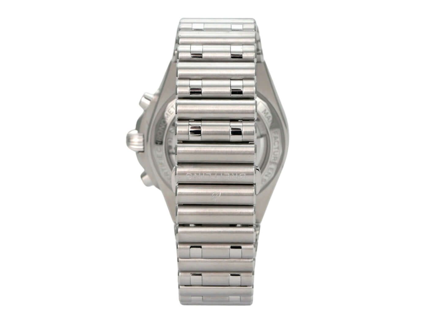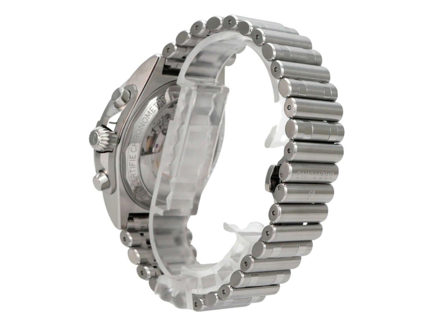 Gehäuse aus poliertem und satiniertem Edelstahl, Gehäusedurchmesser 42 mm, Gehäusehöhe 15,10 mm, polierte Edelstahl-Lünette, einseitig drehbar, Edelstahlarmband mit Faltschließe, silberfarbene Zifferblatt mit leuchtenden Indizes, leuchtenden Zeigern, schwarzen Totalisatoren, automatisches Werk, Breitling Manufaktur Kaliber 01 mit 47 Edelsteinen, 28.800 Schwingungen pro Stunde, ca. 70 Stunden Gangreserve, Datumsanzeige, Chronograph, Chronometer, doppelt entspiegelt, Saphirglas, Edelstahl-Gehäuseboden mit Sichtfenster, wasserdicht bis 20 bar.