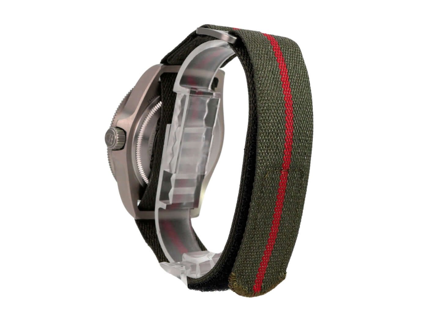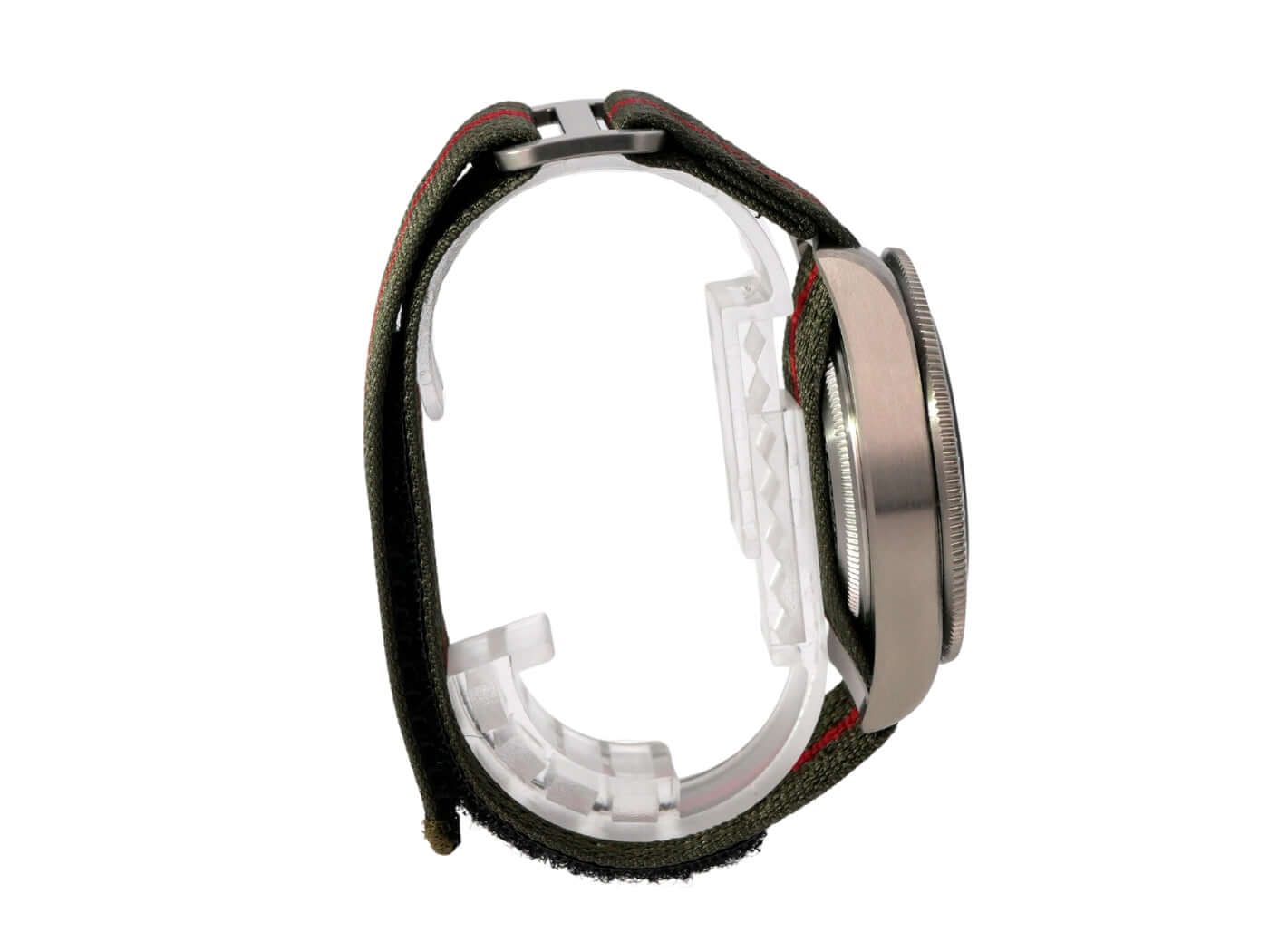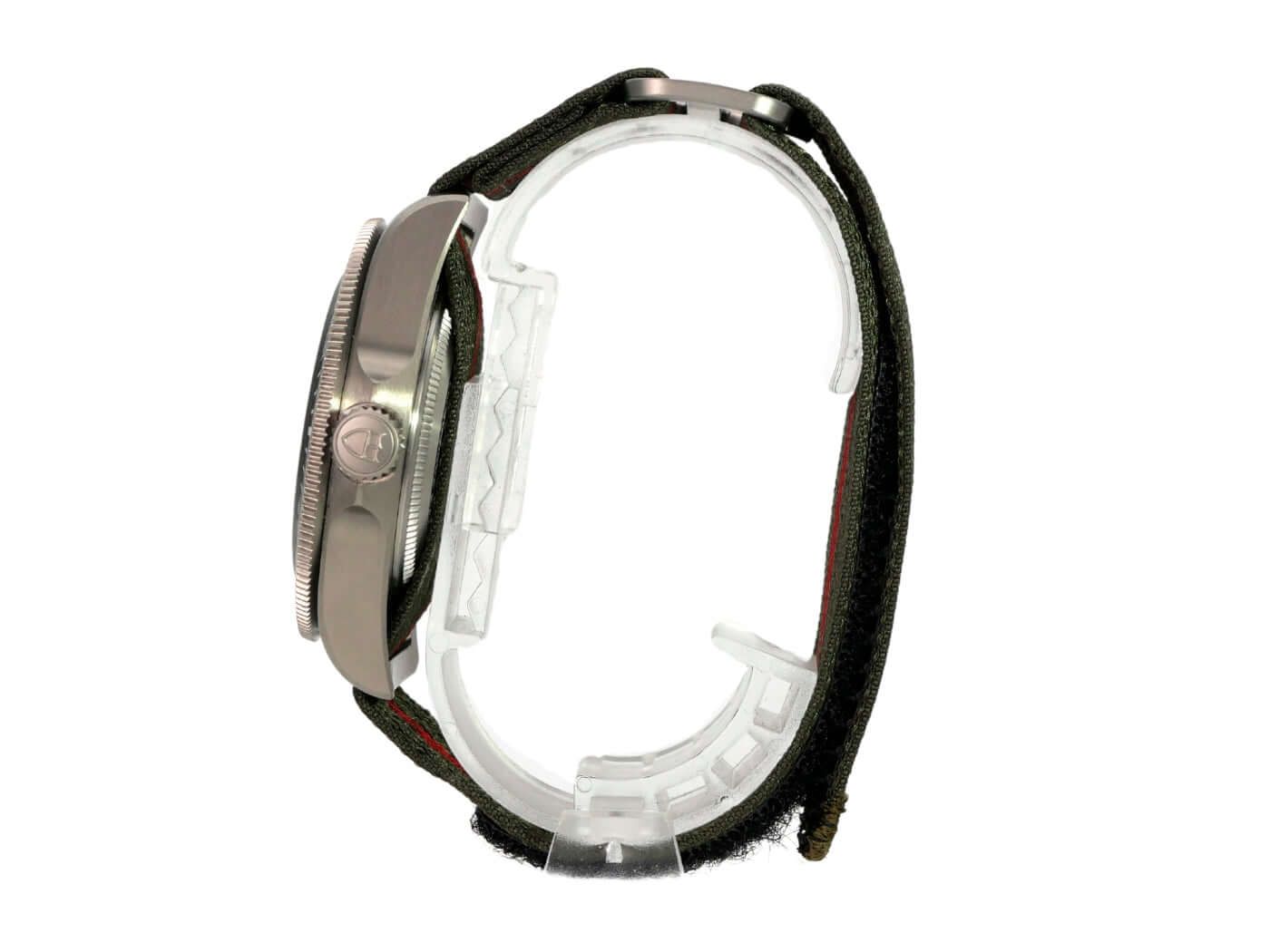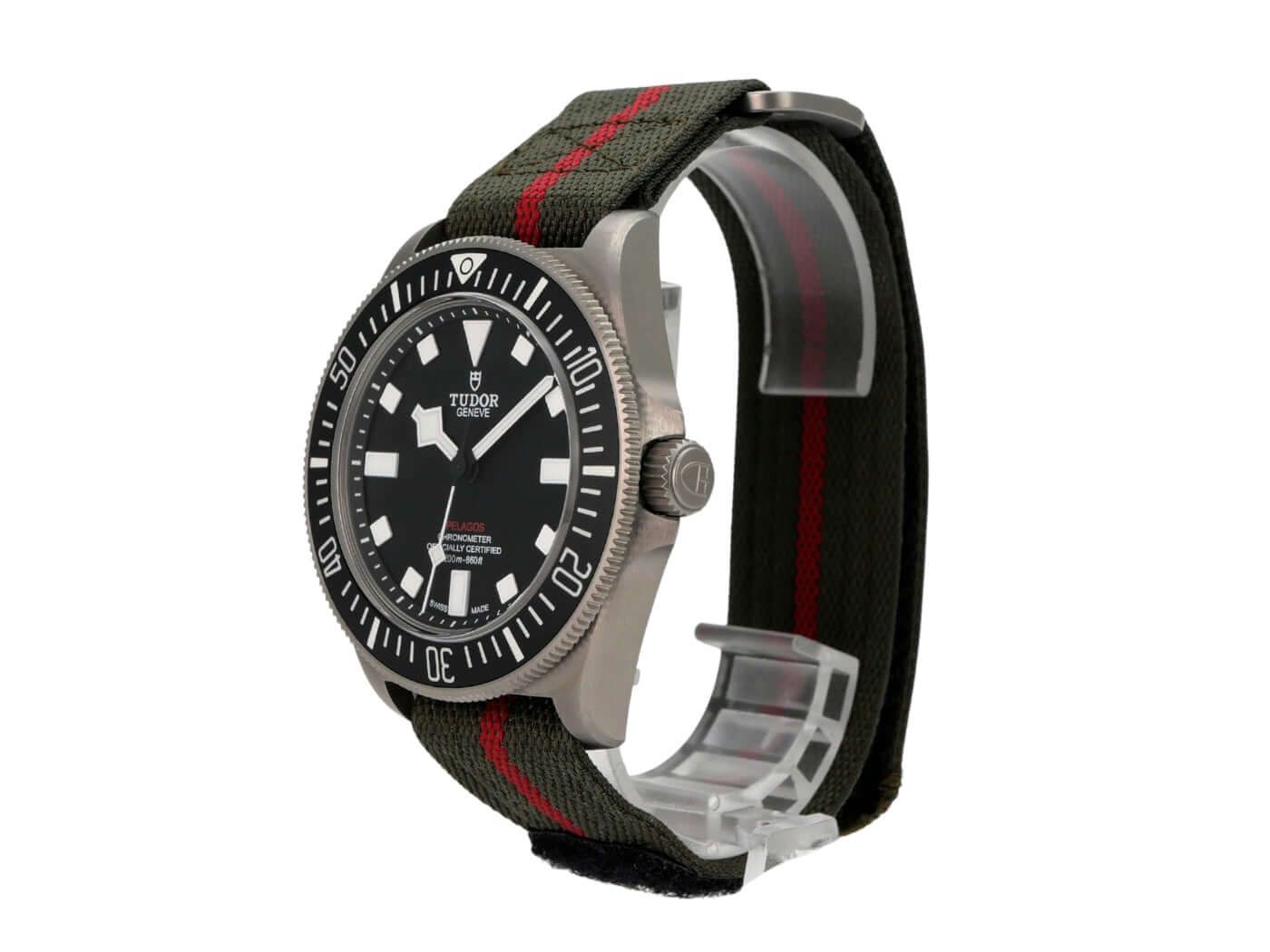 Tudor Pelagos FXD M25717N-0001Brushed titanium case, case diameter 42 mm, case height 13 mm, titanium bezel with black ceramic insert, 60-minute scale with luminous dot and rotatable, helium valve, green textile strap with Velcro closure, extra black rubber strap with pin buckle, black dial with applied luminous indices, luminous hands, automatic movement, Tudor MT5602, chronometer, sapphire crystal, screw-down crown with crown guards, screwed and engraved titanium case back, water-resistant up to 20 bar.