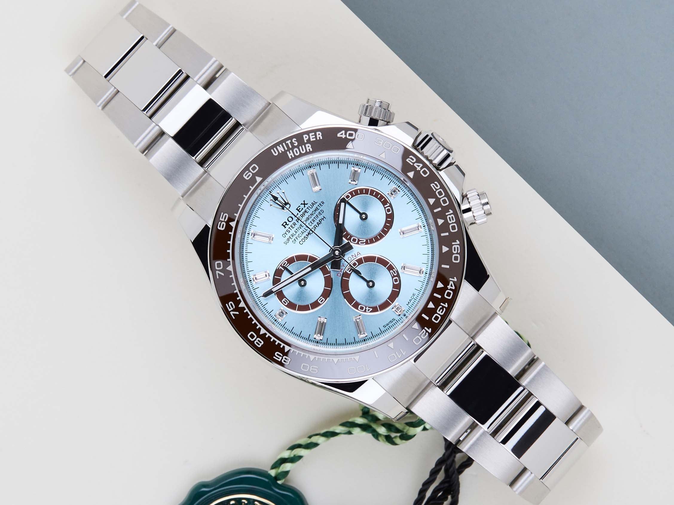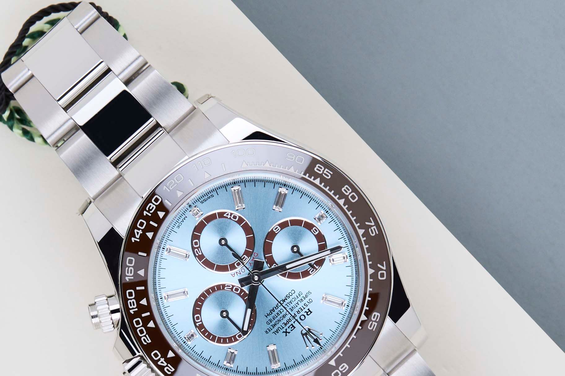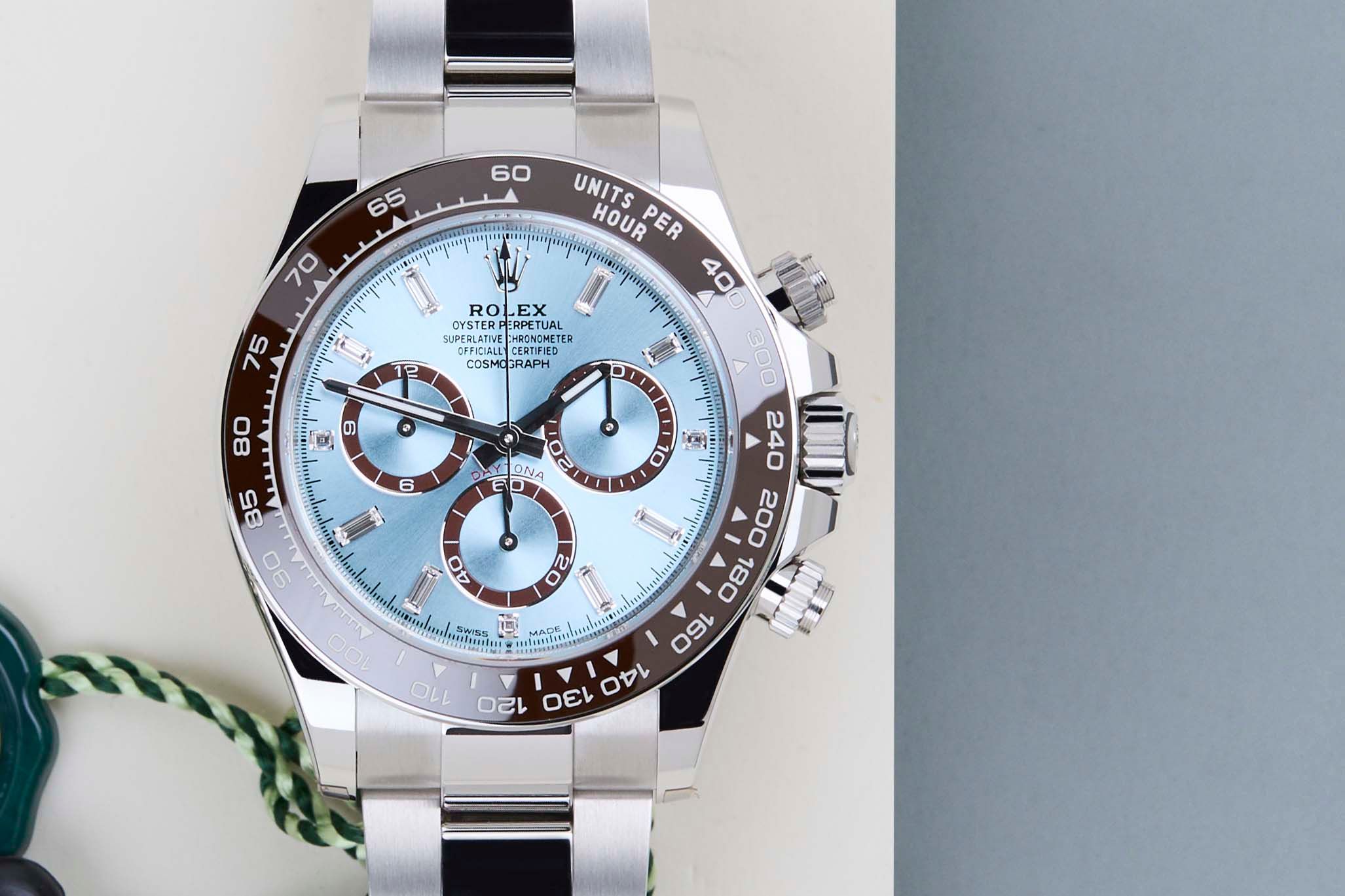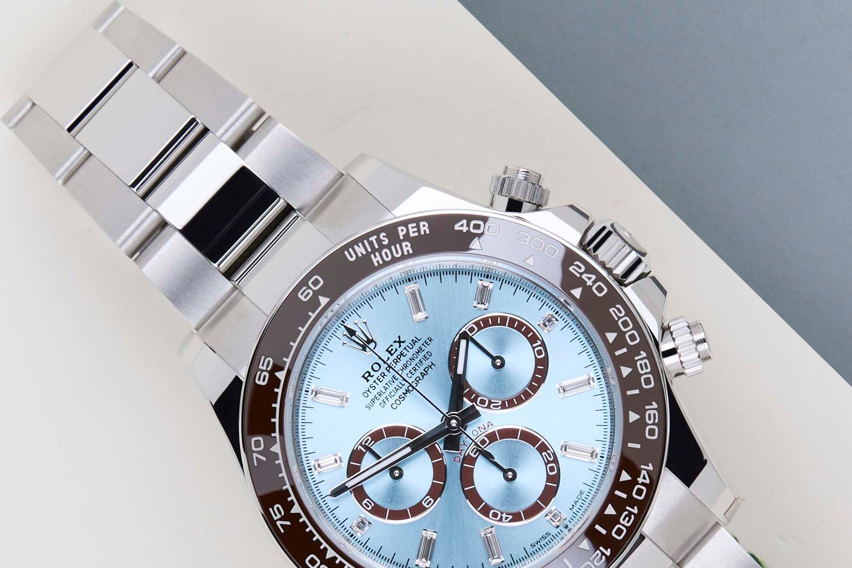 New & Unworn | Full Set | International Rolex Warranty Until April 2031The Rolex Cosmograph Daytona is considered one of the most popular models in the world. The reasons for this vary from the watch's history in timekeeping, racing and the love it evoked amongst timepiece enthusiasts, to the huge demand for both the current and the vintage references.This particular model, the Rolex Daytona 126506, is crafted entirely from 950 platina, it features a 40mm case, chestnut brown cerachrom bezel, and Oyster bracelet. The Ice Blue Baguette Diamond dial is adorned with white gold hour markers and hands, enhanced by Chromalight luminescence for optimal readability in low light. The tachymetric scale engraved on the bezel underscores its racing roots. This Rolex Daytona 126506 has a Sapphire caseback. This exceptional Rolex Daytona is New & Unworn and comes with the original Rolex Warranty Card and Box. Furthermore, the watch still has International Rolex Warranty until April 2031.