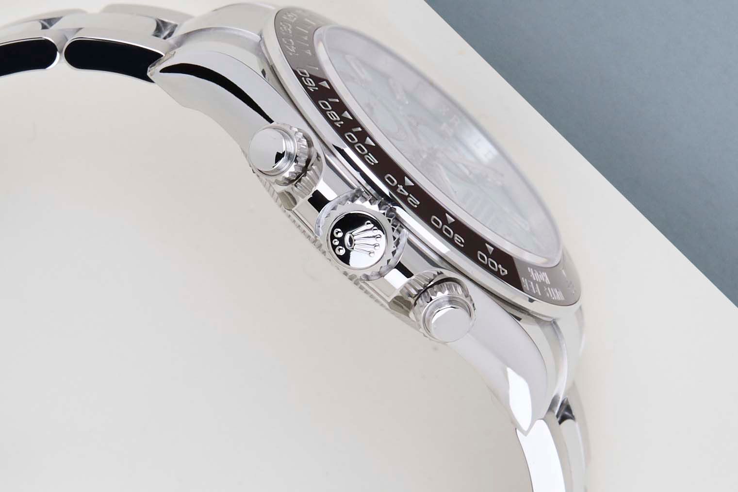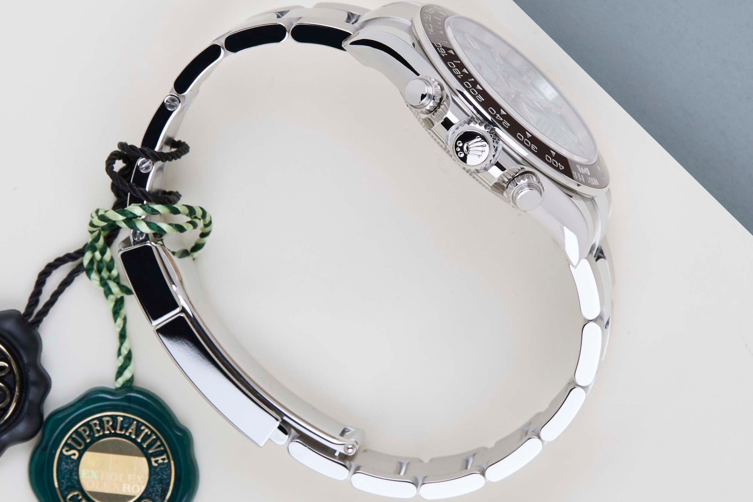 Diese außergewöhnliche Rolex Daytona ist Neu & Ungetragen und wird mit der originalen Rolex Garantiekarte und Box geliefert. Darüber hinaus hat die Uhr noch eine internationale Rolex Garantie bis April 2031.