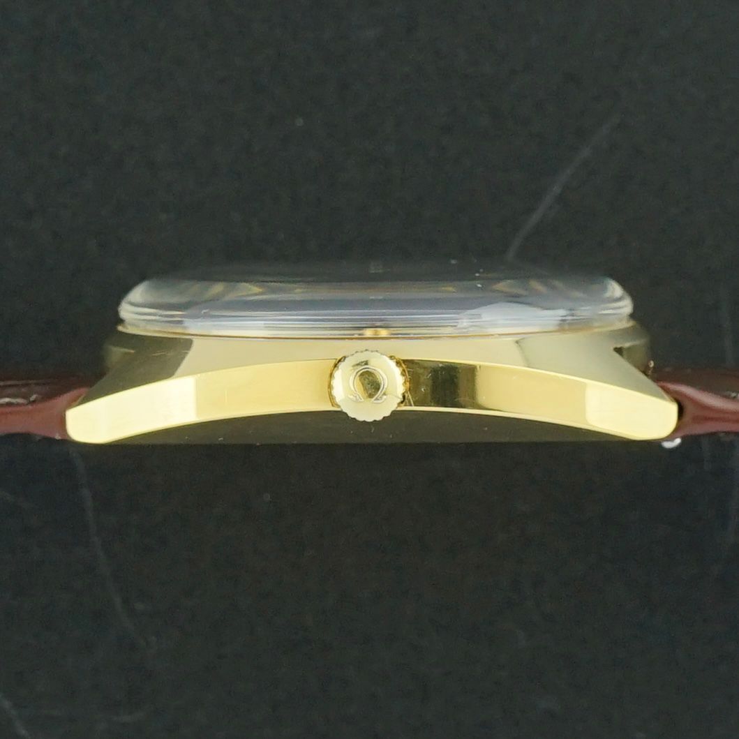 A Vintage Omega Seamaster Cosmic from 1969 featuring a 35mm gold plated case in beautiful condition. The white dial has a vertically brushed finish with a refined crosshair motif and is in perfect shape, complemented by elegant golden accents. Powered by a caliber 565 automatic movement, serviced in April 2026 and now running and functioning excellently. Paired with a top grain brown leather strap with crocodile motif, the overall condition of this piece is beautiful, making it an excellent choice for any collection.Year of production: 1969