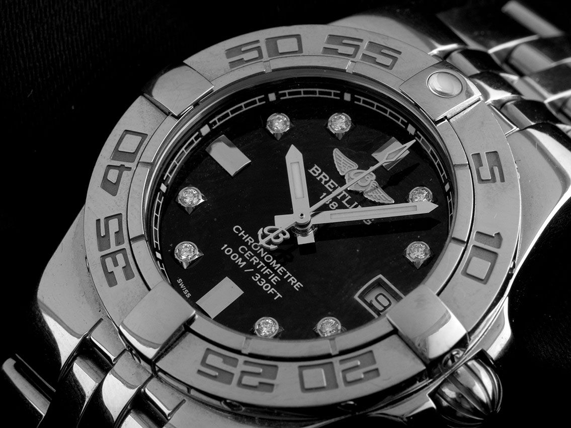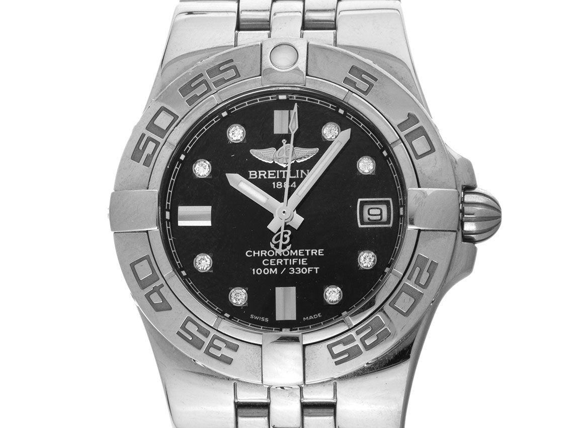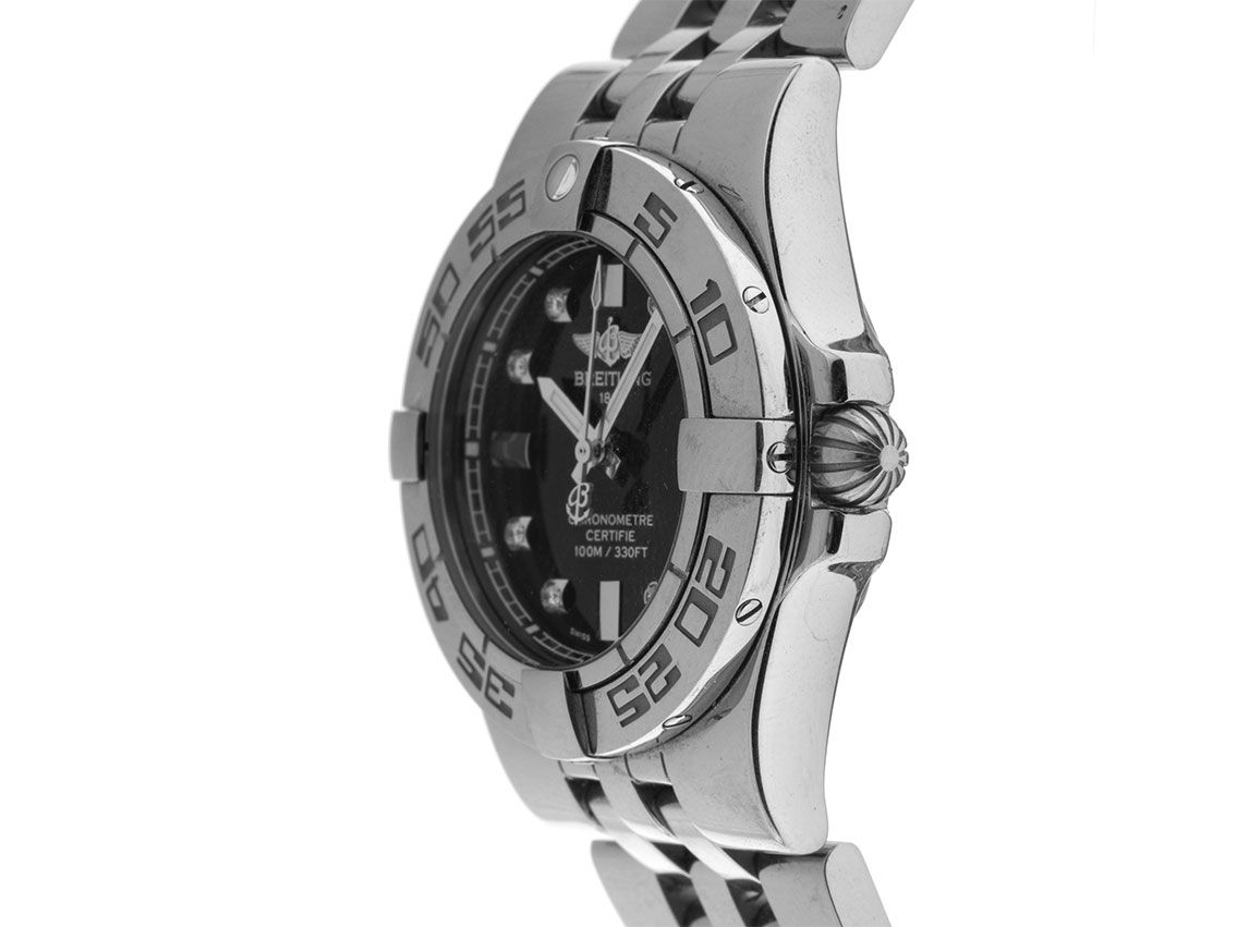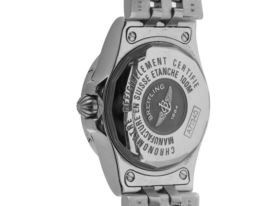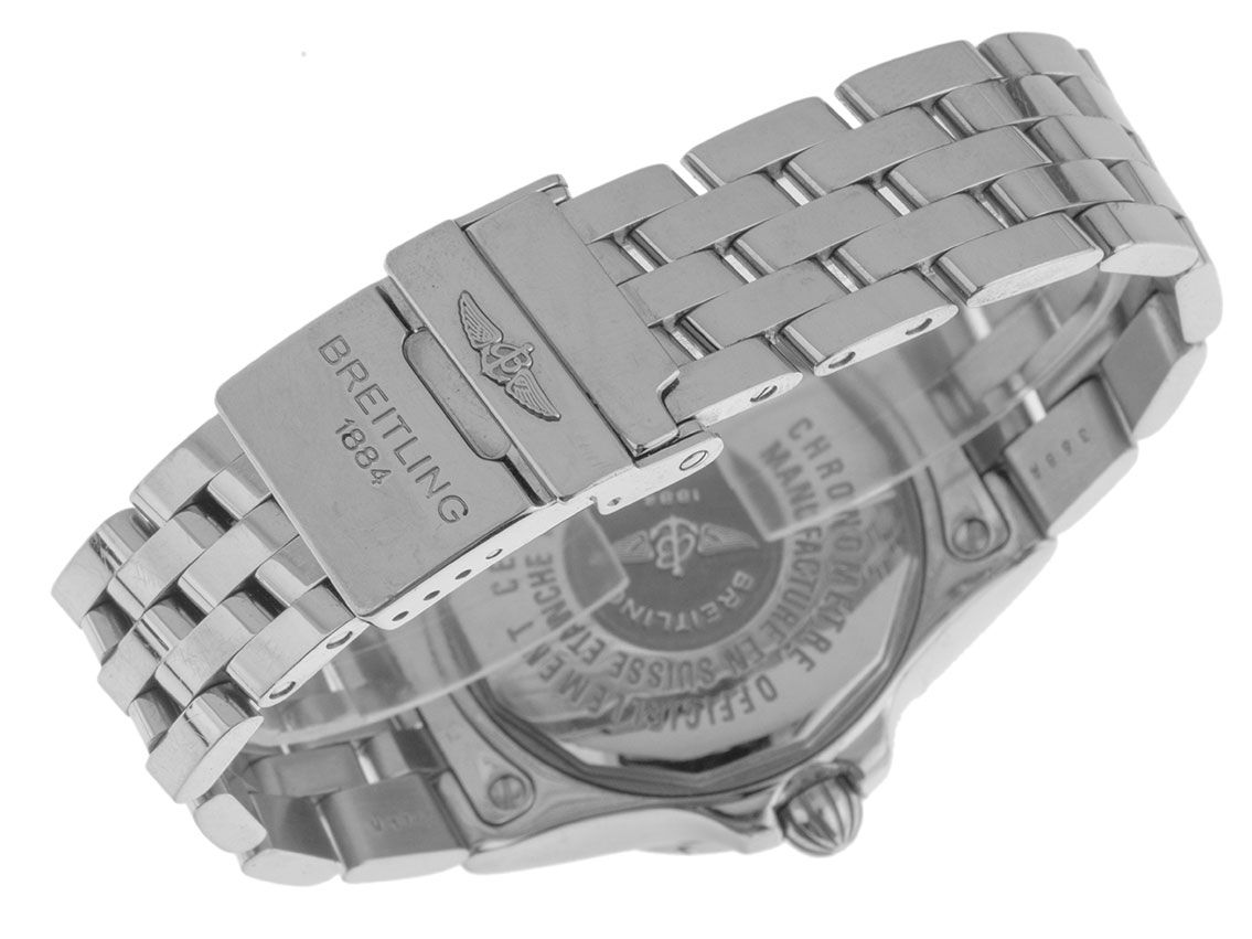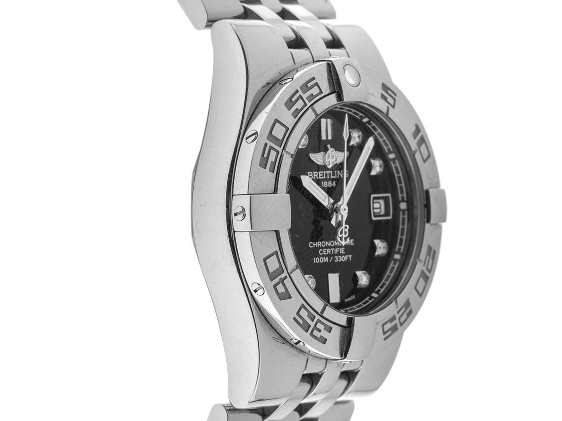 Gehäuse aus poliertem Edelstahl, Gehäusedurchmesser ohne Krone 30mm, Gehäusehöhe 12,1mm. Lünette aus poliertem Edelstahl mit Reitern, 60-Minuten Skala und Leuchtpunkt, einseitig drehbar. Armband aus poliertem und satiniertem Edelstahl, Sicherheitsfaltschließe aus Edelstahl mit Hersteller-Logo. Zifferblatt schwarz mit 8 Diamantindexen sowie Edelstahl-Indexen und polierten Edelstahlzeigern. Uhrwerk quarzgesteuert, Kaliber SF1 mit 7 Edelsteinen. Anzeige von Stunde, Minute und Sekunde über Zeiger aus der Mitte mit Sekundenstopp zur sekundengenauen Einstellung der Uhrzeit, Datumsanzeige mit Schnellverstellung bei 3 Uhr. Saphirglas kratzfest und gewölbt. Geriffelte Krone mit Flankenschutz. Boden aus Edelstahl verschraubt und graviert. Gewicht der Uhr inklusive Armband 91g, Länge des Armbandes inklusive Gehäuse 160mm. Referenznummer: A71340, Gehäusenummer: 1253XXX, ID: P291734000426HW-5900, Artikelnummer: 10000085673. Mit Gangkontrolle, neuer Batterie und kompletter äußerlicher Aufarbeitung von April 2026. Original Breitling Box mit Umkarton und Garantieunterlagen von Juli 2012 sowie Beschreibung, Erstkaufrechnung und Watchregister-Auszug von April 2026, The Watch Register Zertifikat / ohne Eintrag (Internationale Datenbank für verlorene oder gestohlene Uhren), Full Set. Superschnäppchen, sehr seltenes Sammlerstück, fast nicht getragen. Sehr guter Zustand. Lieferzeit sofort.