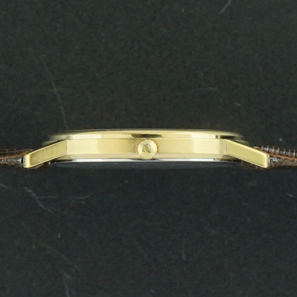 A Vintage Omega Seamaster Quartz from 1982 with a 32,5mm gold plated case, retaining its original polish throughout with barely any signs of wear. The golden dial is in great condition and complements the overall appearance beautifully. Powered by a caliber 1432 quartz movement that was overhauled in April 2026, now running and functioning well. It is important to note that setting the time may not always move the hands easily, however it is fully possible and once set it will keep accurate time consistently until the battery requires replacement. Overall condition is great and the watch is paired with a brown leather strap featuring a lizard motif.Year of production: 1982