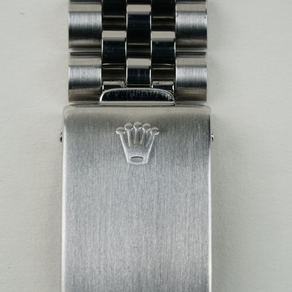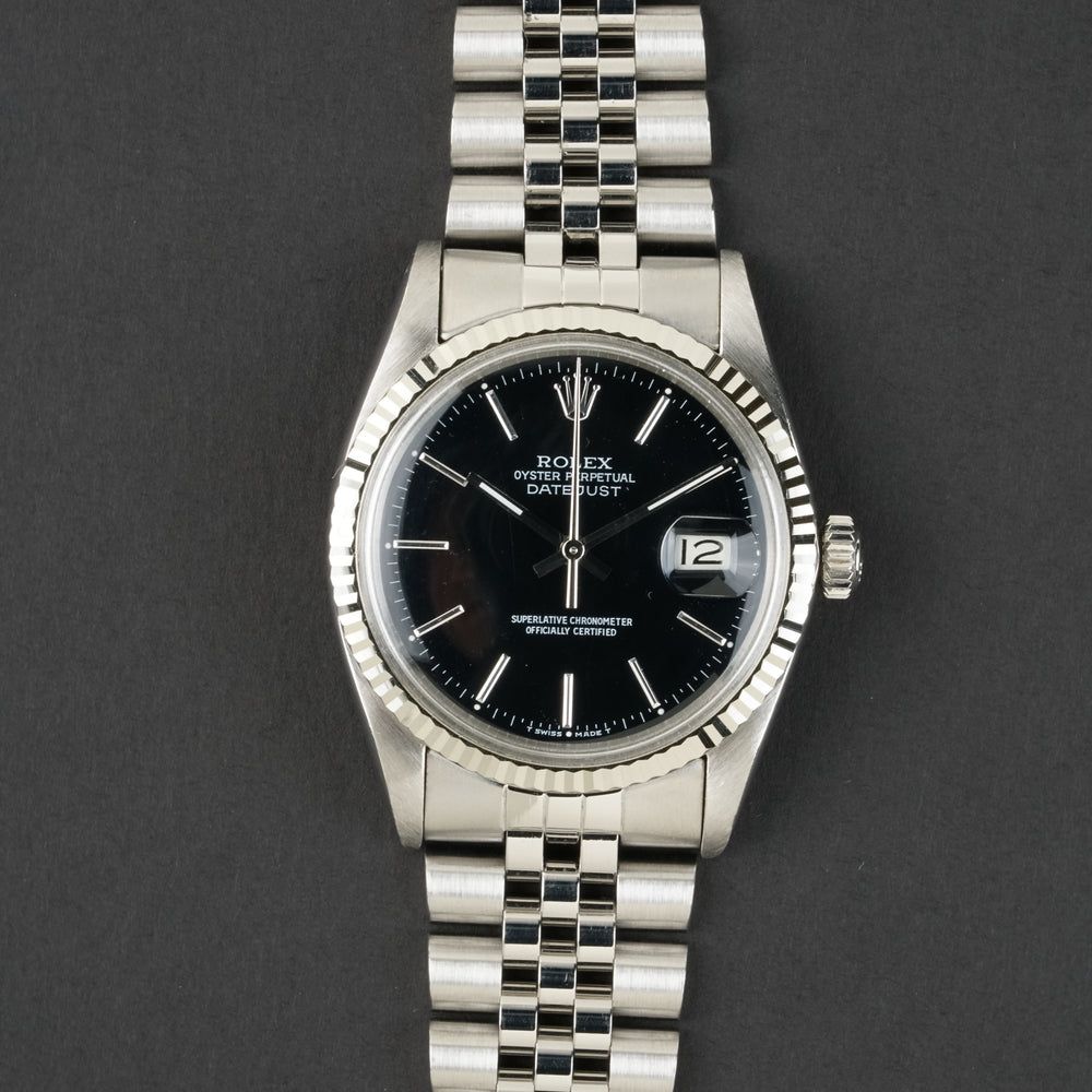Die Rolex Datejust (Ref. 16014) ist ein Meisterwerk zurückhaltender Eleganz. Während die meisten Datejusts durch Gold glänzen, wählt diese Ausführung die kühle, elegante Kombination aus Edelstahl und einer 18k weißen goldenen gekerbten (fluted) Lünette. Mit schwarzer Zifferblatt. Unter dem klassischen Plexiglas tickt das zuverlässige Rolex Kaliber 3035. Dies war das erste Datejust-Uhrwerk mit der revolutionären "Quickset"-Datumsfunktion, die es ermöglicht, das Datum mit einem einfachen Dreh an der Krone einzustellen, ohne die Zeit verstellen zu müssen. Das macht die 16014 zur idealen "Vintage"-Rolex für diejenigen, die den klassischen Charme suchen, aber nicht die Unannehmlichkeiten eines alten Uhrwerks. Mit seinem 36 mm Gehäuse und dem ikonischen Stahl-Jubilee-Armband ist diese Uhr die Definition von Vielseitigkeit. Dieses Exemplar befindet sich in einem ausgezeichneten Zustand, wobei das Zifferblatt und die Zeiger ihren ursprünglichen, klaren Kontrast beibehalten haben. Für den Sammler, der auf der Suche nach einer Datejust 16014 ist.