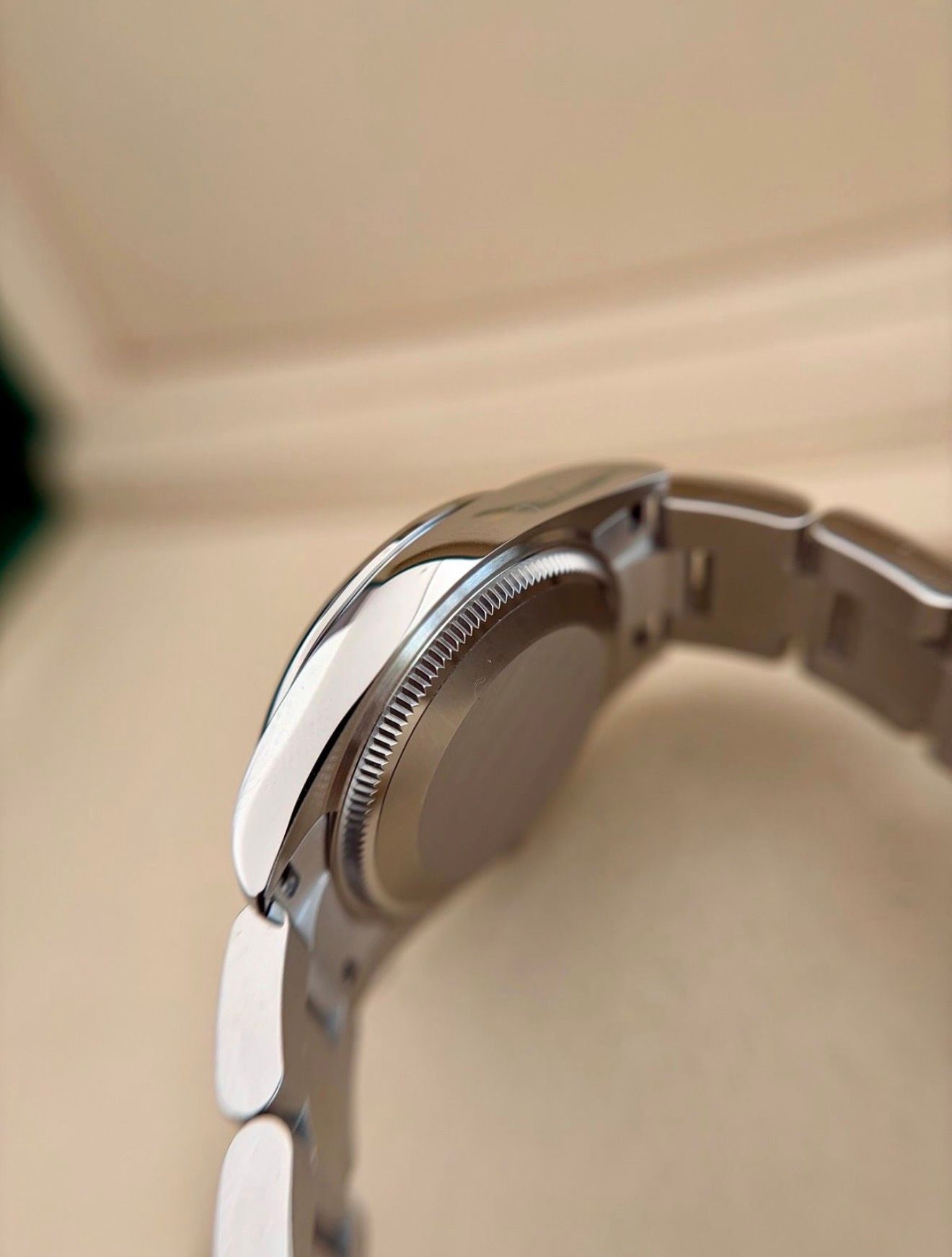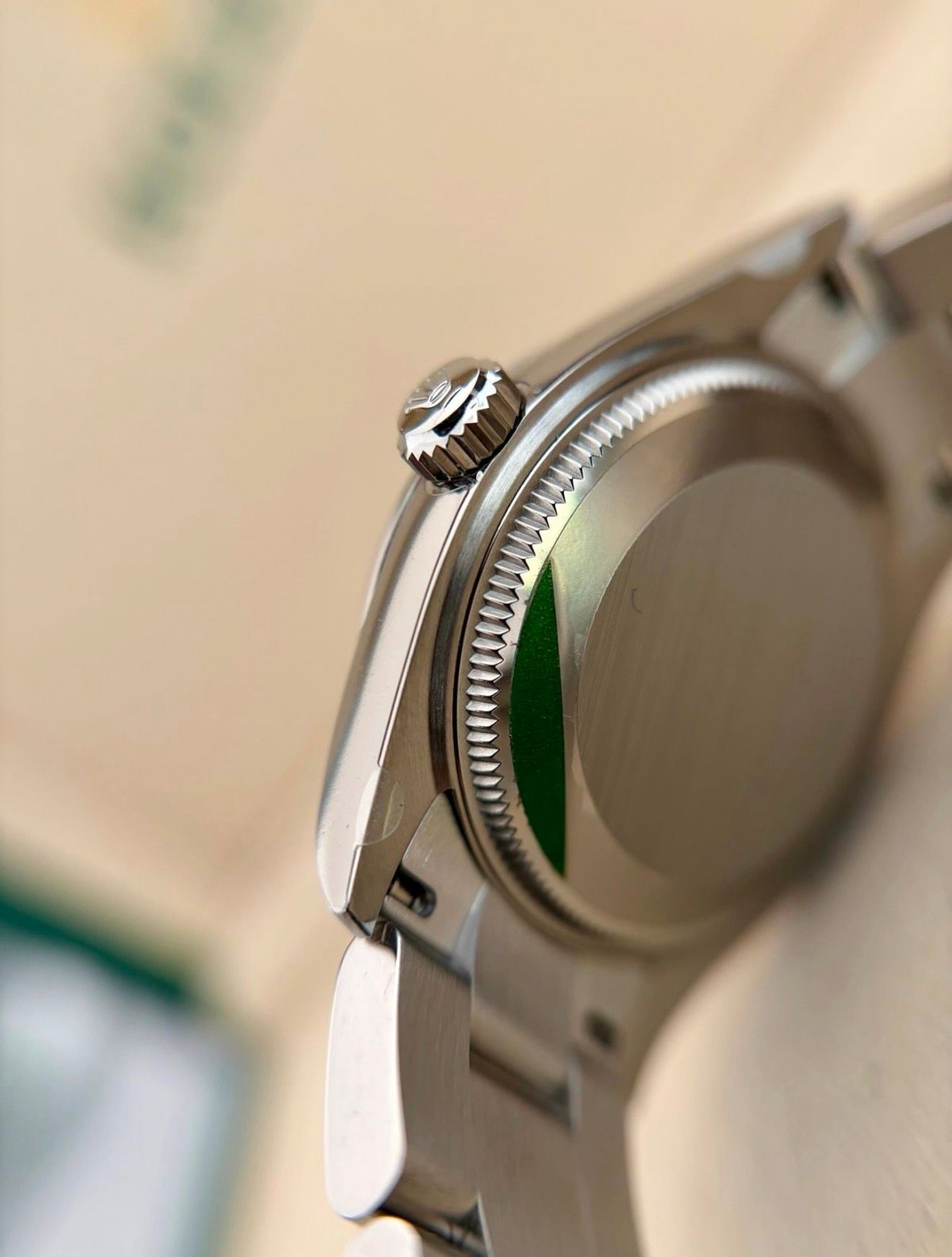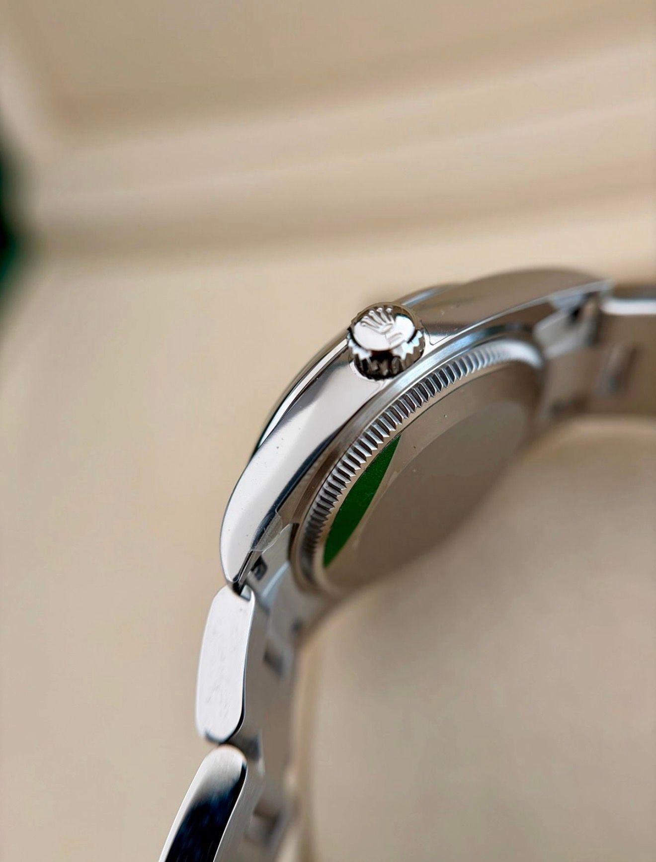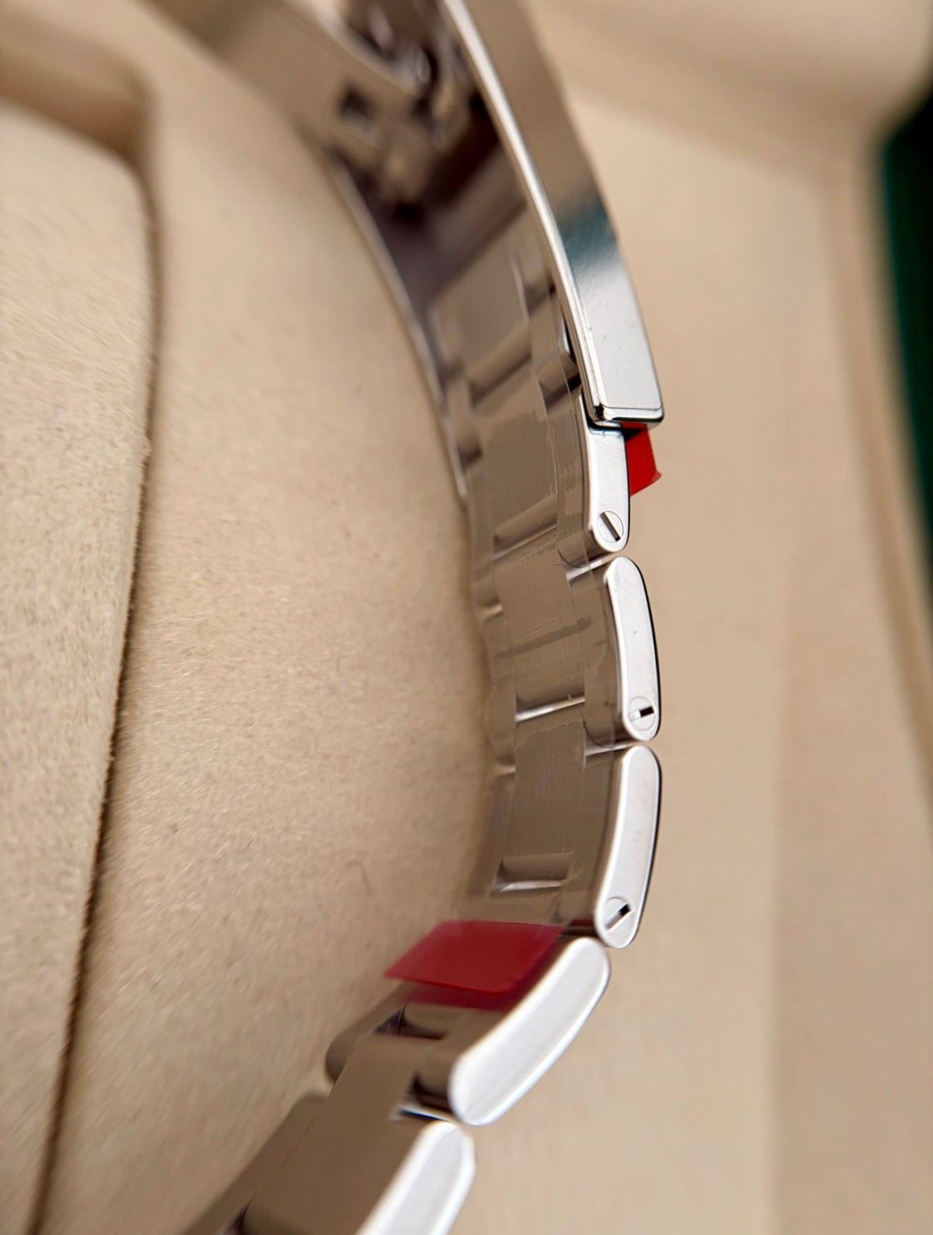 - Leichte Gebrauchsspuren wie feine Kratzer oder kleine Oberflächenkratzer. Gehäuse, Lünette und Armband behalten ihre scharfen Kanten und die ursprüngliche Form. Kann professionell poliert worden sein, ohne die originalen Konturen zu verändern. Mechanisch voll funktionsfähig.