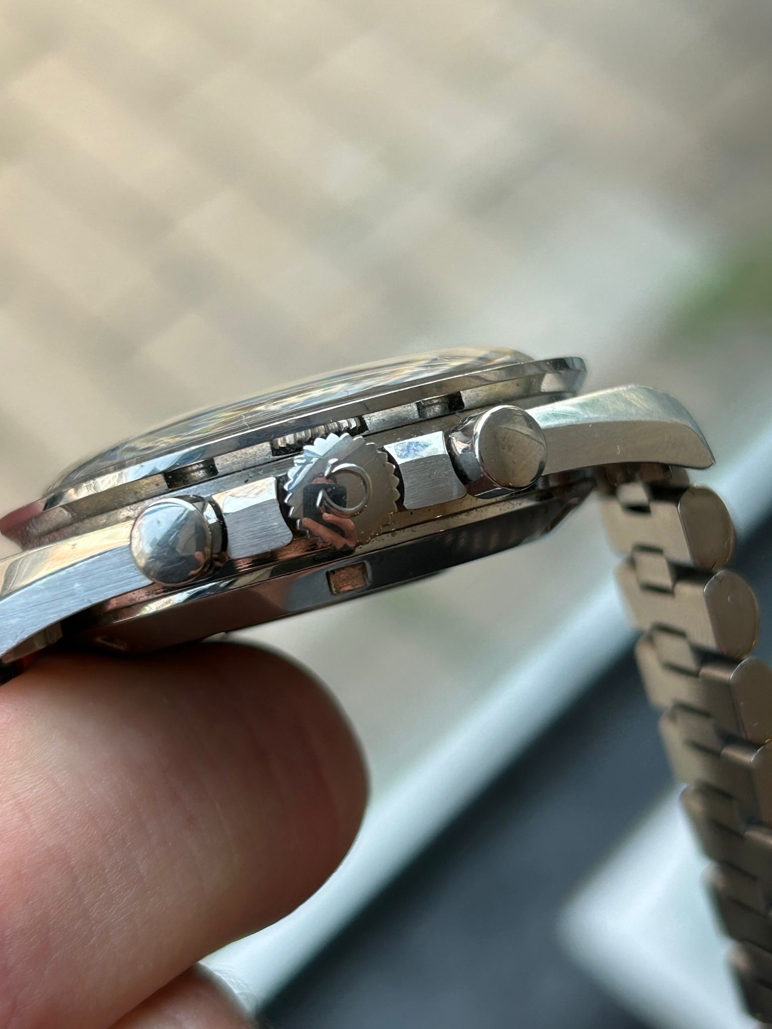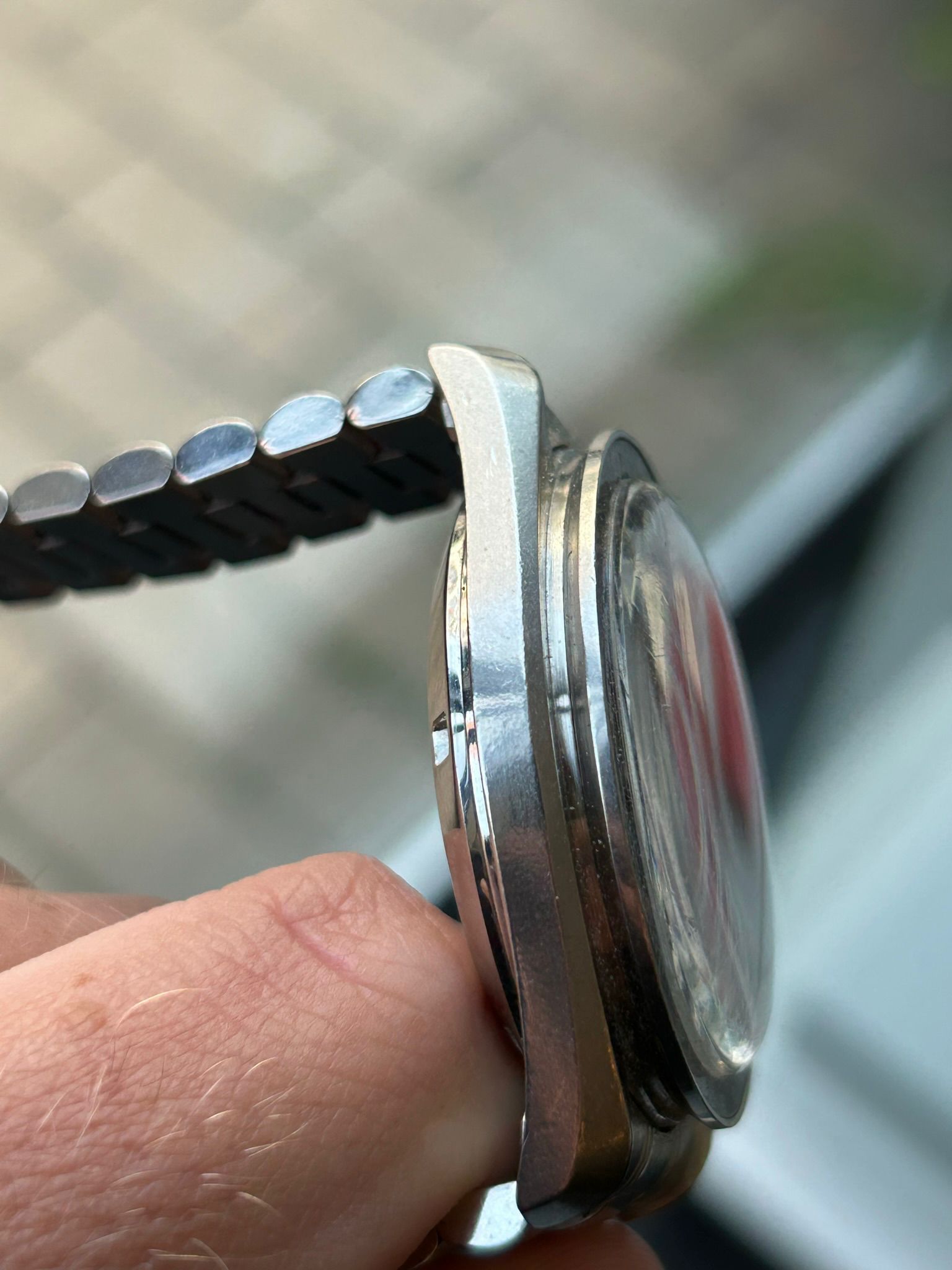 - Sichtbare Gebrauchsspuren wie Kratzer, kleine Dellen oder leichtes Spiel im Armband. Kann professionell poliert worden sein. Mechanisch voll funktionsfähig.