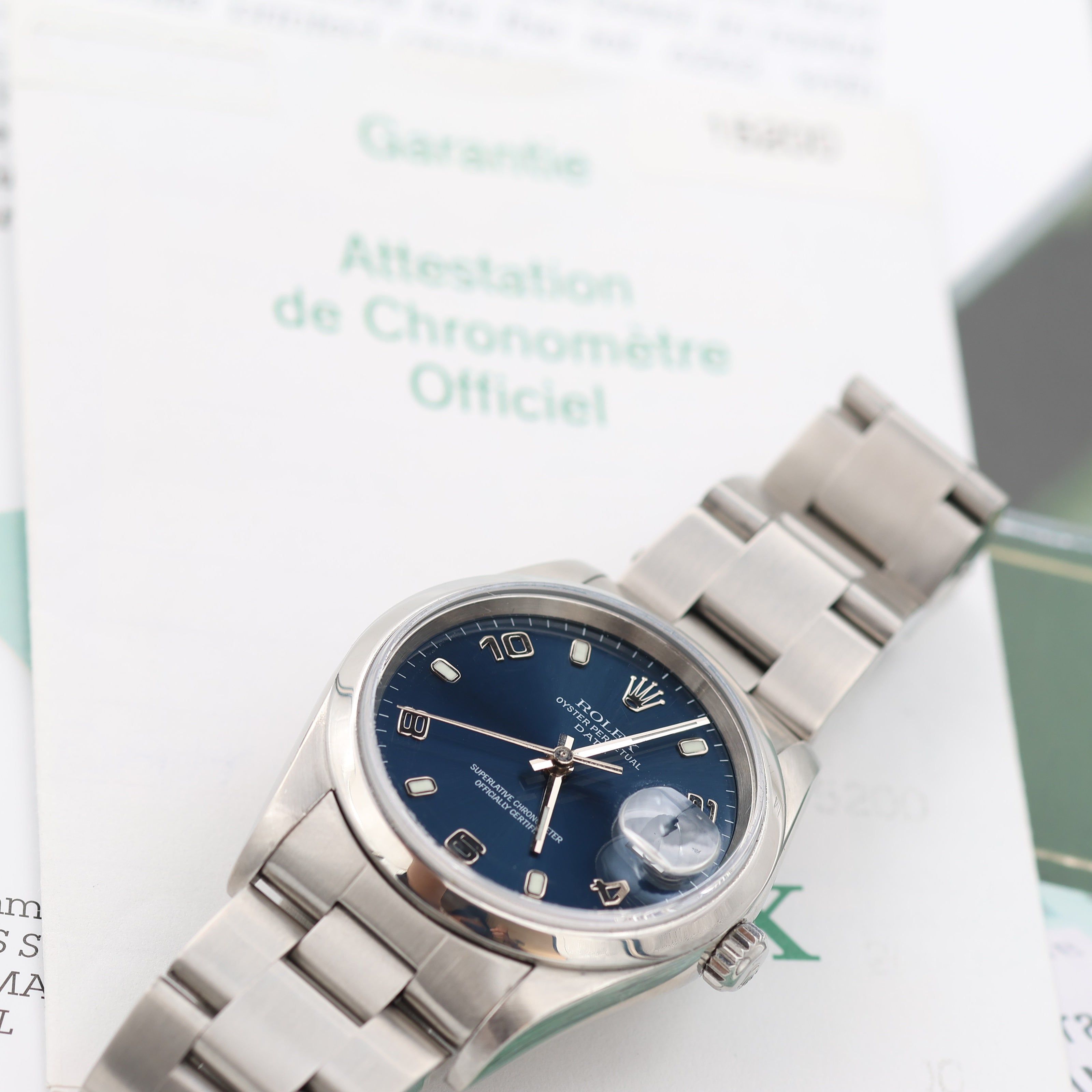 Zu verkaufen: gebrauchte Rolex Date ref. 15200, komplett mit Originalpapieren und -box und Oyster-Armband.Die Ref. 15200 ist eine Uhr aus reinem Edelstahl mit einer glatten, polierten Lünette, die ihr einen attraktiven, minimalistischen Rahmen verleiht. Diese Rolex Date hat ein blaues Zifferblatt mit abwechselnden arabischen Zahlen. Diese Rolex kann als Unisex-Uhr betrachtet werden: Heutzutage könnte man diese Größe als Frauenuhr ansehen, aber die 34 mm Größe ist so klassisch wie sie nur sein kann und passt zu jedem Stil.Ein bisschen von ihrer Geschichte: Die Modelle Date und Datejust von Rolex sind so eng miteinander verwandt, wie es die Namen vermuten lassen, denn sie haben das gleiche Design und die gleiche Funktionalität. Der Hauptunterschied liegt, wie schon von Anfang an, in den jeweiligen Größen. Während die Datejust ursprünglich eine 36-mm-Uhr war (und die Serie jetzt 31 mm, 36 mm und 41 mm umfasst - mit einer 28-mm-Lady-Datejust), füllte die Date eine Lücke und wurde immer nur mit 34 mm gebaut. Die Rolex Date Ref 15200 ist eine der letzten Iterationen, bevor Rolex auf ein etwas dickeres Gehäuse mit kräftigeren Bandanstößen umgestiegen ist. MARKE ROLEX MODELL DATE OYSTER PERPETUAL REFERENCE 15200 GEHÄUSEMATERIAL STAHL WERK AUTOMATIK ABMESSUNG 34 MM ZIFFERBLATT BLAU ARABISCHE LÜNETTE STAHLGLAS SAPHIR ARMBAND TYP OYSTER ARMBAND MATERIAL STAHL ORIGINALVERPACKUNG JA ORIGINALPAPIERE JA JAHR CA. DIE 90er Jahre ZUSTAND SEHR GUT