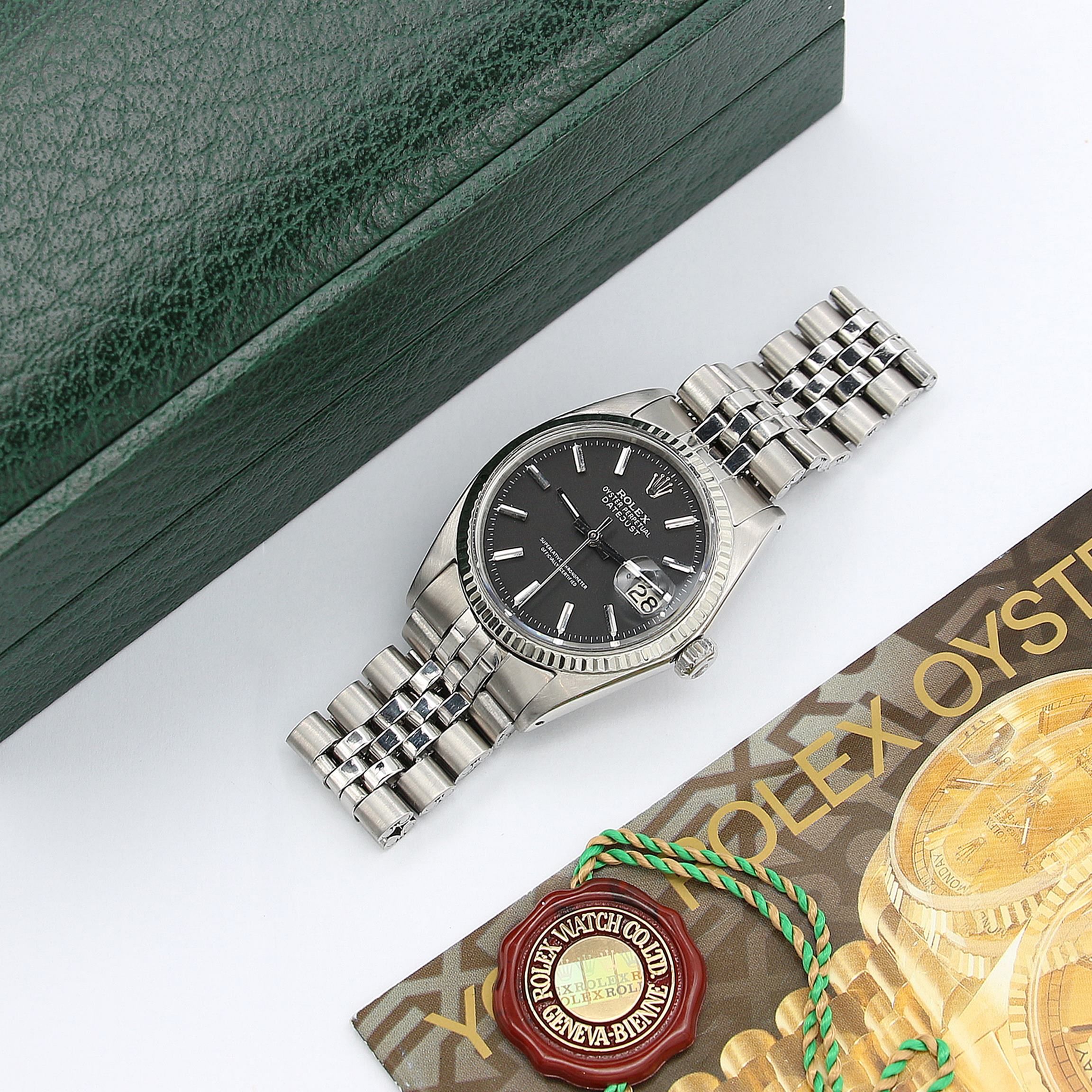 Zu verkaufen bei Debonar Watches: gebrauchte Rolex Datejust ref. 1601 in Stahl und Weißgold, mit einem modernen schwarzen, matten Zifferblatt und einem Jubilee-Armband.Die Rolex Datejust gilt als die "Uhr" schlechthin: Ihr Design hat sich in 60 Jahren kaum verändert und ist selbst Nicht-Fans ein vertrauter Anblick. Diese Rolex hat die typische Ästhetik einer Datejust, wie die geriffelte Lünette, die Stabindexe und die Cyclops-Lupe über dem Datumsfenster. MARKE ROLEX MODELL DATEJUST REFERENZ 1601 GEHÄUSEMATERIAL STAHL WERK AUTOMATIK ABMESSUNG 36 MM ZIFFERBLATT SCHWARZ MATTE LÜNETTE WEISSGOLD GLAS PLEXIGLAS ARMBANDTYP ARMBANDMATERIAL JUBILÄUMSARMBAND LÄNGE 17 CM ORIGINALVERPACKUNG KEINE ORIGINALPAPIERE KEIN JAHR CA. DIE 70er Jahre ZUSTAND GUT