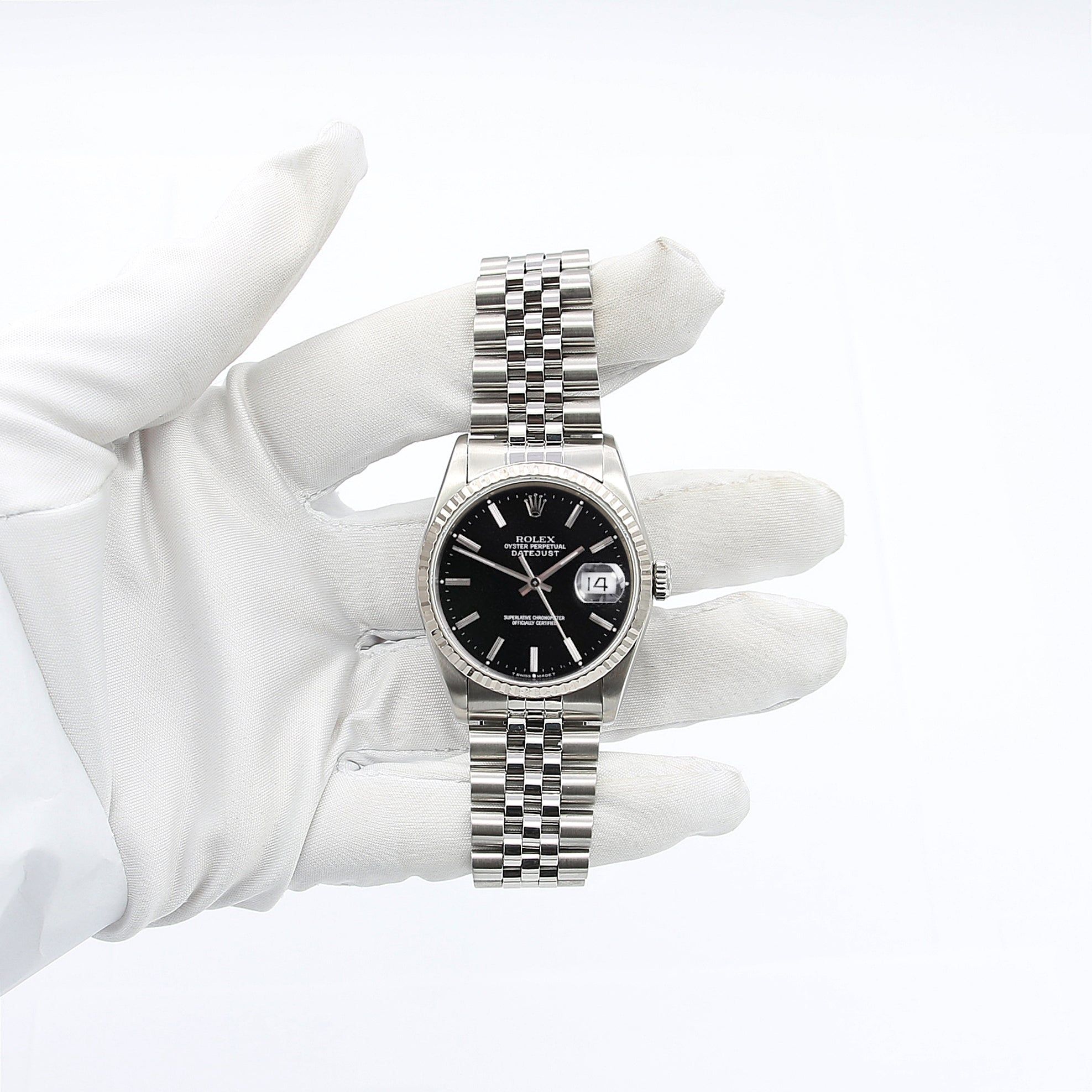 For sale at Debonar Watches: pre-owned Rolex Datejust ref. 16234 in steel and white gold, full set.The case of this model is the traditional Rolex “Oyster Case”, it is made of stainless steel and is water resistant to 10 ATM. The diameter is the “classic” 36mm typical of the Datejust of those years.The bezel is knurled and is made of white gold, a typical feature of this reference 16234 which contributes to increasing its prestige. Built on a Jubilee bracelet, this Datejust found represents the incarnation of the Rolex's design: elegant, simple and clean, a must.On the dial we find at 12 o'clock the words "ROLEX" - "OYSTER PERPETUAL" - "DATEJUST" and at 6 o'clock the classic writing "Superlative Chronometer Officially Certified".This piece is a Rolex Datejust Ref. 16234 with a black dial and date opening at 3 o'clock. BRAND ROLEX MODEL DATEJUST REFERENCE 16234 CASE MATERIAL STEEL MOVEMENT AUTOMATIC DIMENSION 36 MM DIAL BLACK BEZEL WHITE GOLD CRYSTAL SAPPHIRE BRACELET TYPE JUBILEE BRACELET MATERIAL STEEL ORIGINAL BOX YES ORIGINAL PAPERS YES YEAR APPROX. THE '90s CONDITION VERY GOOD