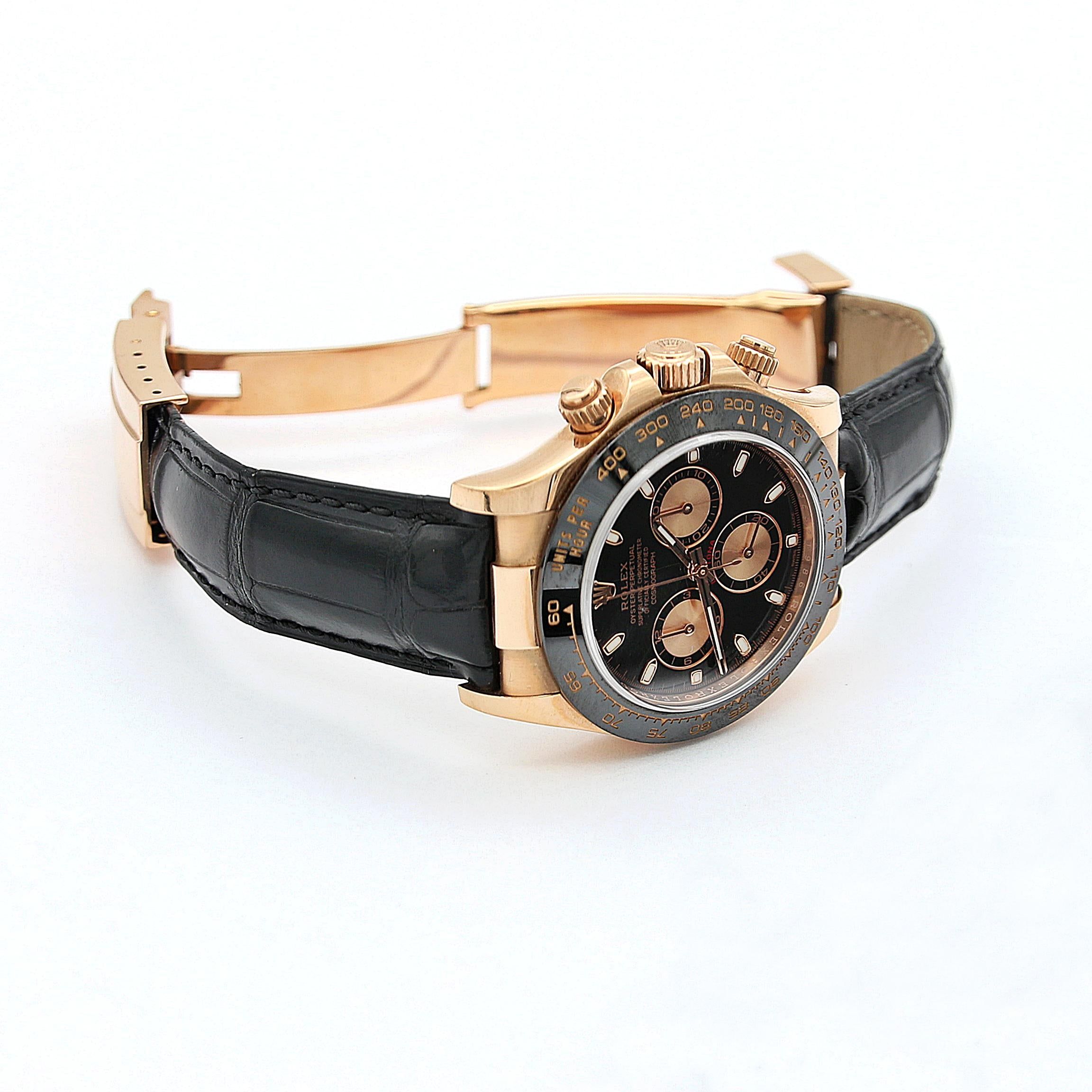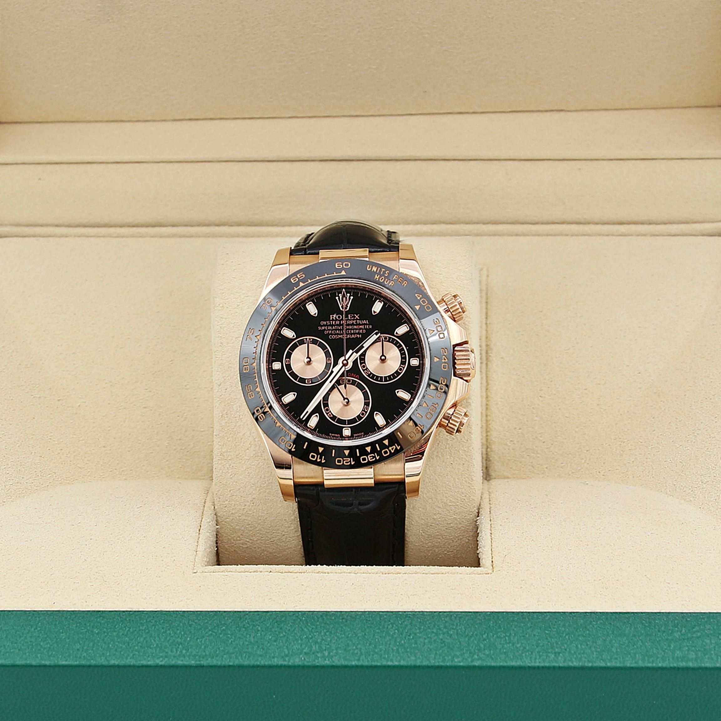For sale at Debonar Watches: pre-owned Rolex Daytona 116515 in excellent conditions, full set. The strap is an Oysterflex by Rubber B. This 18k gold watch case presents a deep black dial with pink subdials.The Daytona ref. 116515LN made its debut at Baselworld 2011 with its 40mm Oyster case in 18k rose gold that pairs impeccably well with the black ceramic bezel. A quick note on the gold and ceramic materials; these are not standard “off-the-shelf” varieties, but rather, Rolex-enhanced ones. The metal is the Rolex-exclusive rose gold alloy—aka Everose—which the brand claims will not fade over time. On the other hand, the Cerachrom ceramic bezel is yet another Rolex patent where the material is not only resistant to scratching but will also not fade even after decades of exposure to the sun. As with all versions of the Rolex Daytona, the ref. 116515LN includes an engraved tachymeter on the bezel—an integral component to the chronograph function. This scale, in conjunction with the chronograph, permits the wearer to measure 400 units (whether kilometers or miles) per hour. This is what ultimately makes the Daytona Cosmograph a racecar driver’s watch. BRAND ROLEX MODEL DAYTONA REFERENCE 116515LN CASE MATERIAL PINK GOLD MOVEMENT AUTOMATIC DIMENSION 40 MM DIAL BLACK WITH PINK SUBDIALS BEZEL CERAMIC CRYSTAL SAPPHIRE BRACELET TYPE STRAP BRACELET MATERIAL RUBBER BRACELET LENGHT 17 CM ORIGINAL BOX YES ORIGINAL PAPERS YES YEAR 2016 CONDITION EXCELLENT