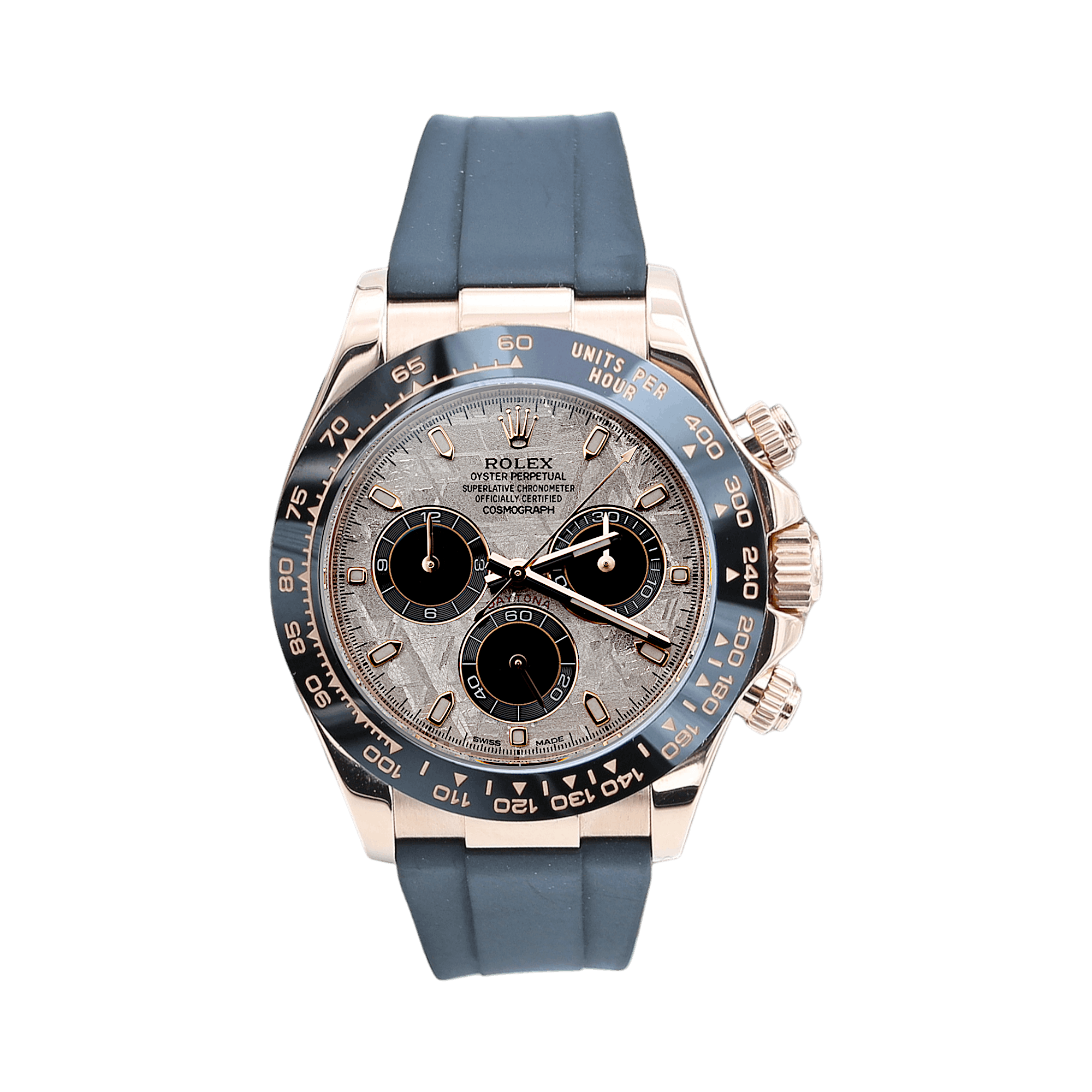 For sale at Debonar Watches: pre-owned Rolex Daytona 116515 in excellent conditions, full set. The strap is an Oysterflex by Rubber B. This 18k gold watch case presents a remarkable Meteorite dial. Crafted from an actual piece of meteorite, this dial showcases the intricate patterns and distinctive markings that can only be found on such a rare material.ts captivating beauty holds the mesmerizing story of its journey through space, making it a true conversation starter.The Daytona ref. 116515LN made its debut at Baselworld 2011 with its 40mm Oyster case in 18k rose gold that pairs impeccably well with the black ceramic bezel. A quick note on the gold and ceramic materials; these are not standard “off-the-shelf” varieties, but rather, Rolex-enhanced ones. The metal is the Rolex-exclusive rose gold alloy—aka Everose—which the brand claims will not fade over time. On the other hand, the Cerachrom ceramic bezel is yet another Rolex patent where the material is not only resistant to scratching but will also not fade even after decades of exposure to the sun. As with all versions of the Rolex Daytona, the ref. 116515LN includes an engraved tachymeter on the bezel—an integral component to the chronograph function. This scale, in conjunction with the chronograph, permits the wearer to measure 400 units (whether kilometers or miles) per hour. This is what ultimately makes the Daytona Cosmograph a racecar driver’s watch. BRAND ROLEX MODEL DAYTONA REFERENCE 116515LN CASE MATERIAL PINK GOLD MOVEMENT AUTOMATIC DIMENSION 40 MM DIAL CHOCOLATE WITH BLACK SUBDIALS BEZEL CERAMIC CRYSTAL SAPPHIRE BRACELET TYPE STRAP BRACELET MATERIAL RUBBER BRACELET LENGHT 17 CM ORIGINAL BOX YES ORIGINAL PAPERS YES YEAR 2016 CONDITION EXCELLENT